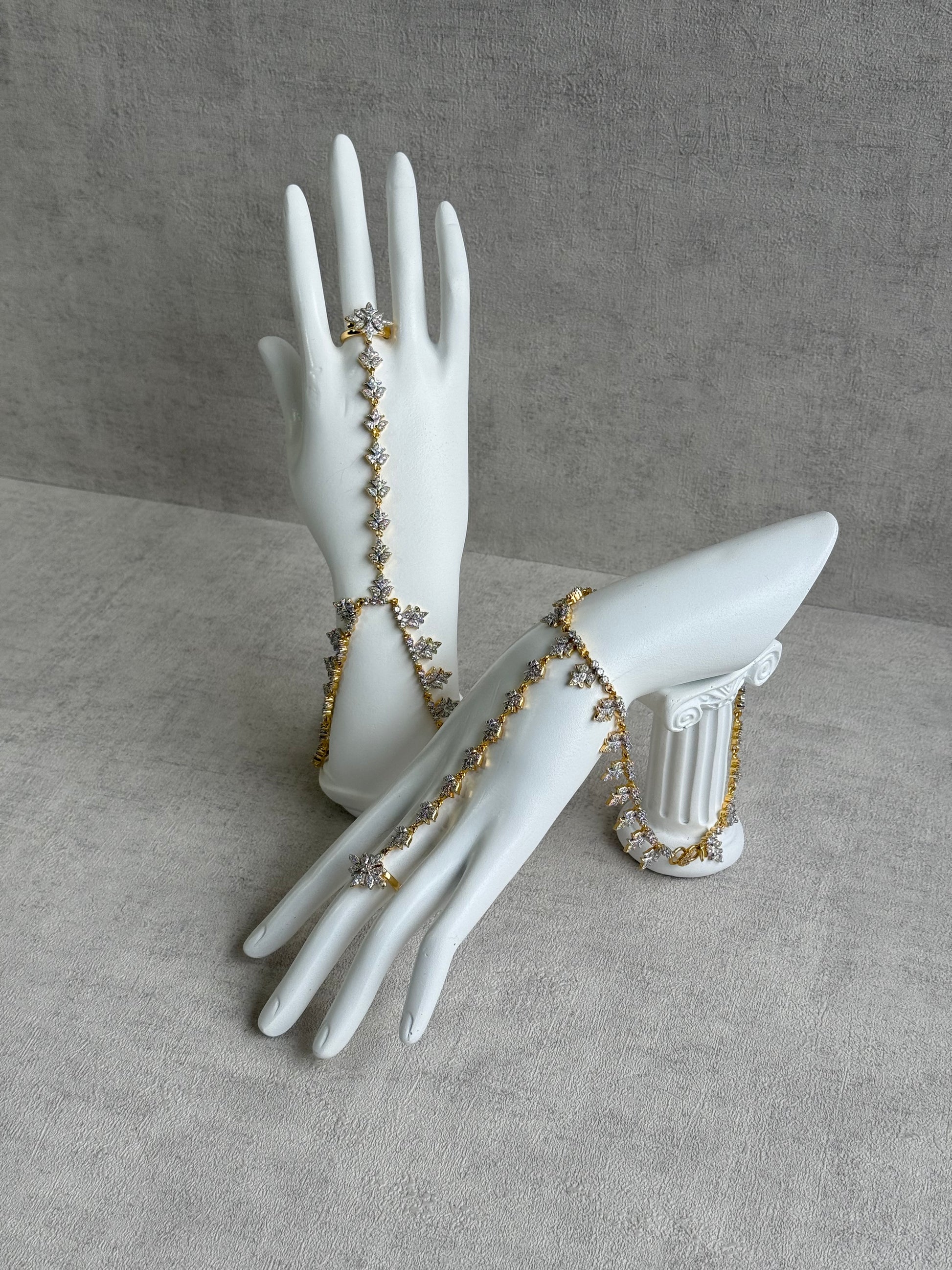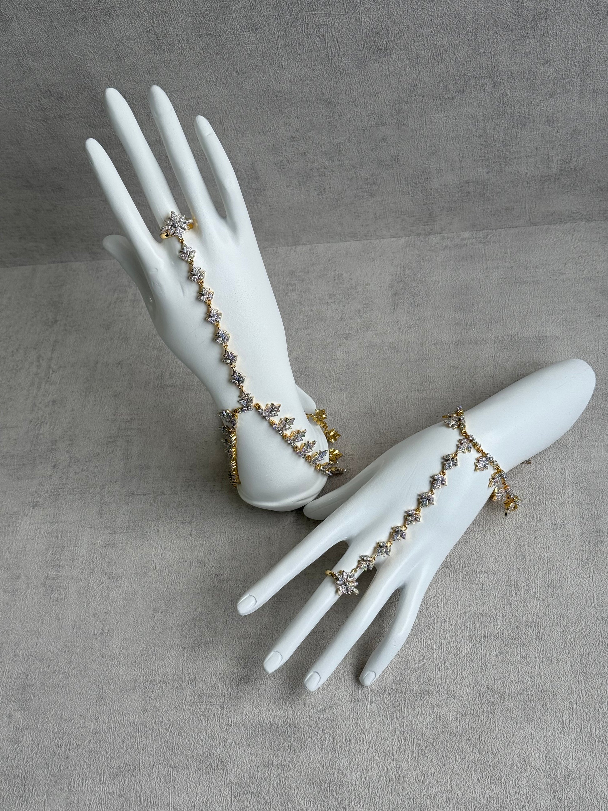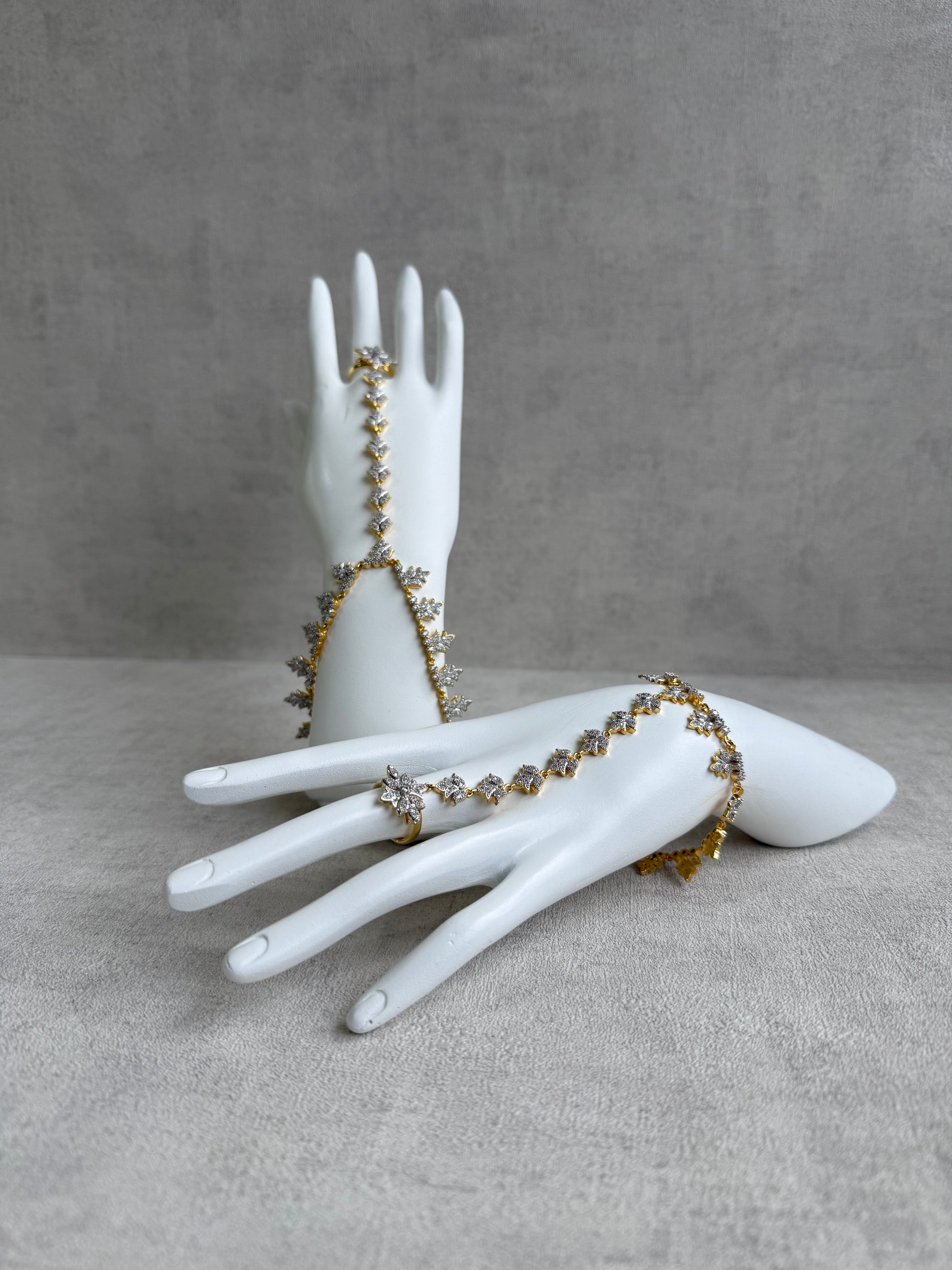 The Ayura Designs Aagya Haathphool – Set of 2 Gold & Silver Ring-Bracelet Chains with Floral Diamond-Cut Detailing captures the timeless charm of traditional jewellery with a contemporary, refined touch. Each piece features a stunning trail of floral motifs encrusted with diamond-cut stones that glimmer beautifully against a dual-tone base of gold and silver. The design elegantly links a statement floral ring to a matching bracelet, tracing a delicate line of sparkle across the hand.