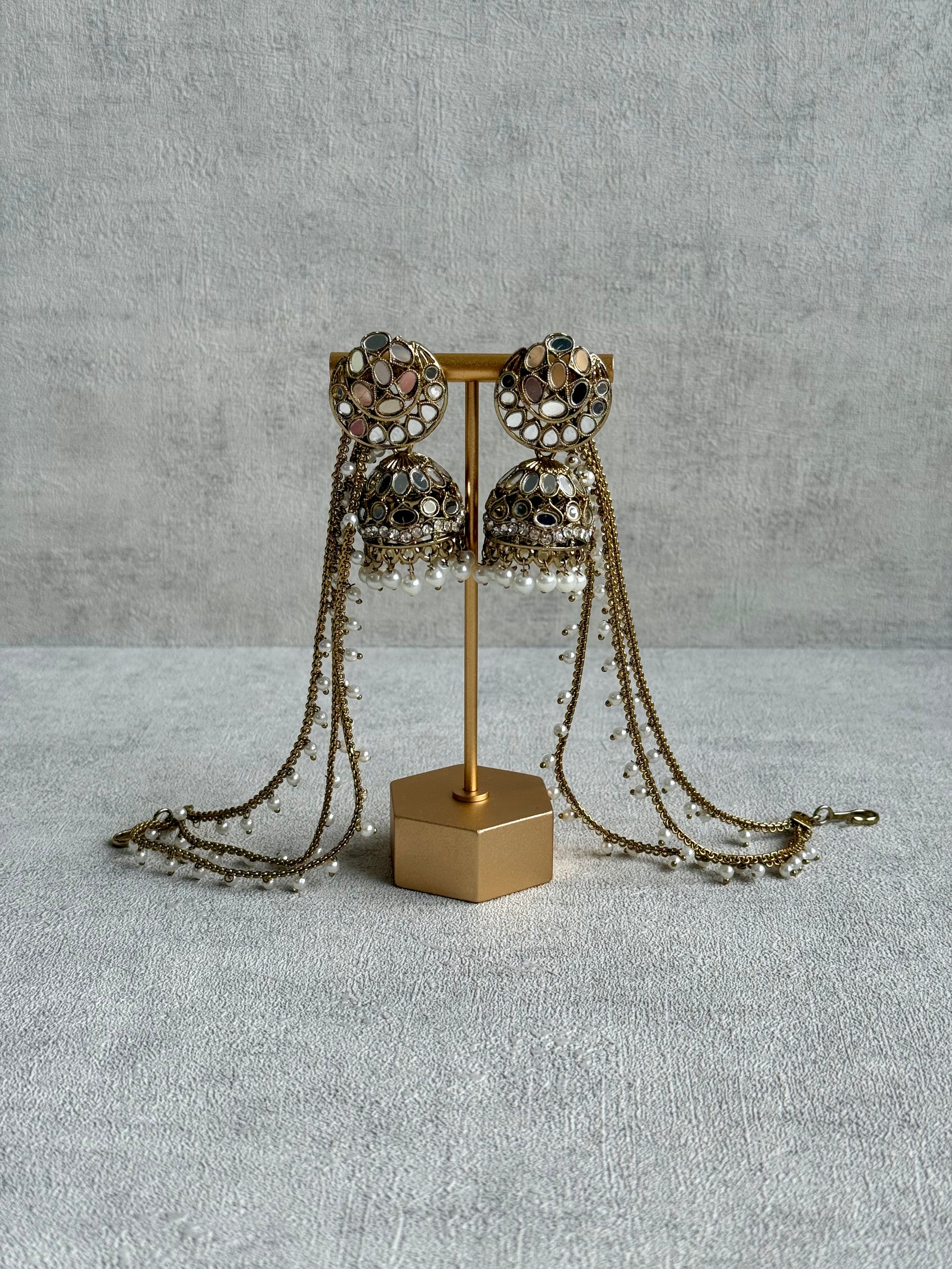 The Ayura Designs Aaina Jhumkis – Antique Gold Mirror-Cut Dome Earrings with Detachable Pearl Sahare capture the essence of timeless radiance and versatility. Crafted with meticulous attention to detail, each jhumki shimmers with an intricate lattice of mirror-cut stones that reflect light with every turn, giving the piece its signature brilliance and charm.