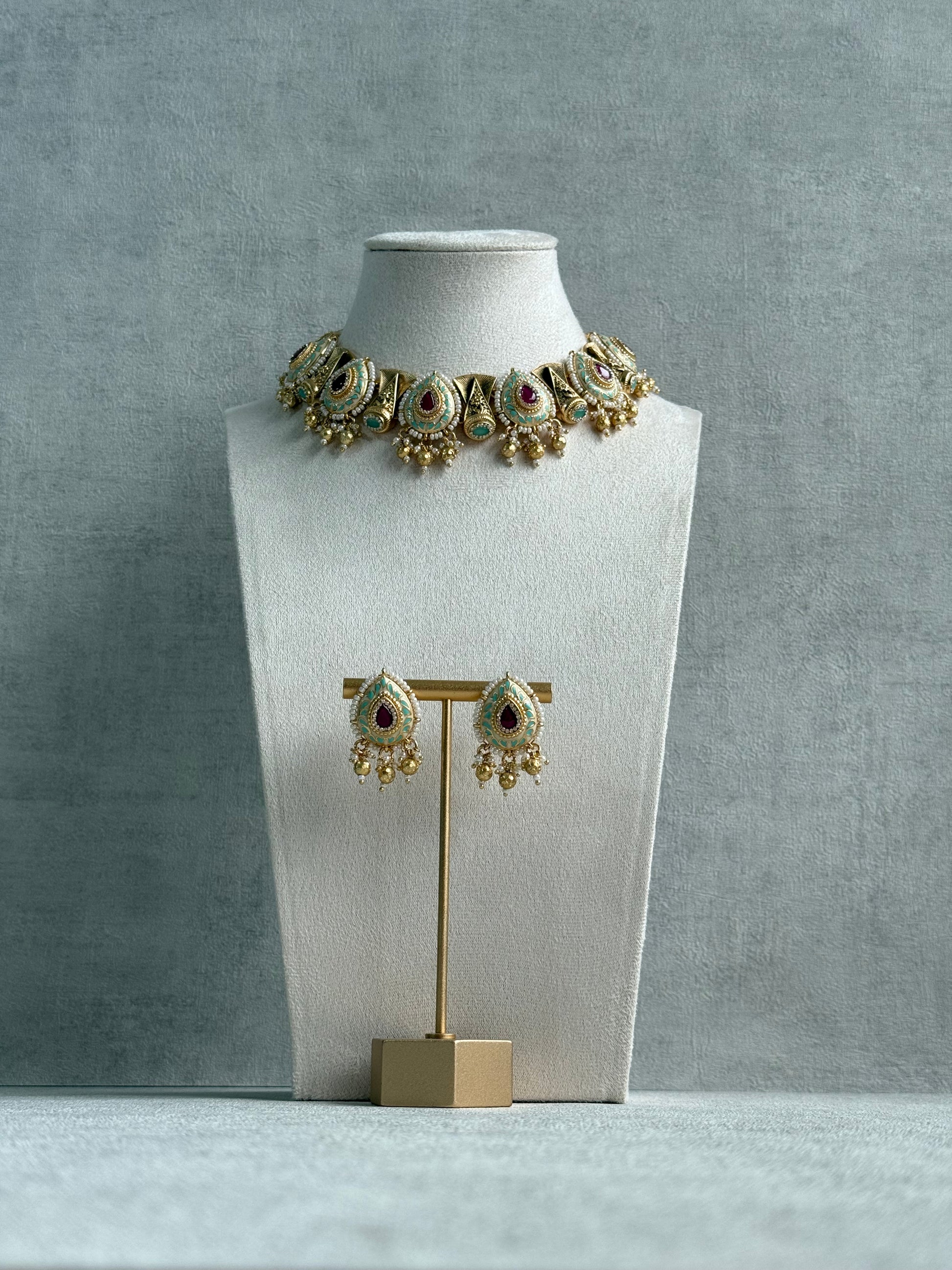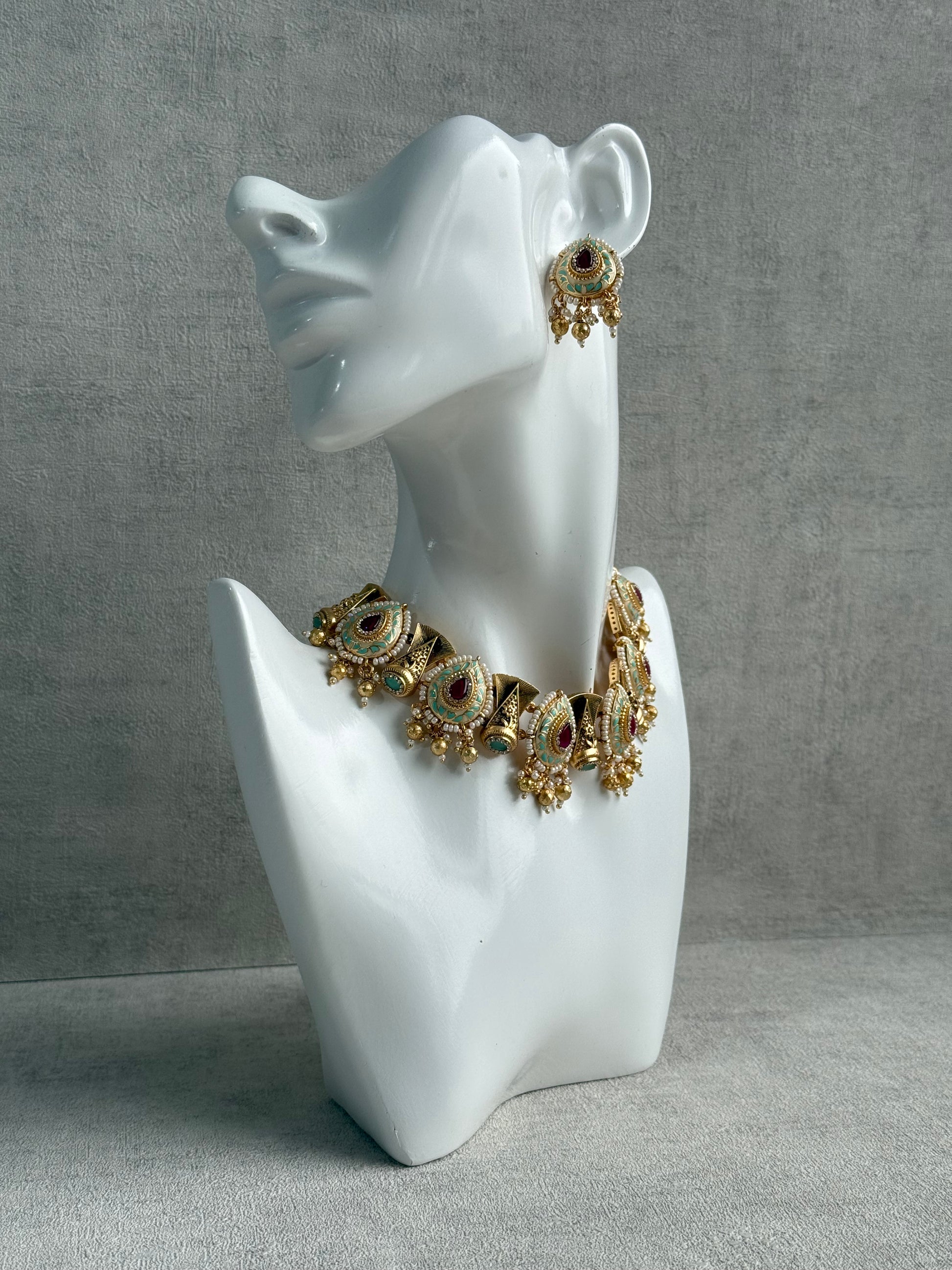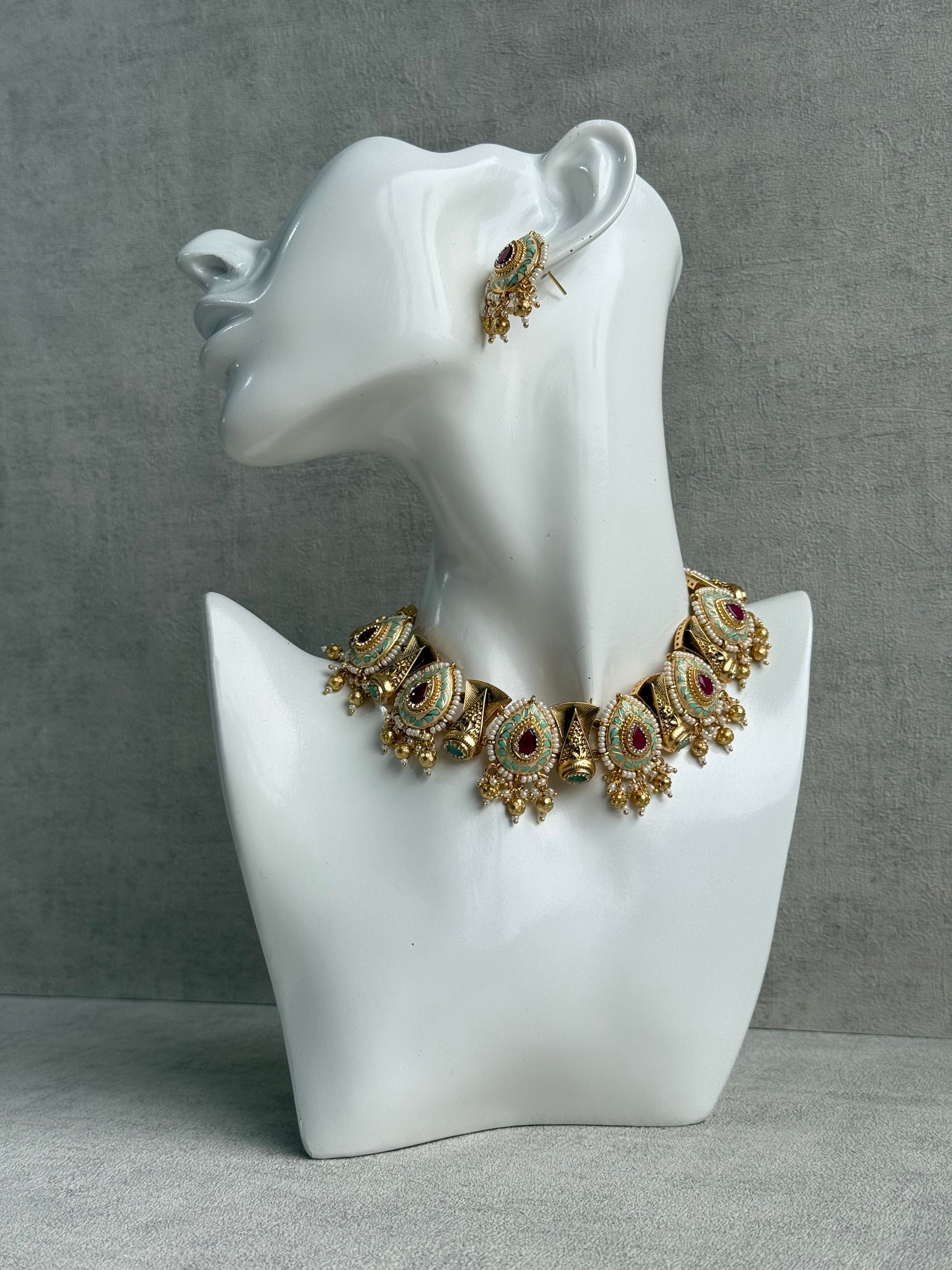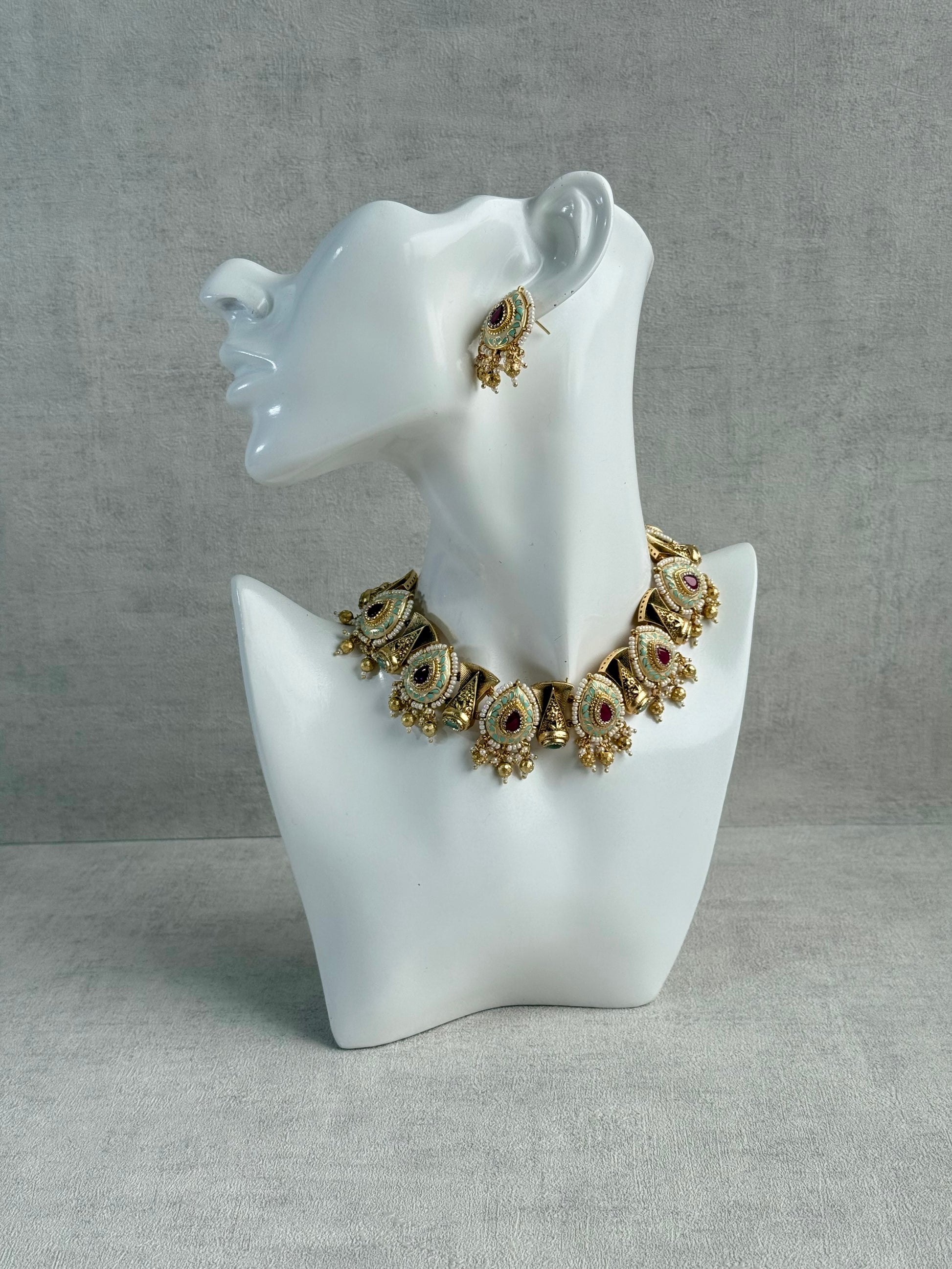 Designed to sit elegantly along the neckline, the necklace showcases a repeating pattern of teardrop motifs and gold cones, creating movement and balance. The mint and pink colour pairing is vibrant yet graceful, offering the perfect blend of playfulness and heritage — ideal for spring weddings, mehndis, or festive events.