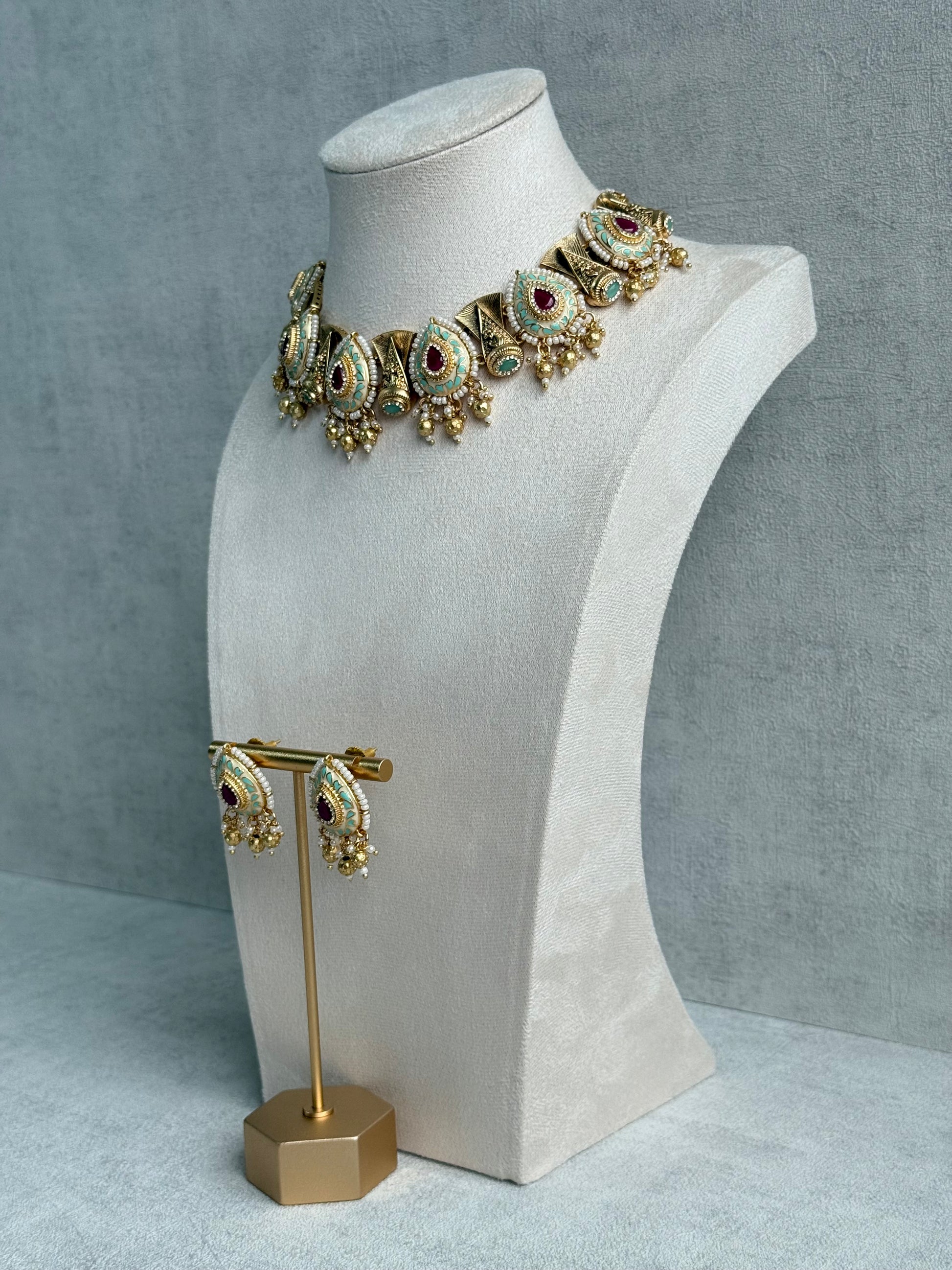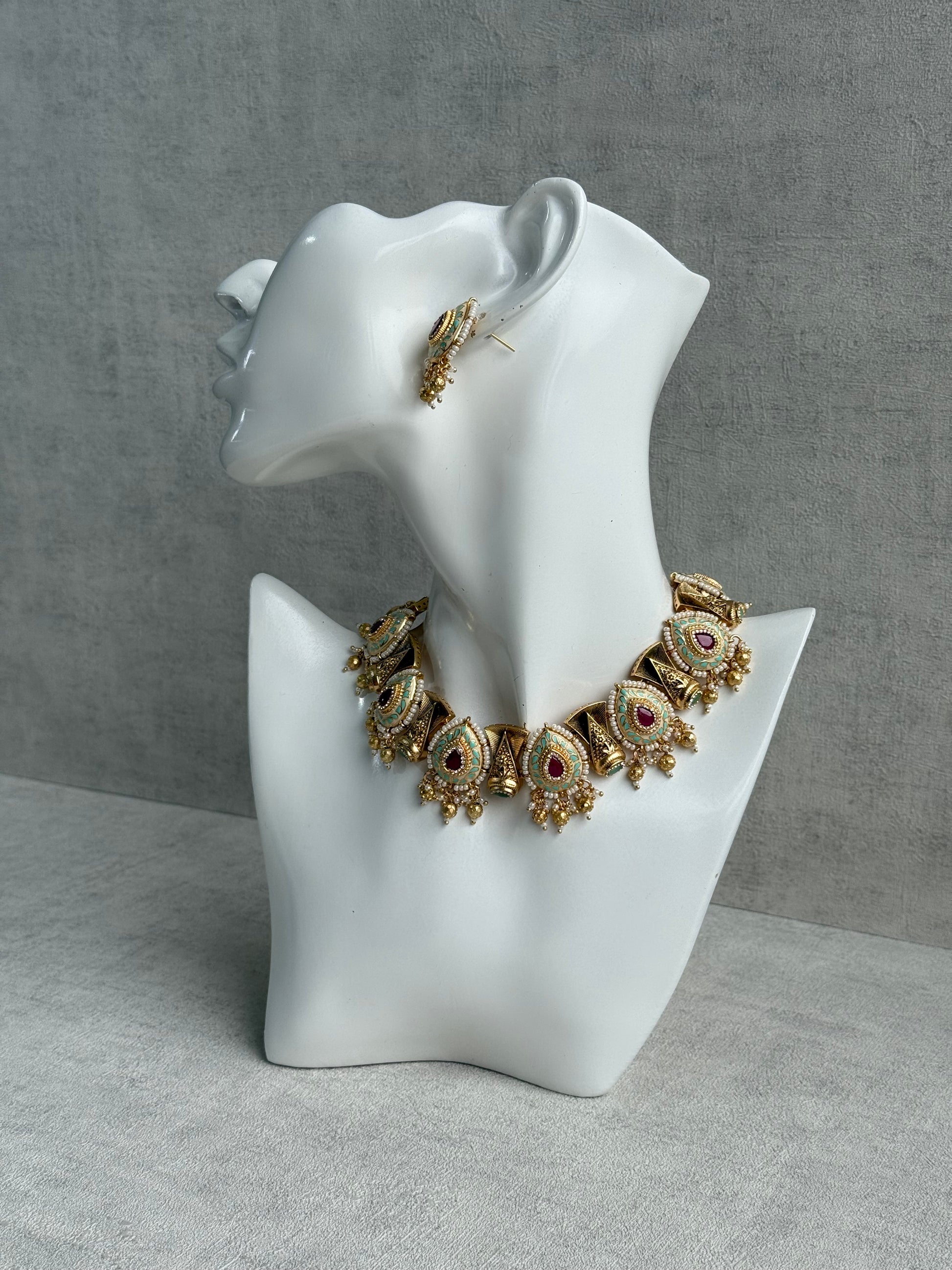 The Ayura Designs Aaira Set with Necklace & Studs – Mint Green Meenakari with Rani Pink Centre & Pearl Detailing brings a fresh twist to classic South Asian jewellery. Each pendant features a bold rani pink centre stone, framed by delicate mint green meenakari and pearl outlining. The antique gold cone-shaped segments between each motif add structure and contrast, etched with traditional detailing for a timeless feel.
