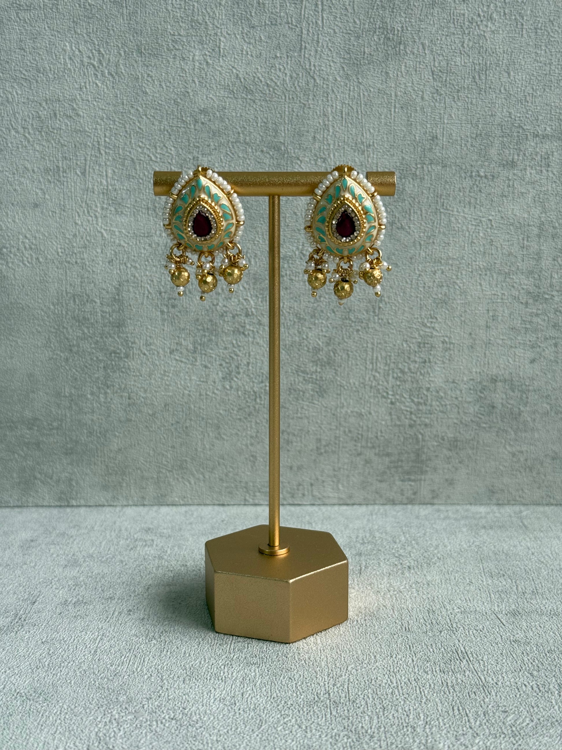 The matching studs echo the same teardrop design, finished with golden ghungroos and pearl drops for that charming, soft jingle. Comfortable and striking, they complete the set effortlessly, making it easy to style with both eastern and fusion outfits.