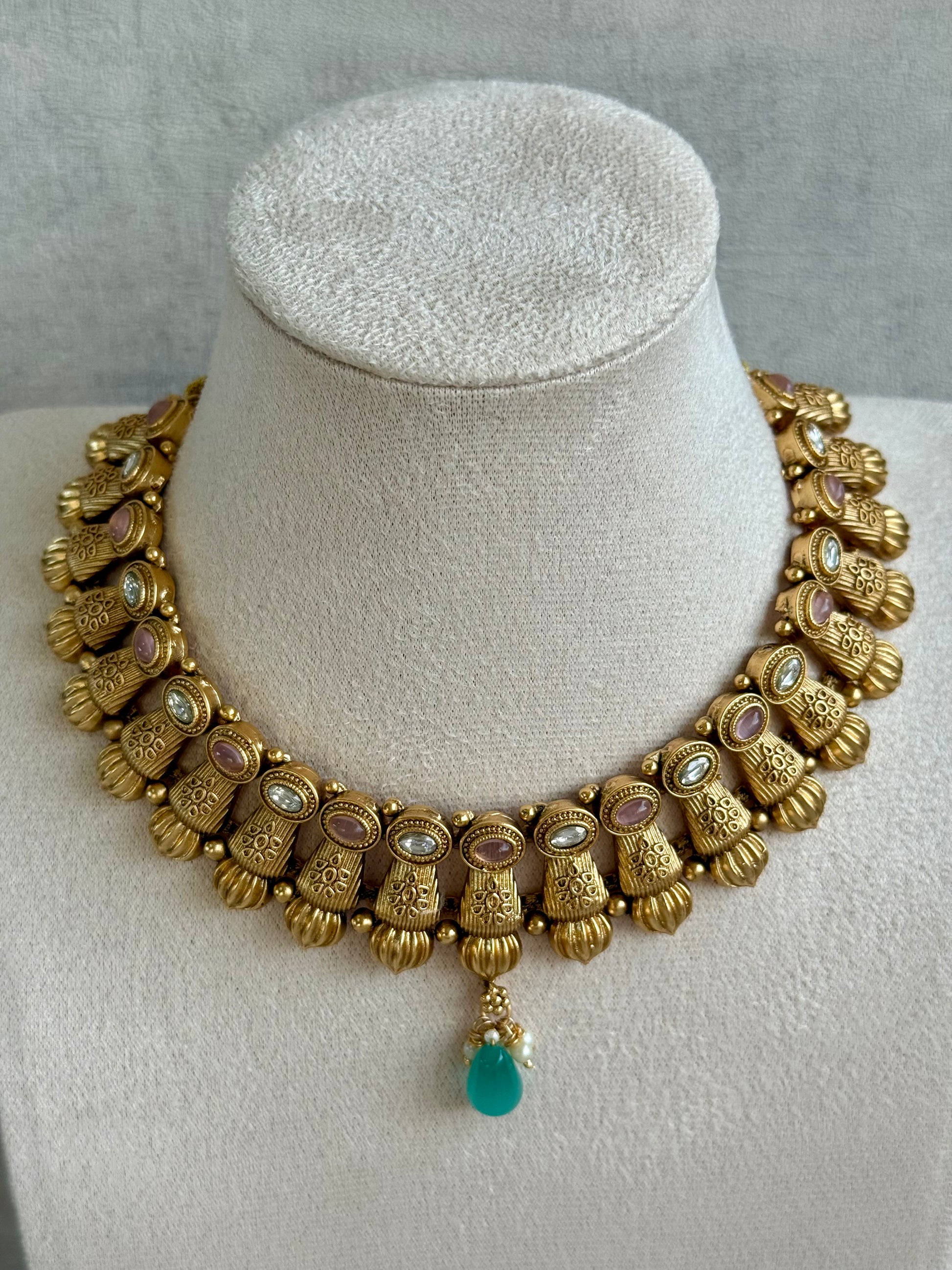 Ayura Designs Aima Necklace Set with Earrings – Antique Gold with Blush Pink & Aqua Green Stones