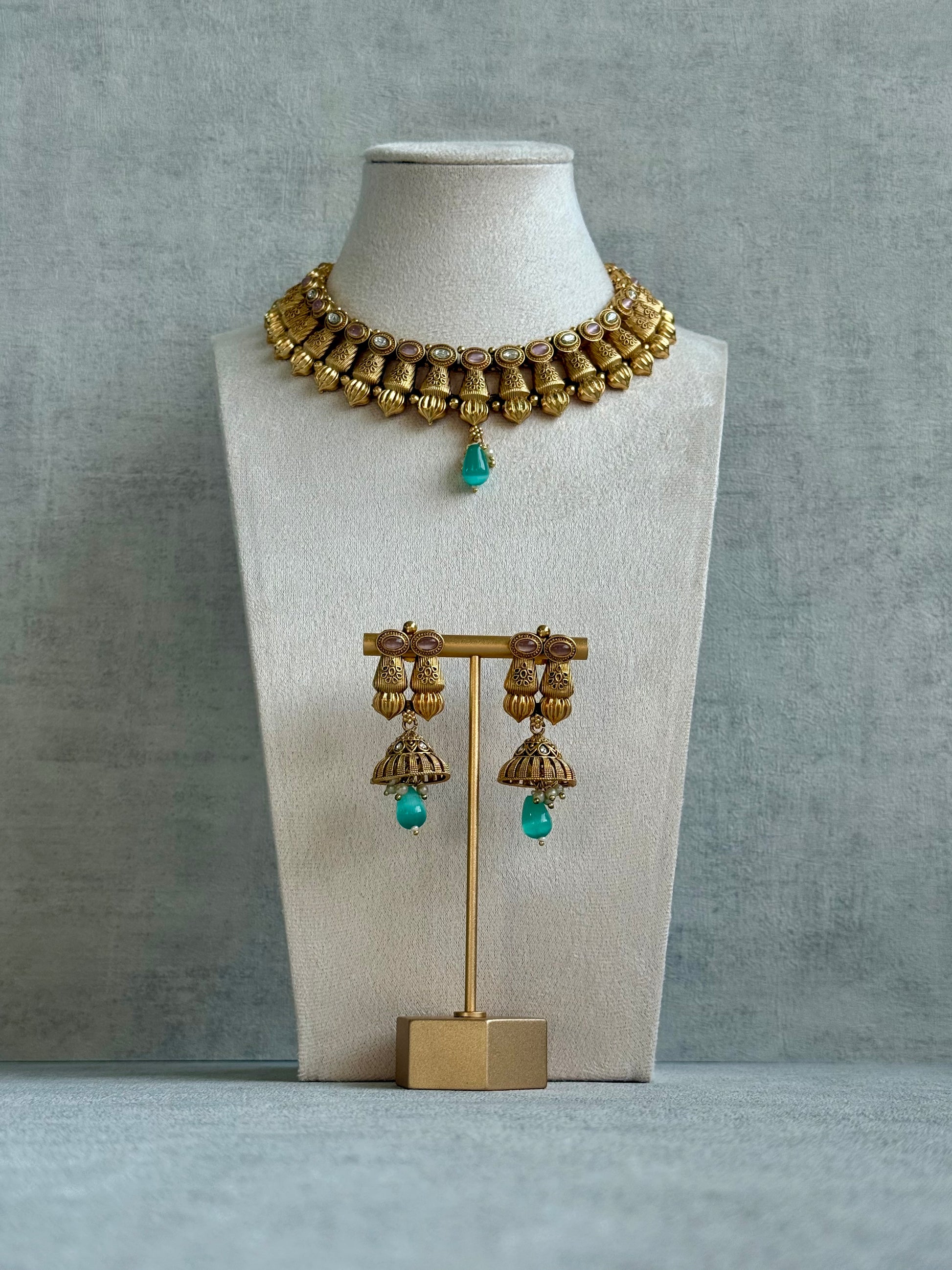 The necklace features finely sculpted gold segments with kundan style stones, finished with an aqua teardrop that adds a subtle pop of colour at the centre.
