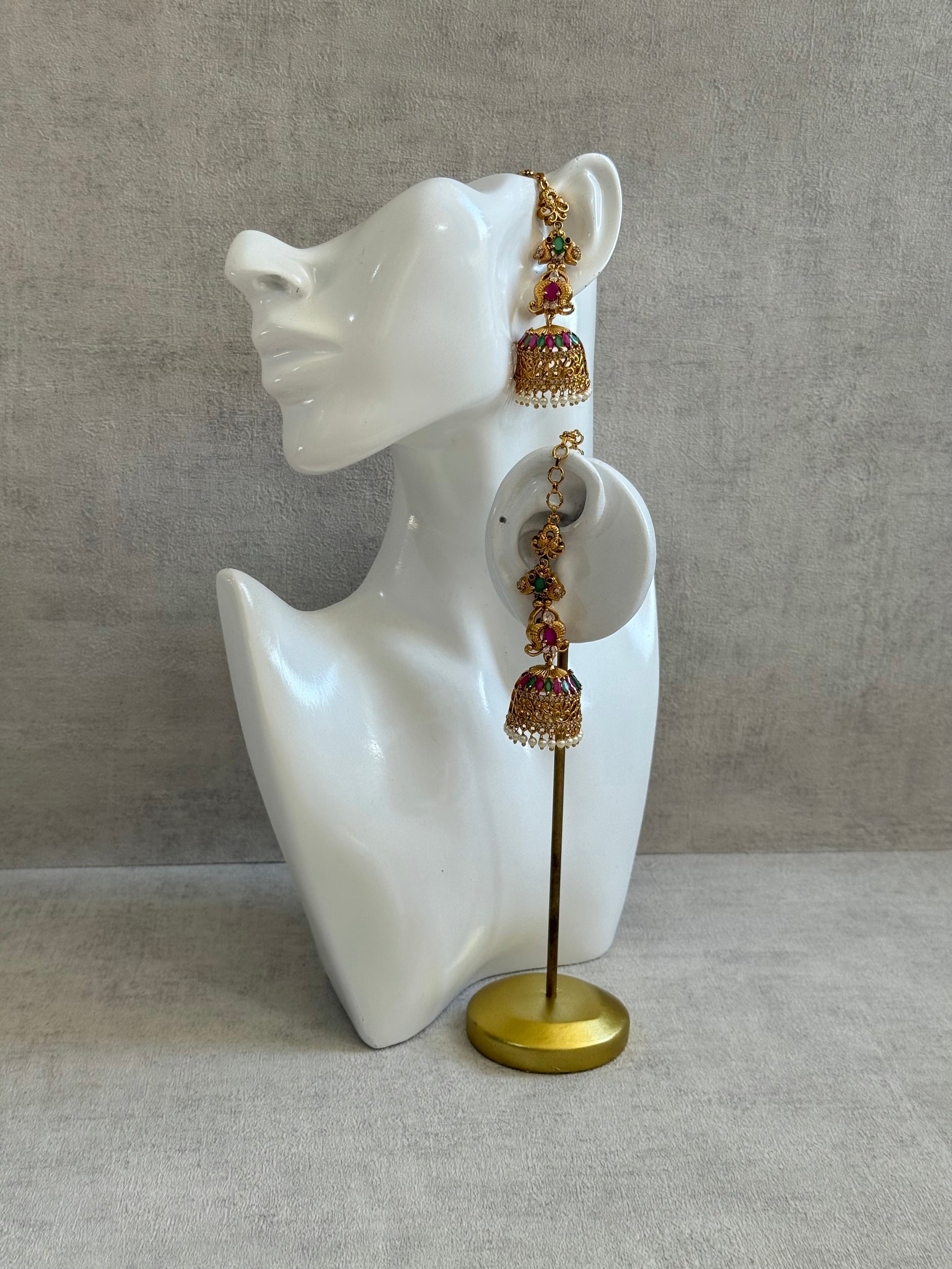 Ayura Designs Alar Jhumkis – Ear Climber in Antique Gold with Emerald & Pink Stones and Pearl Drops