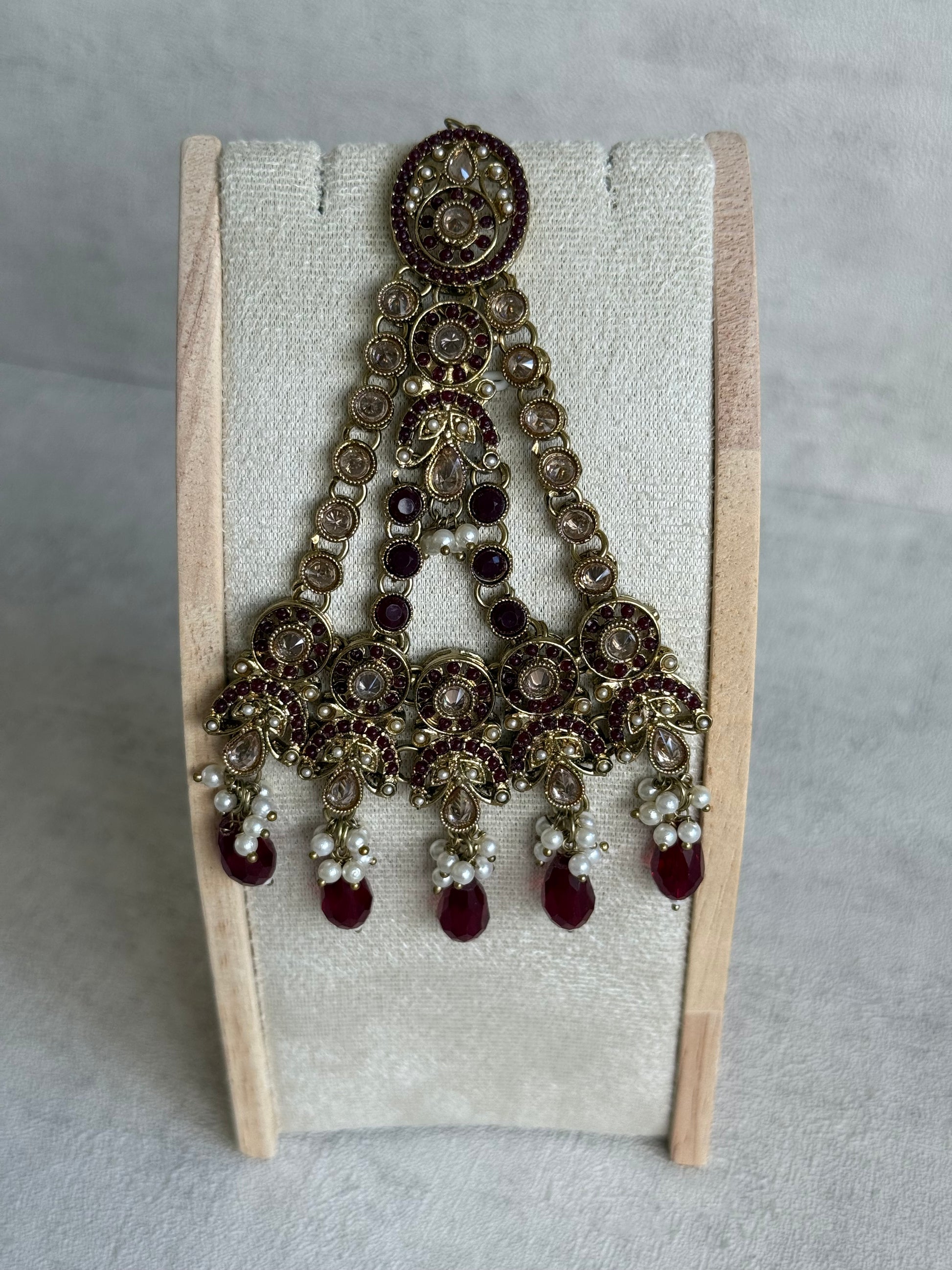 The earrings and tikka echo the same intricate craftsmanship, creating a seamless set that balances bold colour with refined artistry. The maroon tones are classic yet powerful, making this set a timeless addition to any jewellery collection.