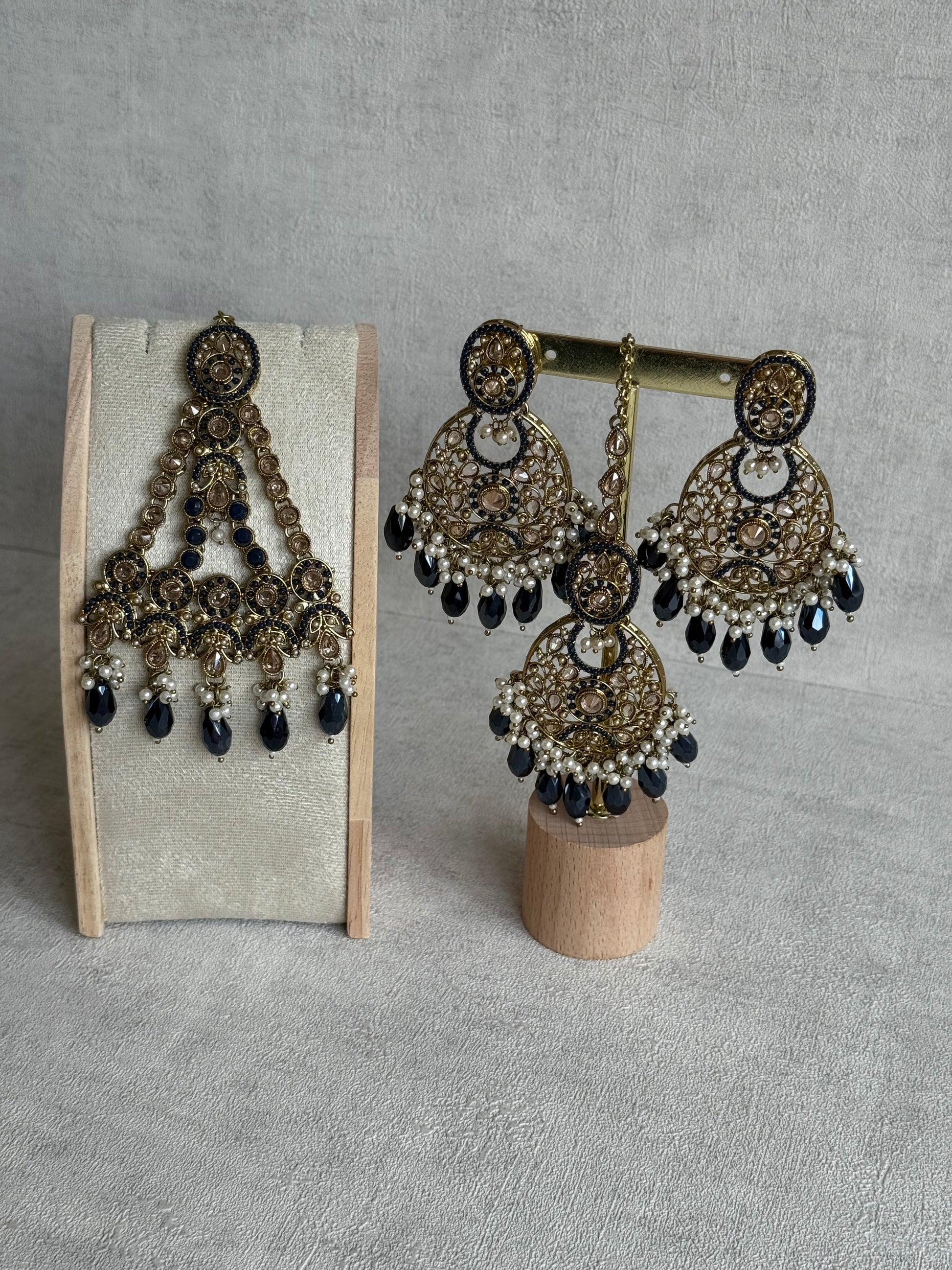 The Ayura Designs Almas Tikka Set with Earrings, Tikka & Sahara – Midnight Blue Beads & Antique Gold Finish is a dramatic and regal choice, crafted for those who love timeless elegance. With its antique gold framework, intricate filigree work, and mirror-cut stone detailing, this set exudes heritage artistry while the deep midnight blue bead drops add an unmistakable richness. The sahara chains provide graceful draping, giving extra support and enhancing the overall statement look.