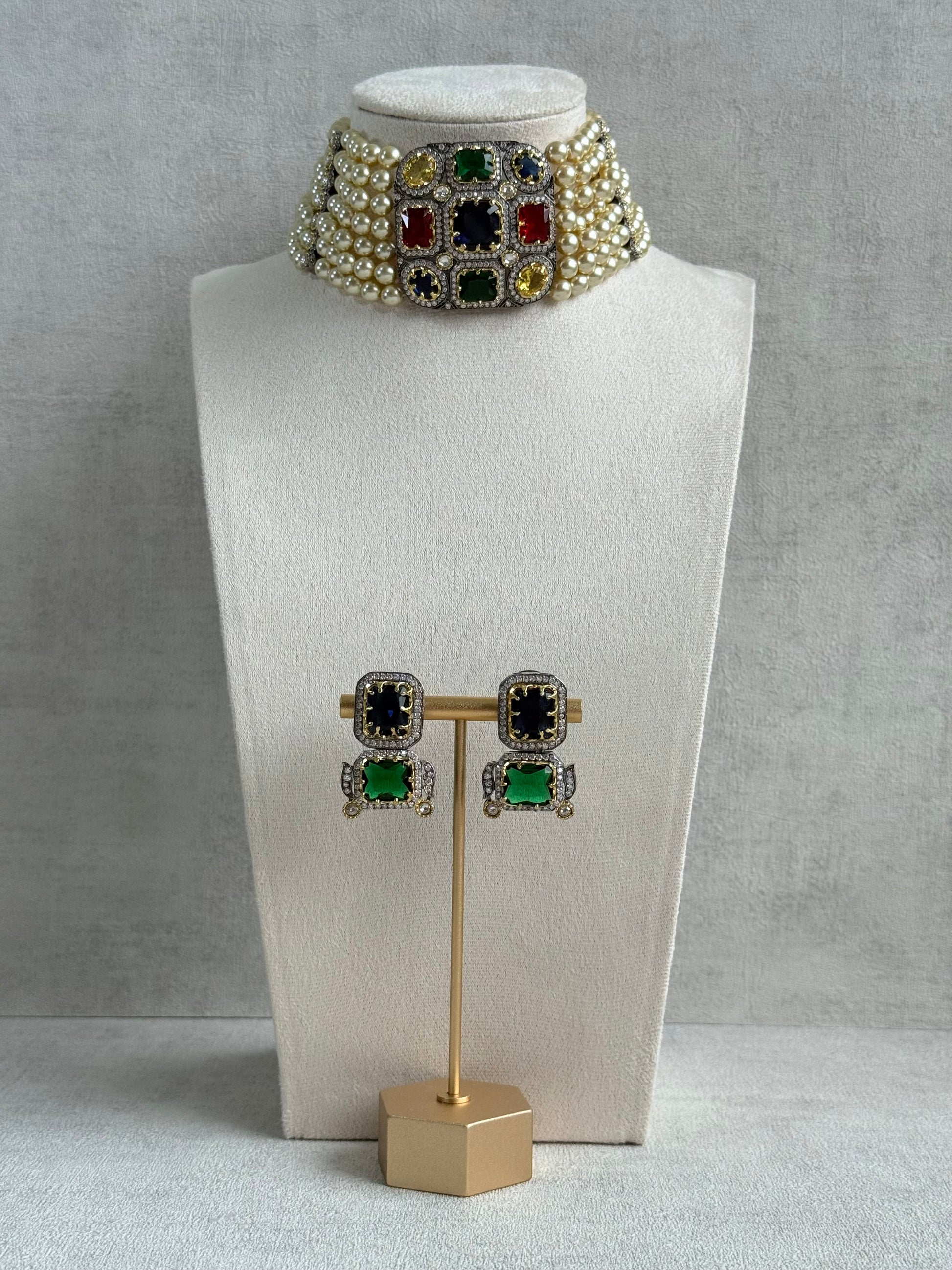 Layers of luminous pearls form the choker’s structure, softening the intensity of the gemstone colours while enhancing the set’s regal presence. The coordinating stud earrings echo the same jewel-tone arrangement for a perfectly balanced look.