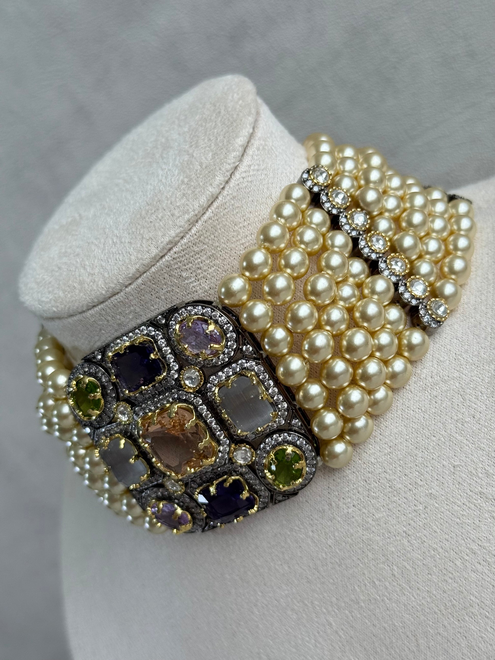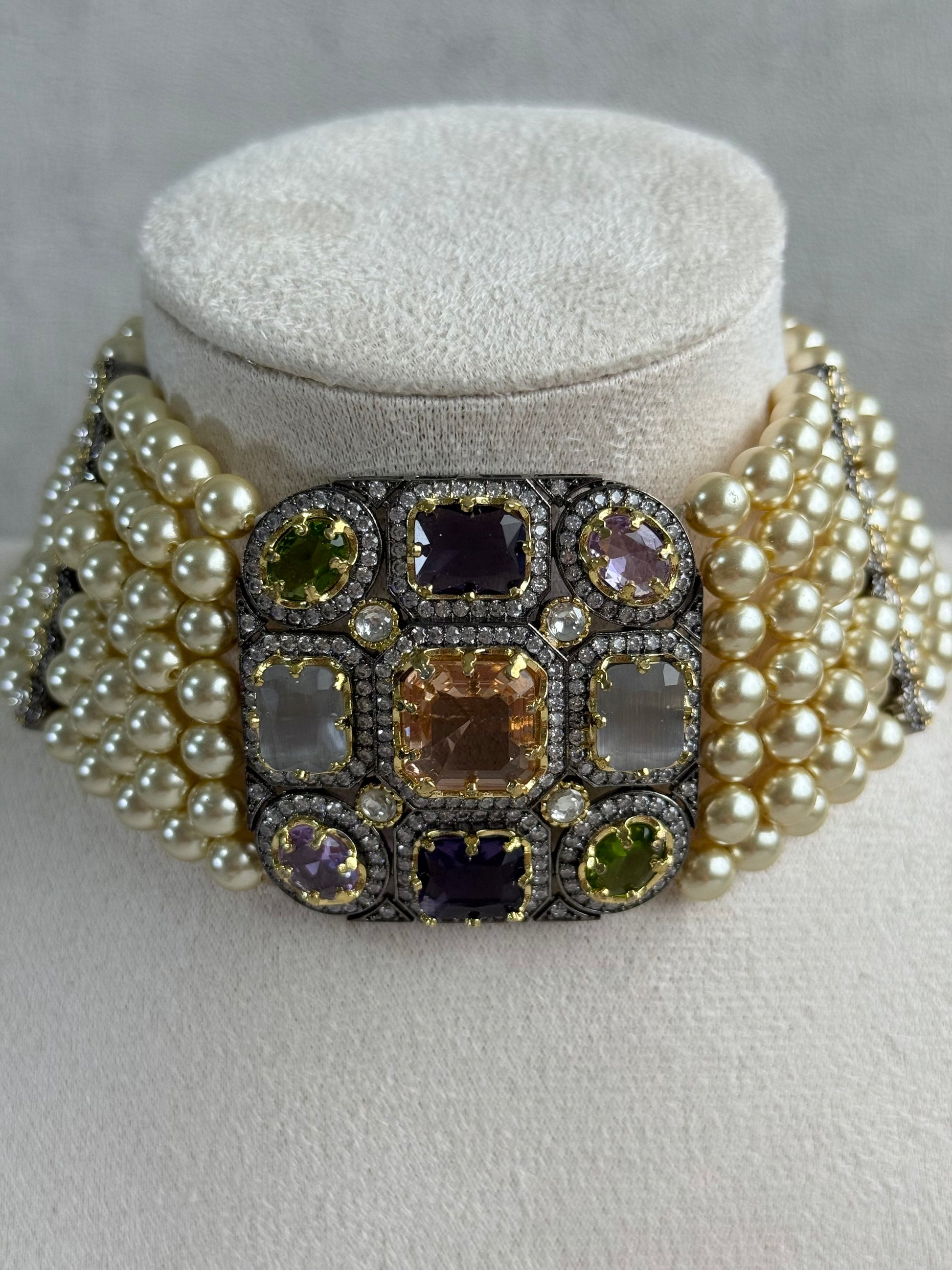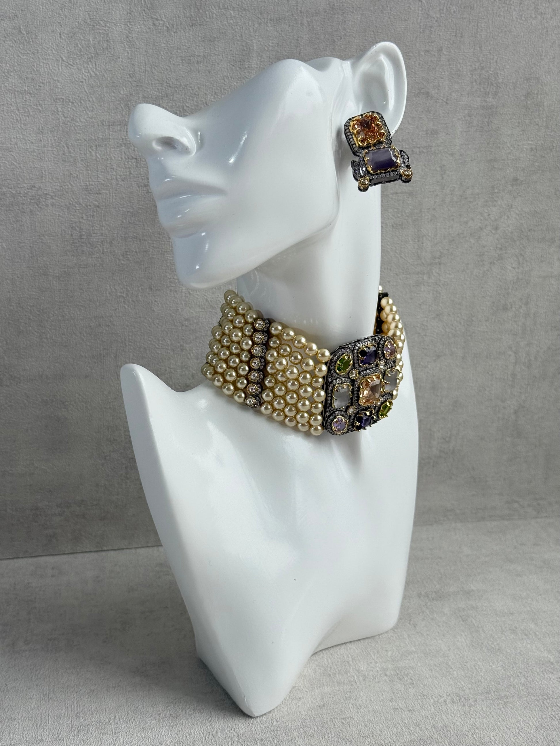 Multiple rows of layered pearls wrap around the neck, adding depth, texture, and a timeless regal feel. The matching stud earrings mirror the choker’s stone layout, ensuring a cohesive and polished finish when worn together.