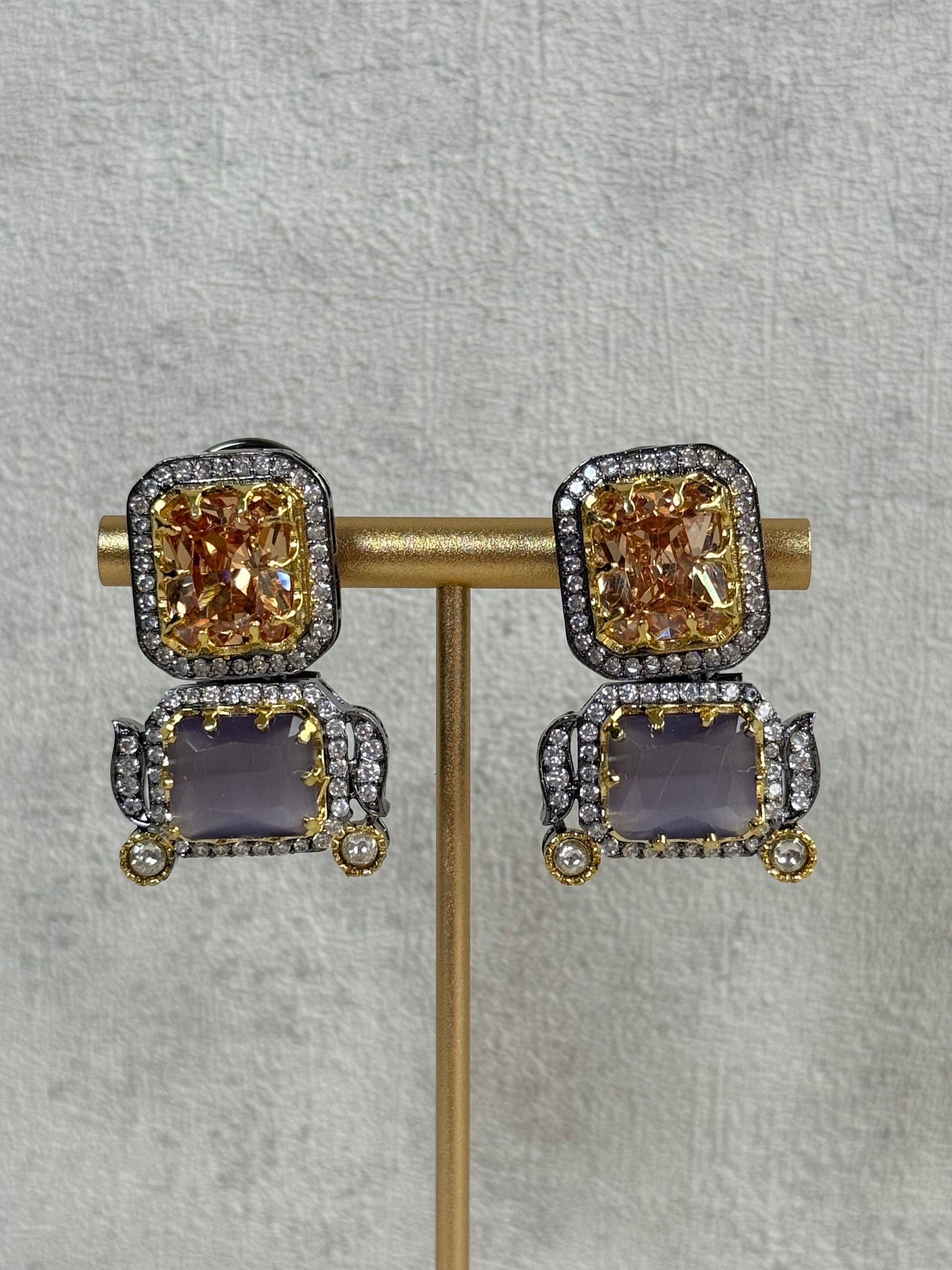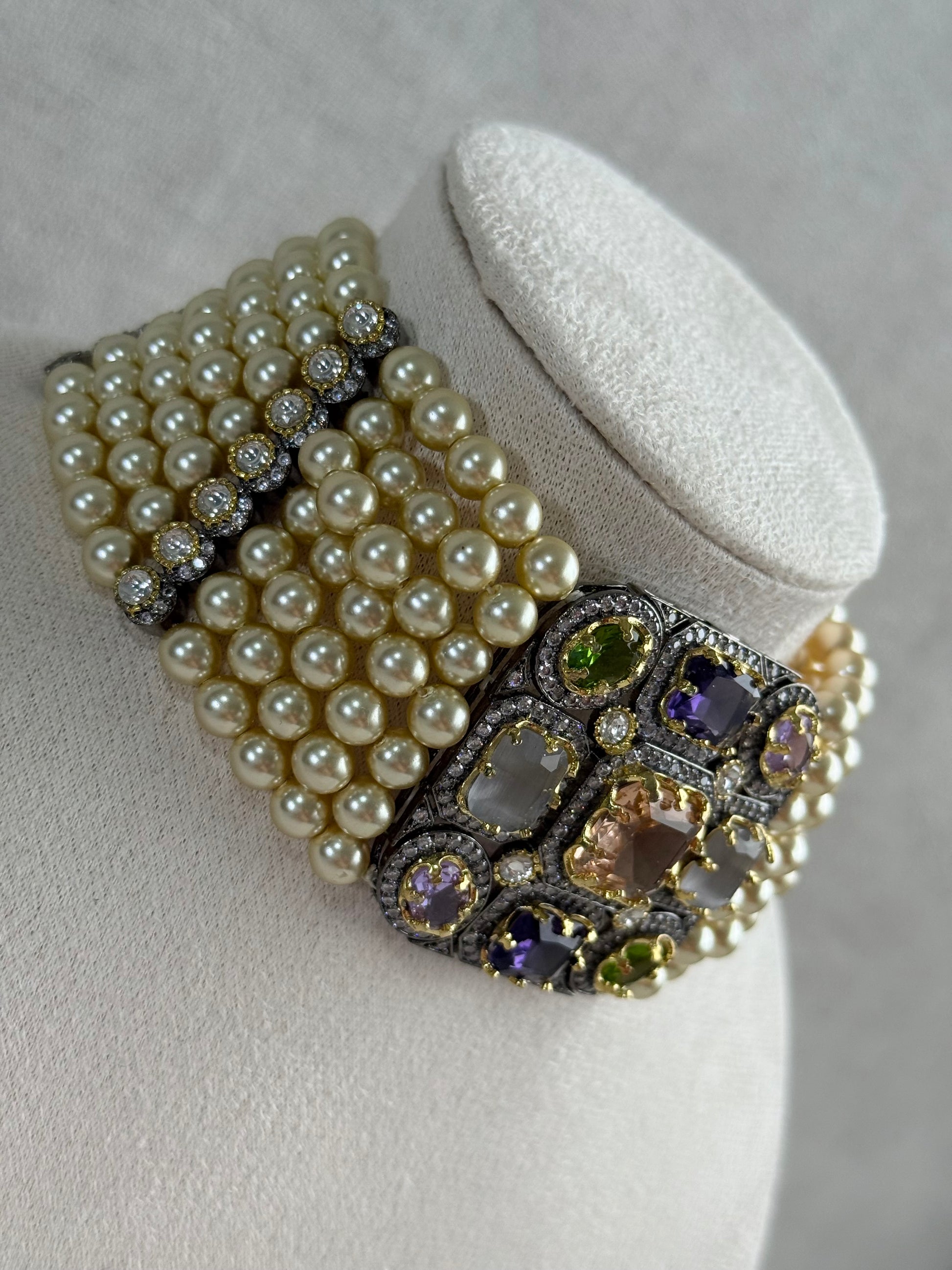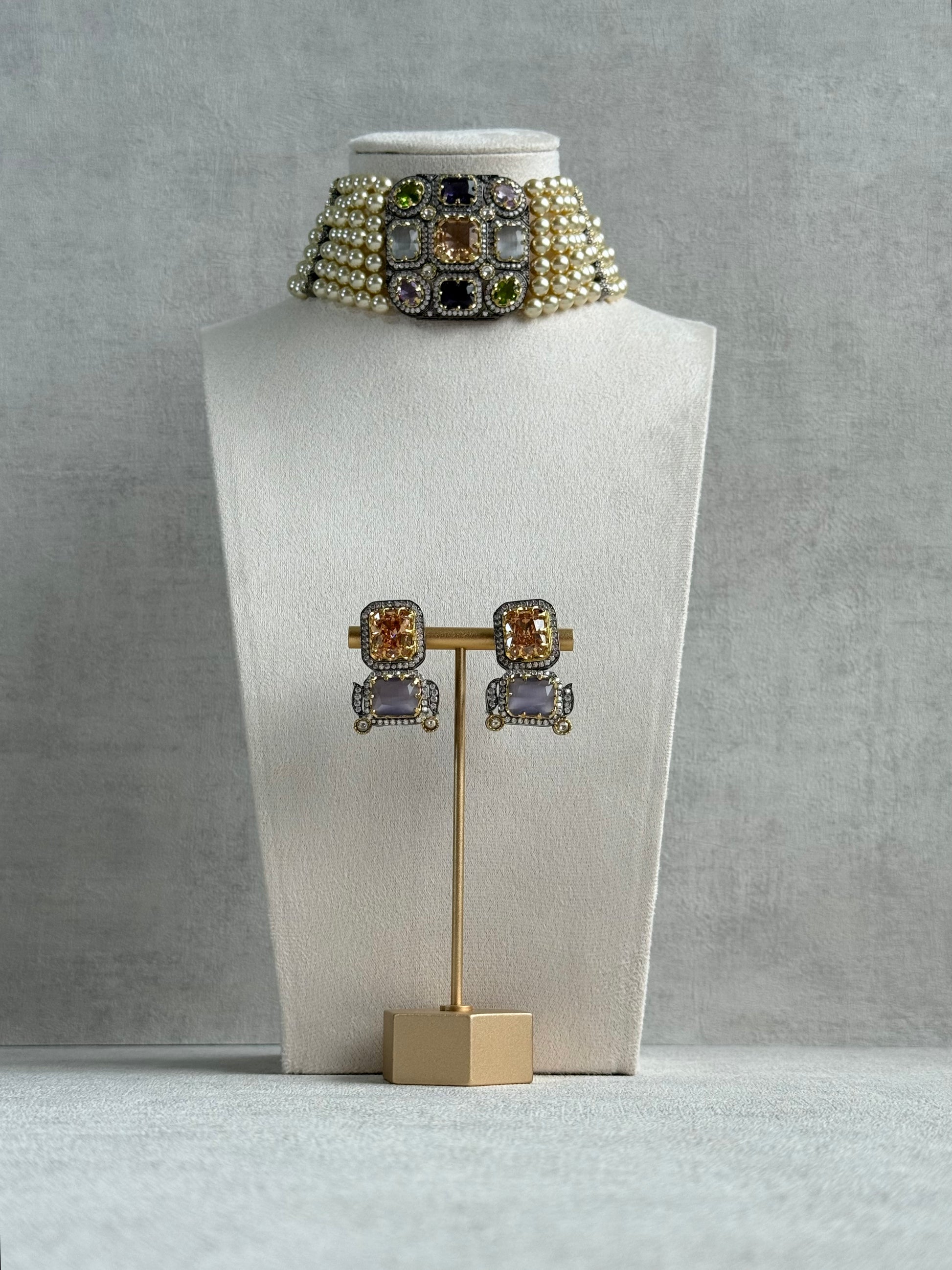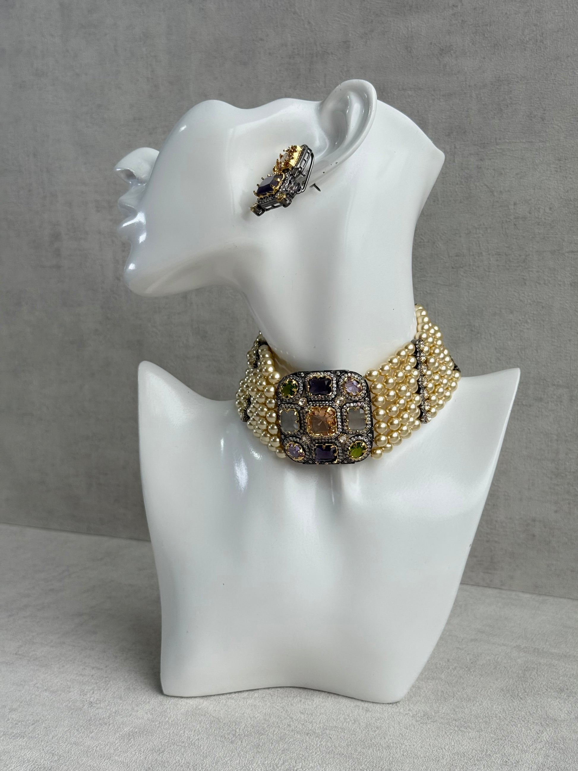 Multiple rows of layered pearls wrap around the neck, adding depth, texture, and a timeless regal feel. The matching stud earrings mirror the choker’s stone layout, ensuring a cohesive and polished finish when worn together.