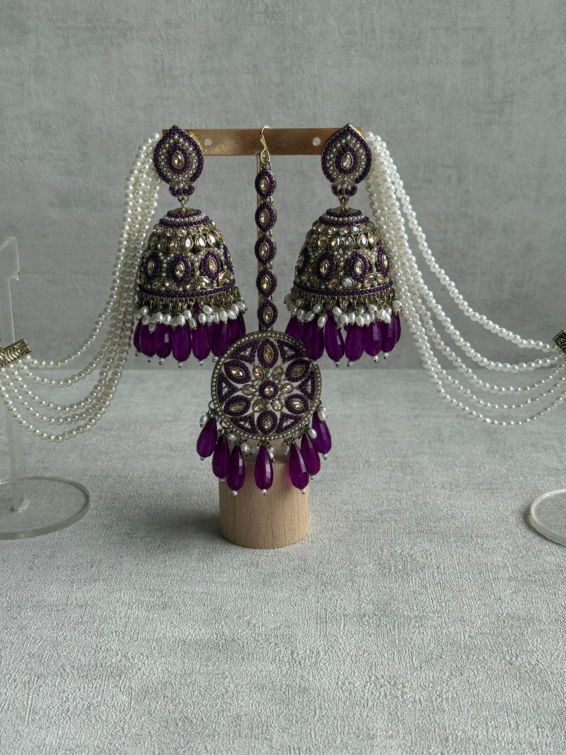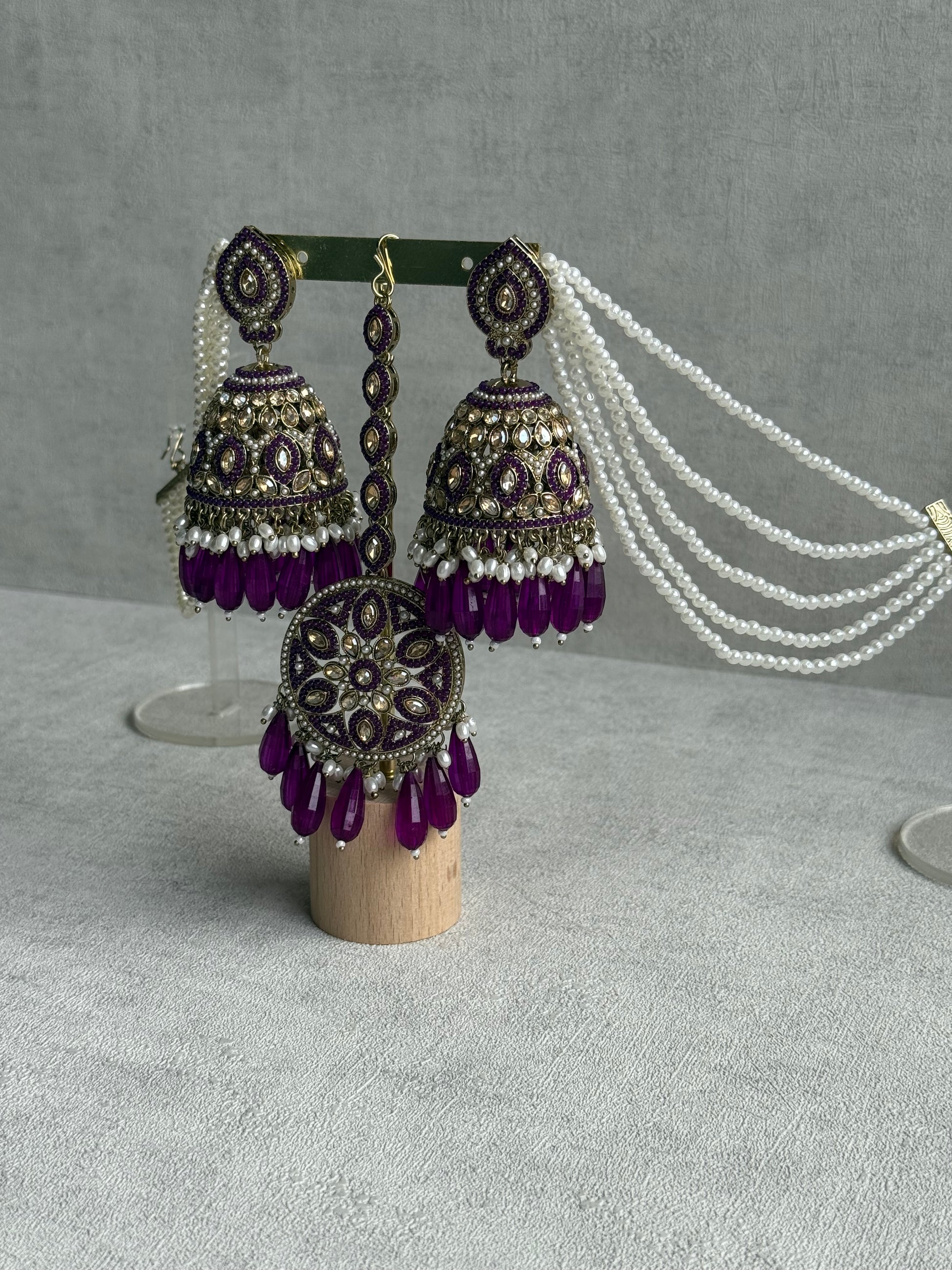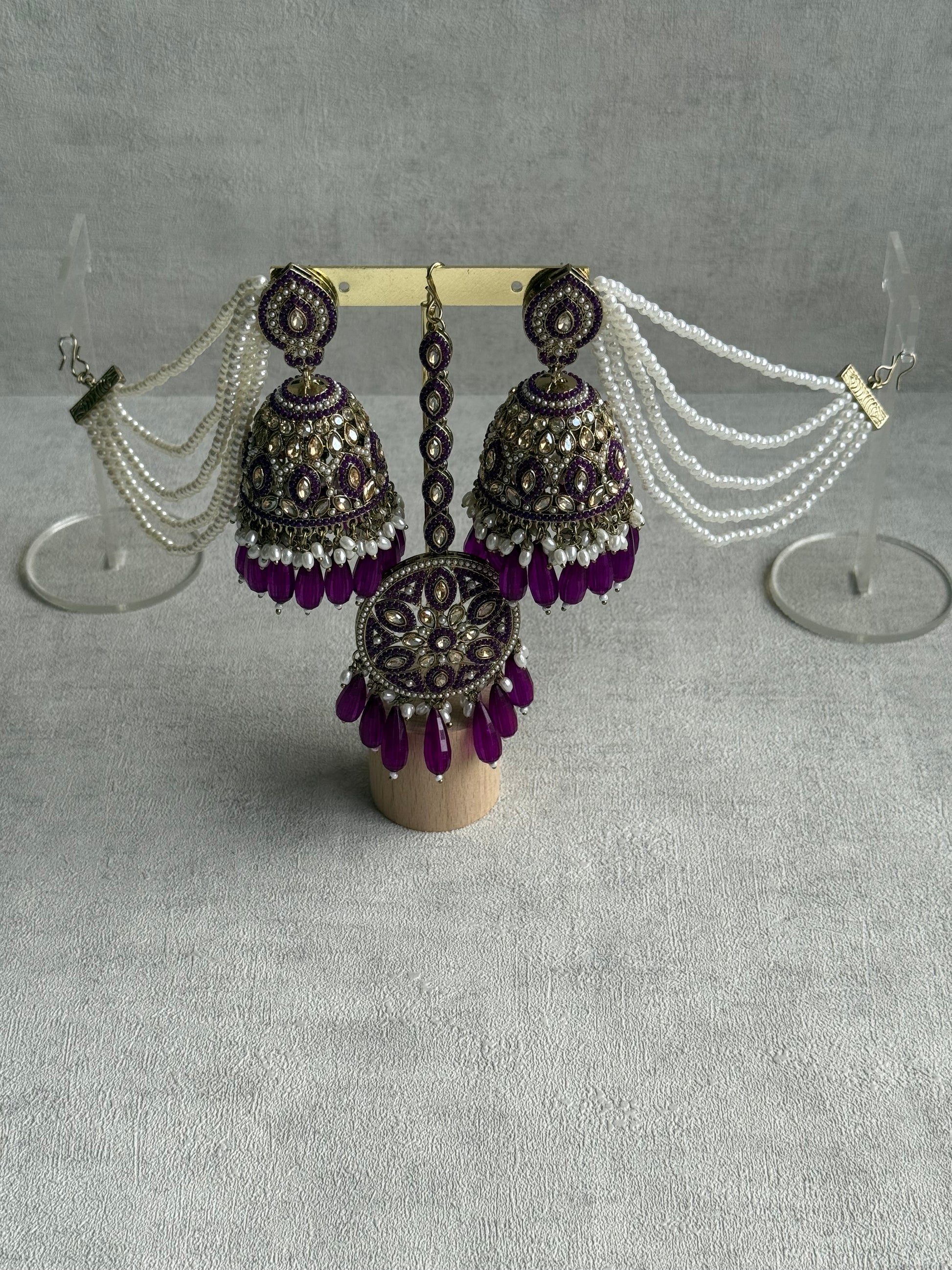 Each jhumki is richly embellished with floral kundan motifs and bordered with tiny pearls, finished with bold berry-purple bead drops that add a touch of vibrant sophistication. The pearl sahare drape gracefully along the hairline, enhancing the grandeur of traditional silhouettes while maintaining a refined balance.