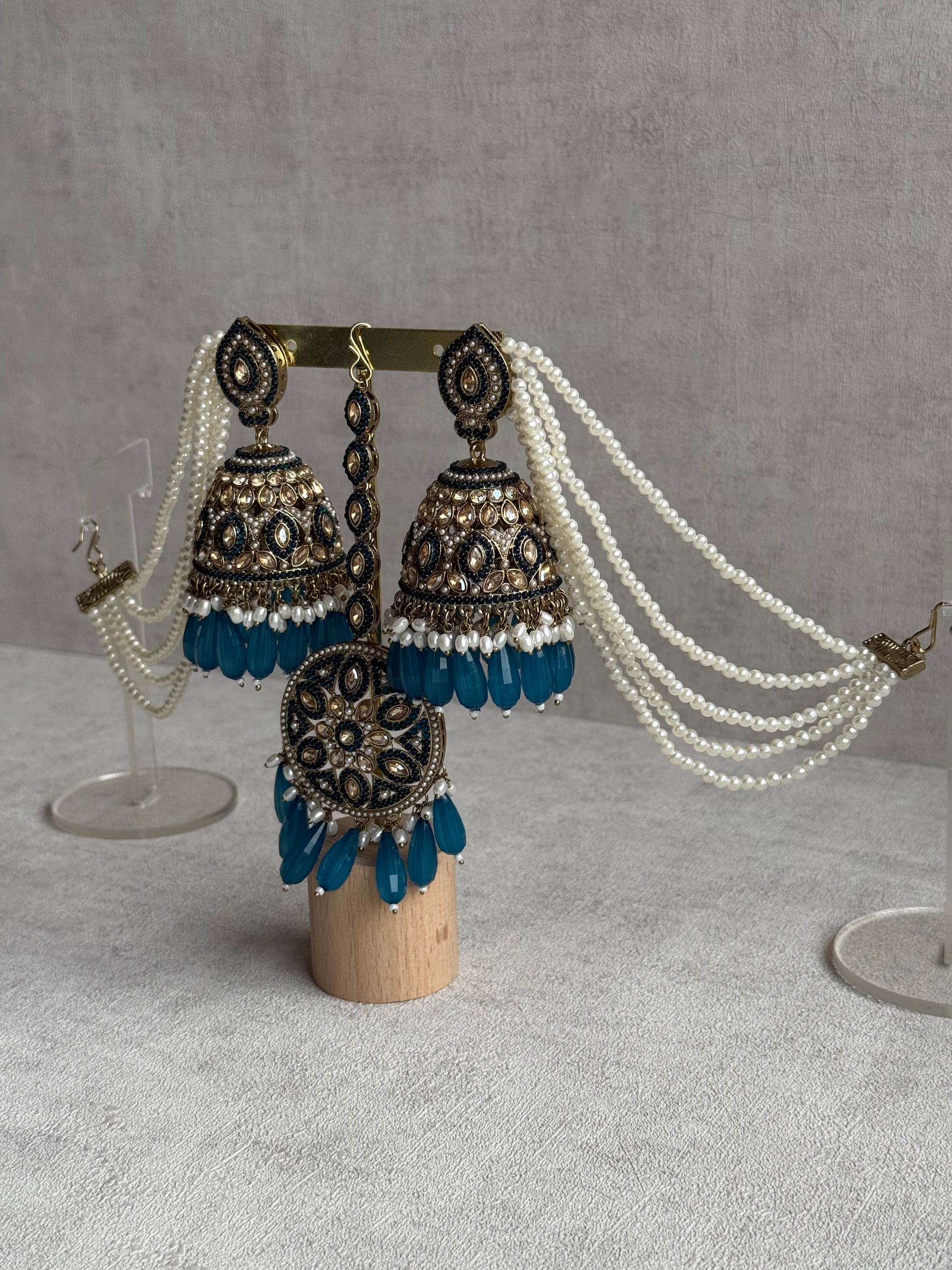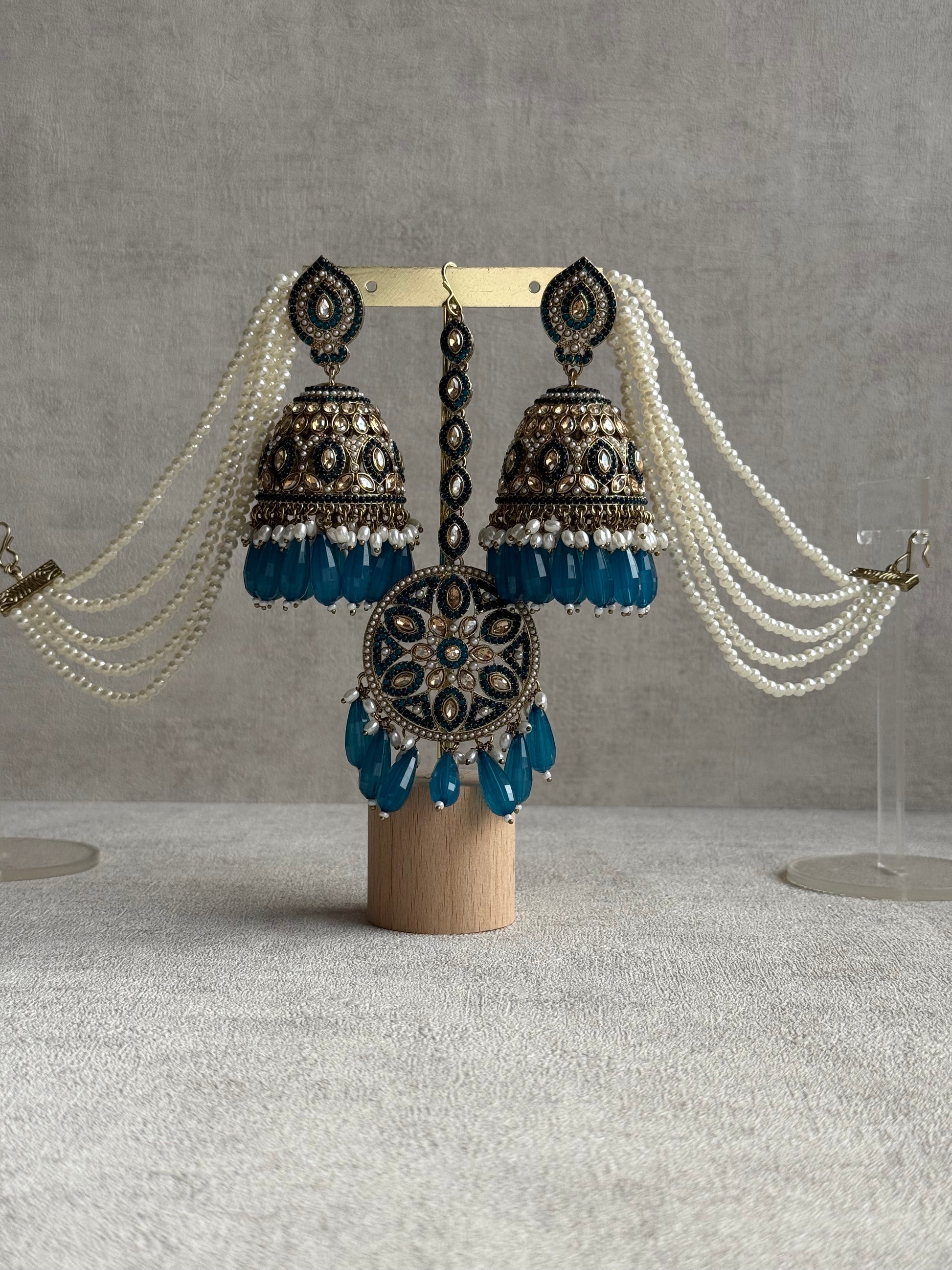 The Ayura Designs Amrita Set in Peacock Blue captures the essence of royal opulence and timeless allure. Designed with intricate kundan work and antique gold detailing, this set features statement jhumkis, a matching tikka, and elegant pearl sahare — a symphony of heritage and modern grace.