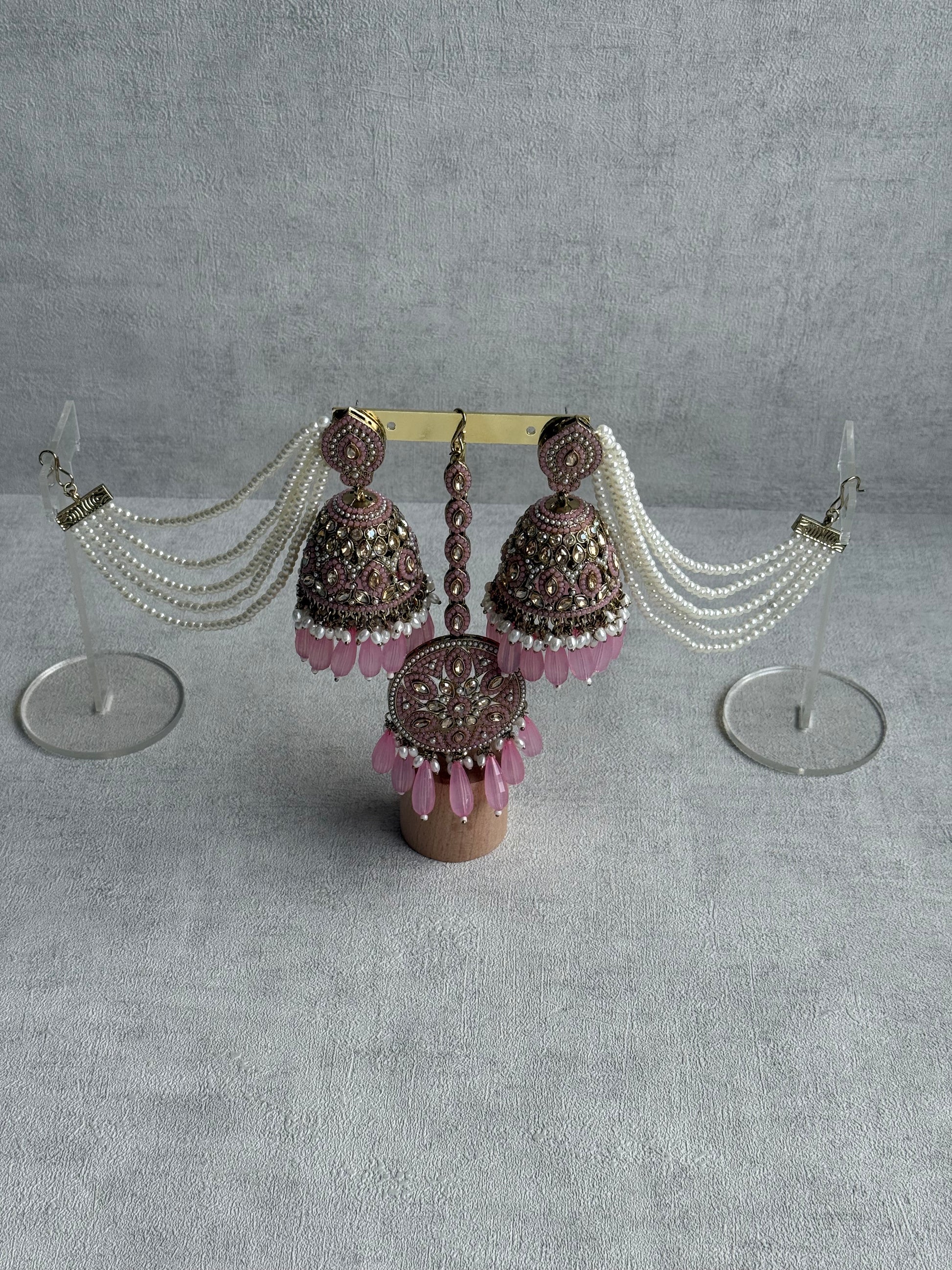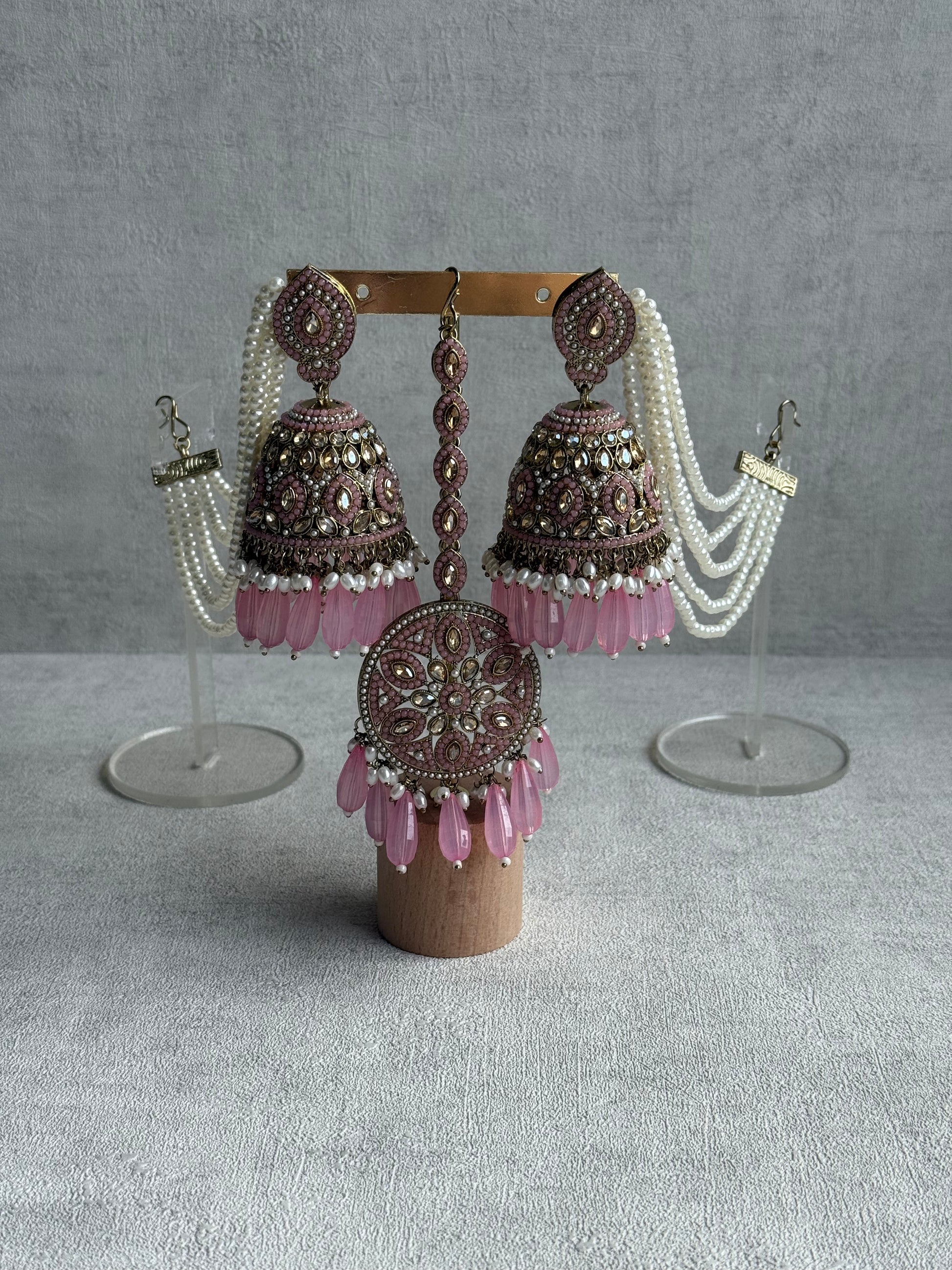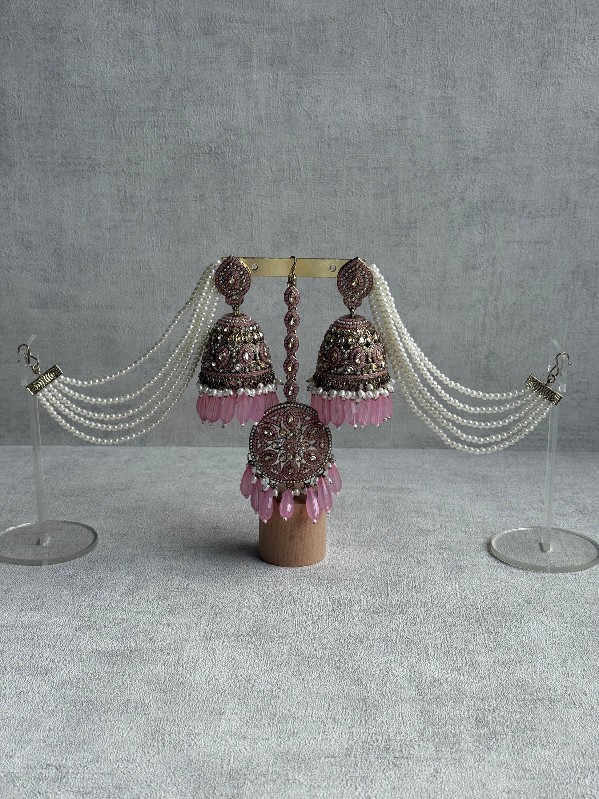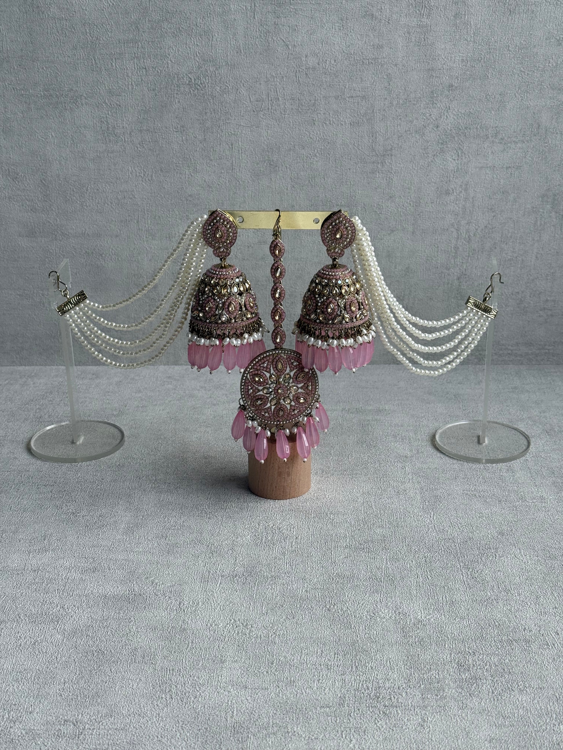 Each jhumki is a masterpiece of detail — layers of antique gold metalwork shimmer beneath a cascade of pearls and blush pink teardrop beads. The sahare, lined with pearl strands, gracefully frame the face for a timeless, bridal-inspired look that captures movement and grace with every turn.