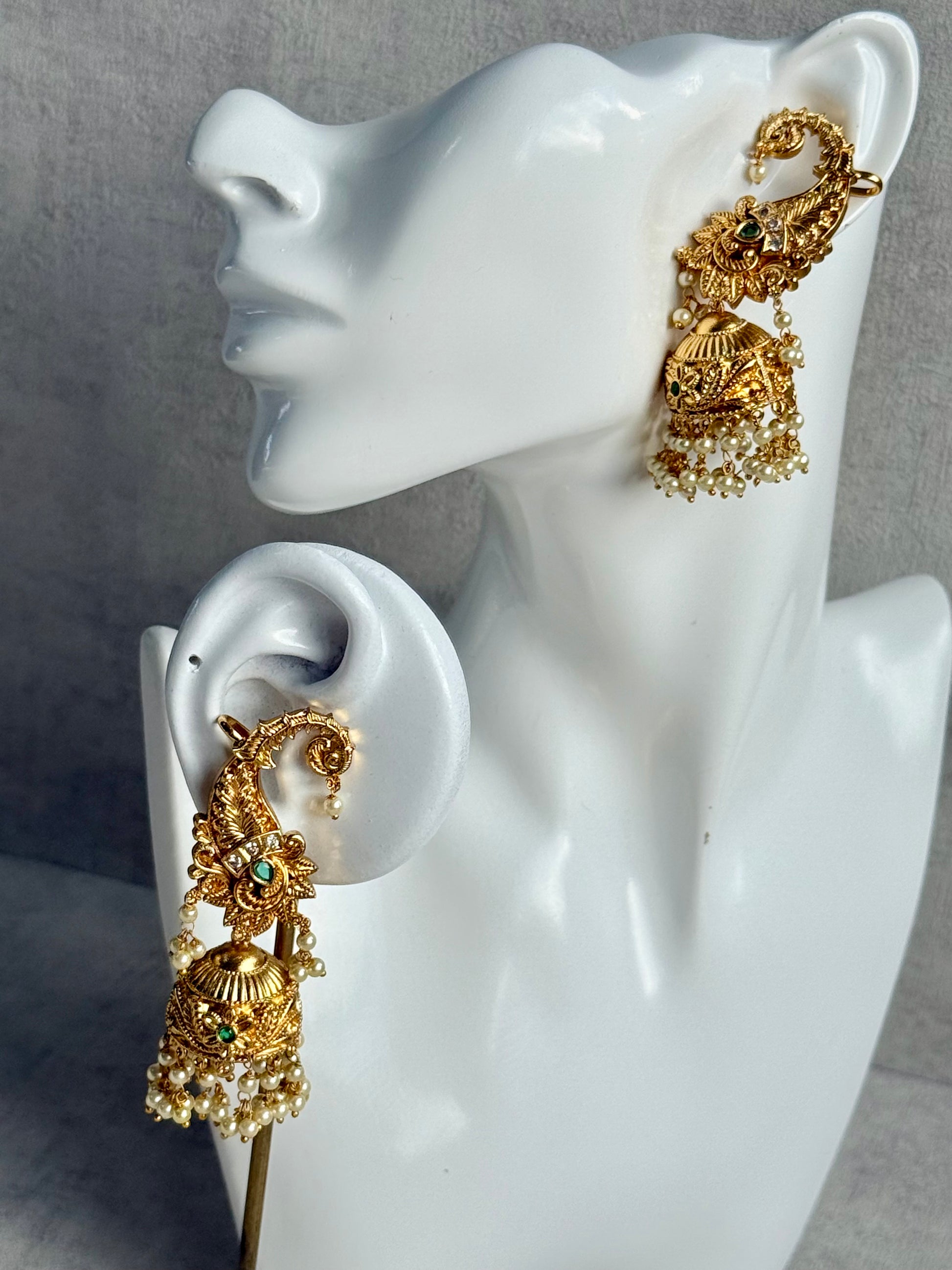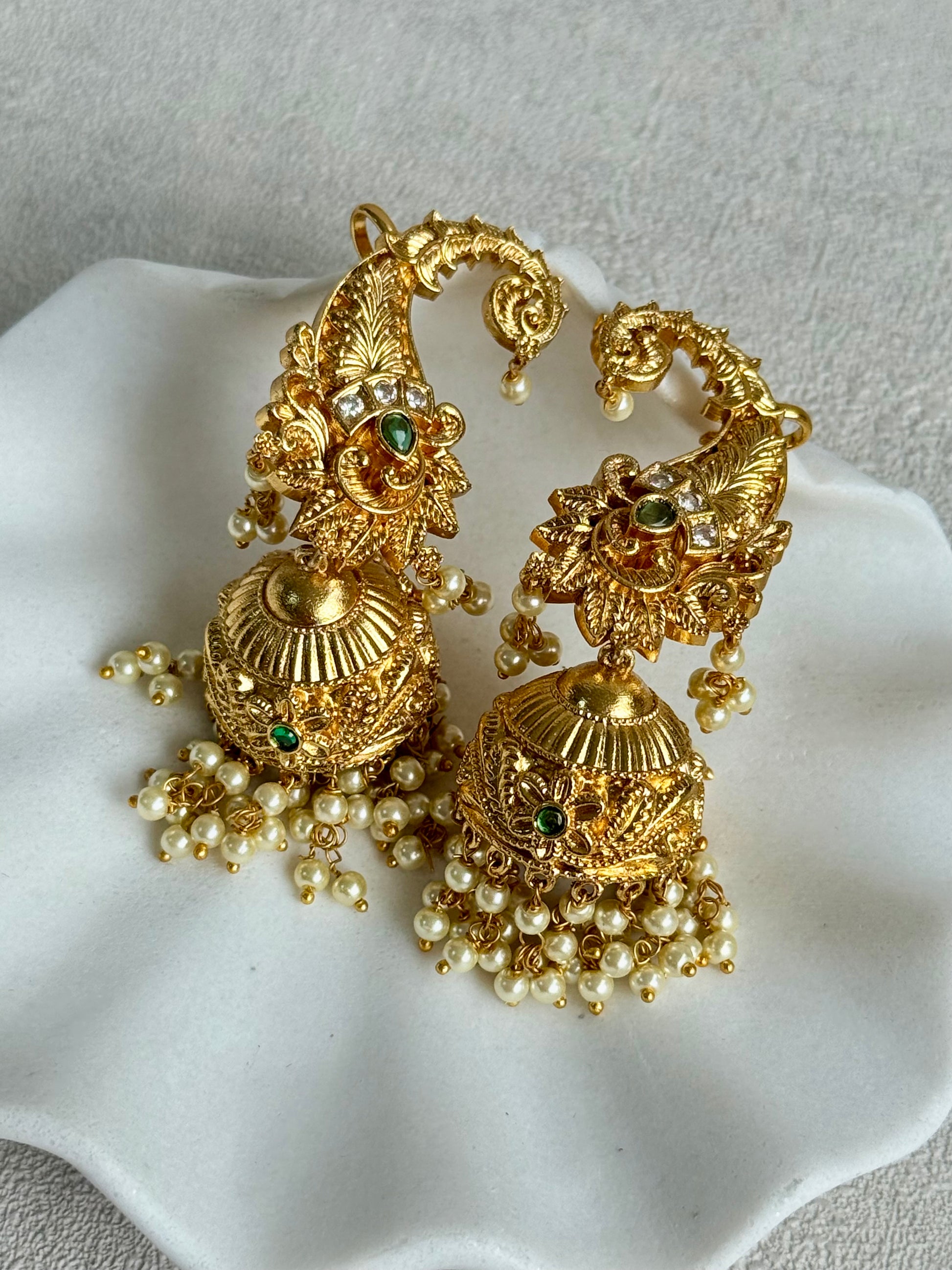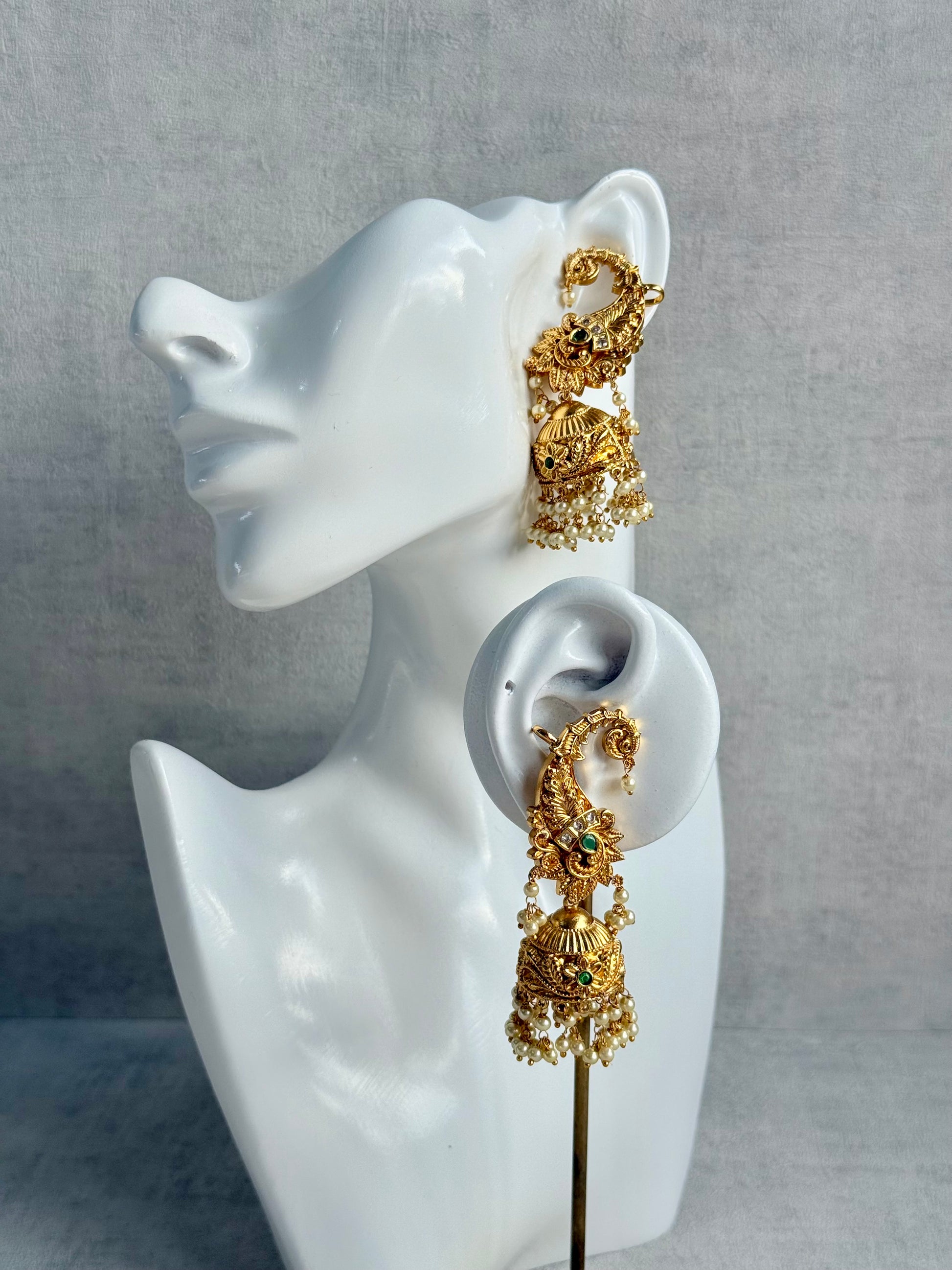 Ayura Designs Anika Jhumkis – Gold Half Ear Cuffs with Peacock Motif, Green Stone Accents, Kundan Crystals & Pearl Jhumka Drops