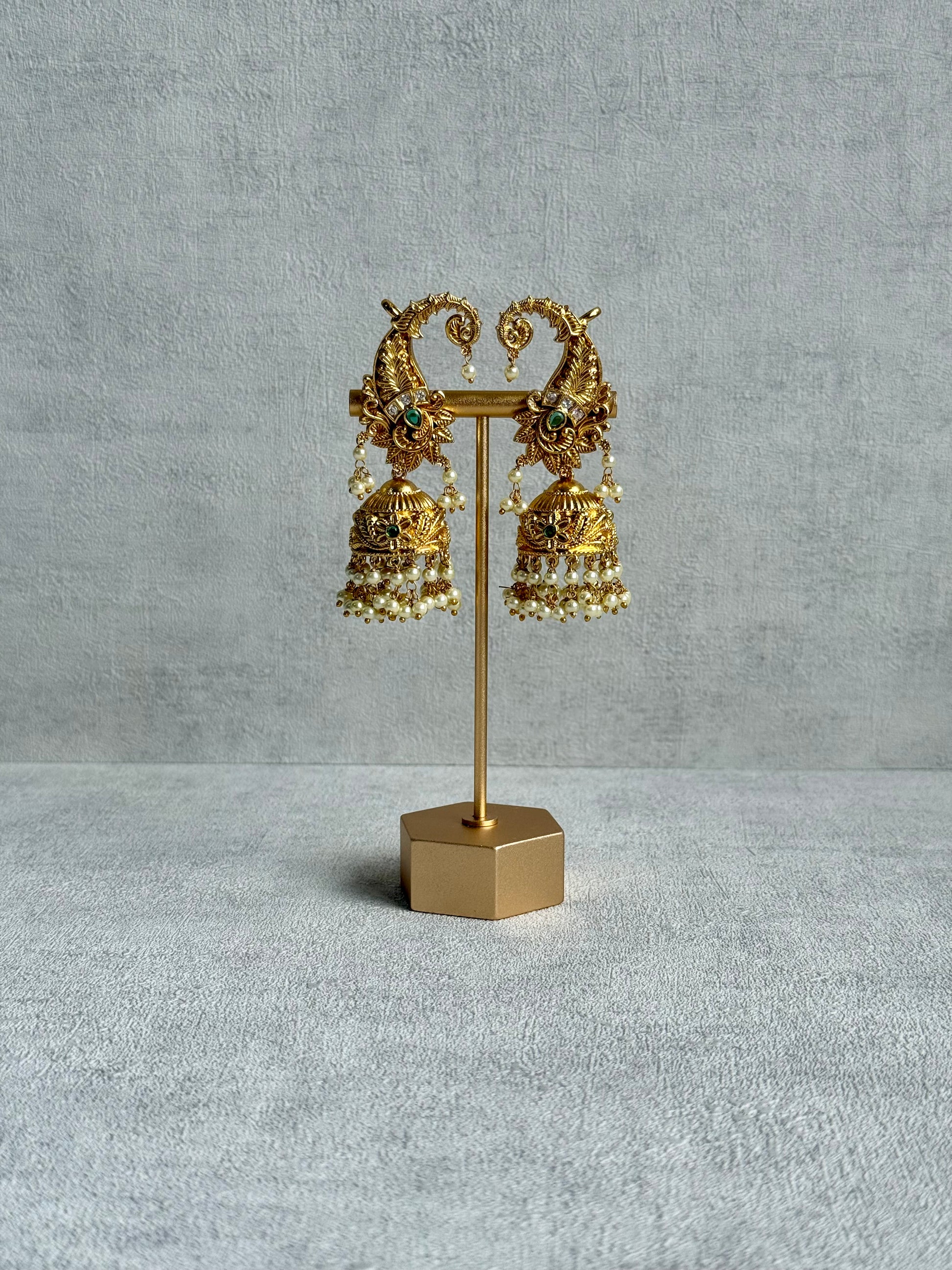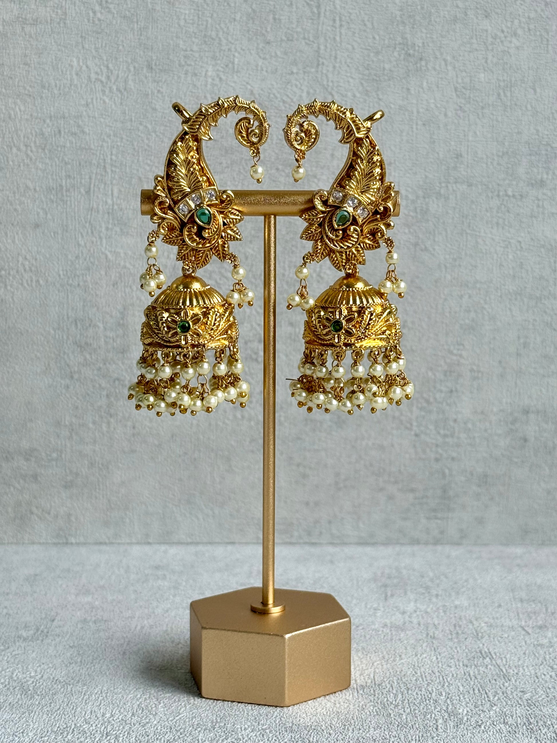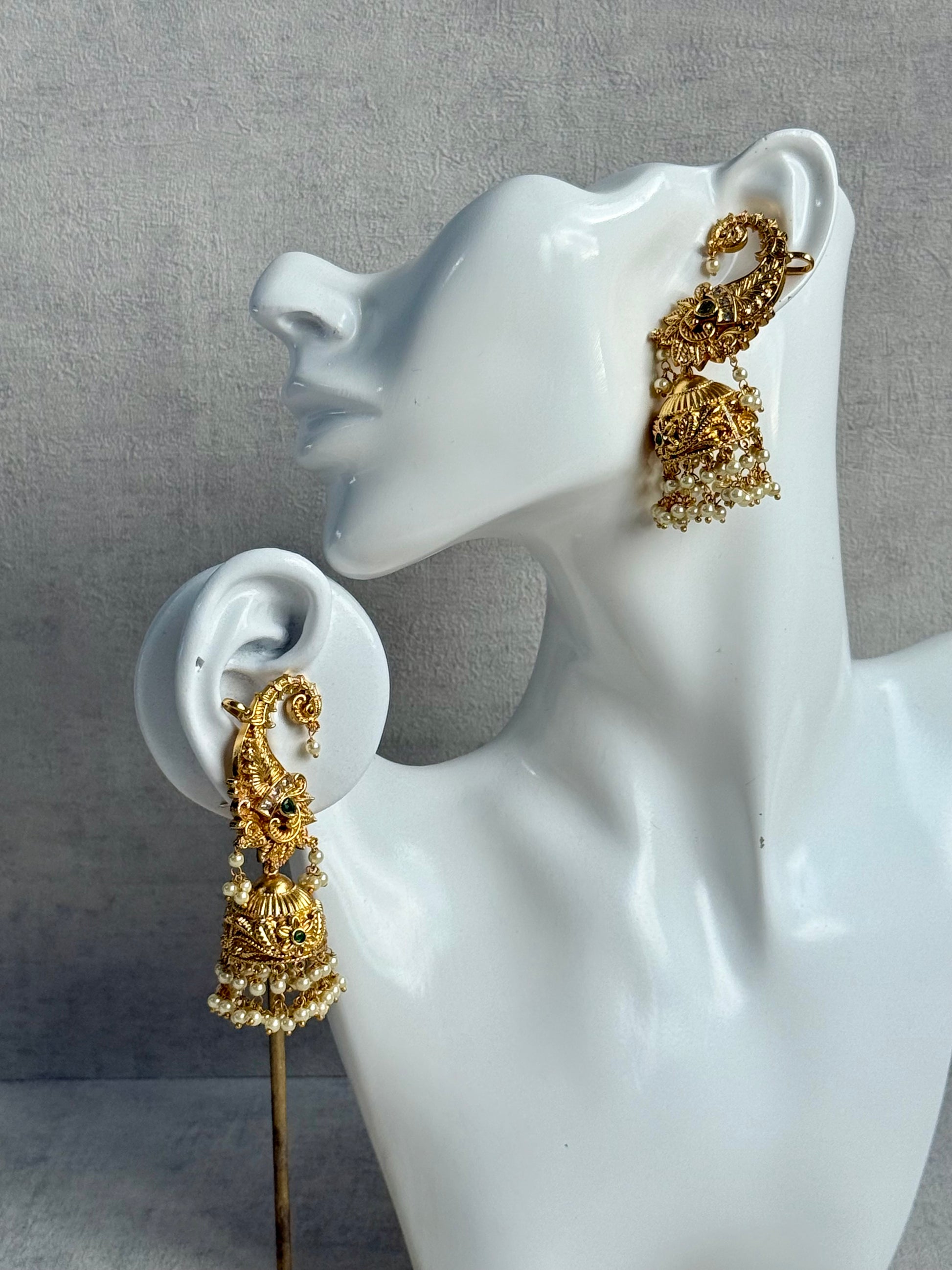 Ayura Designs Anika Jhumkis – Gold Half Ear Cuffs with Peacock Motif, Green Stone Accents, Kundan Crystals & Pearl Jhumka Drops