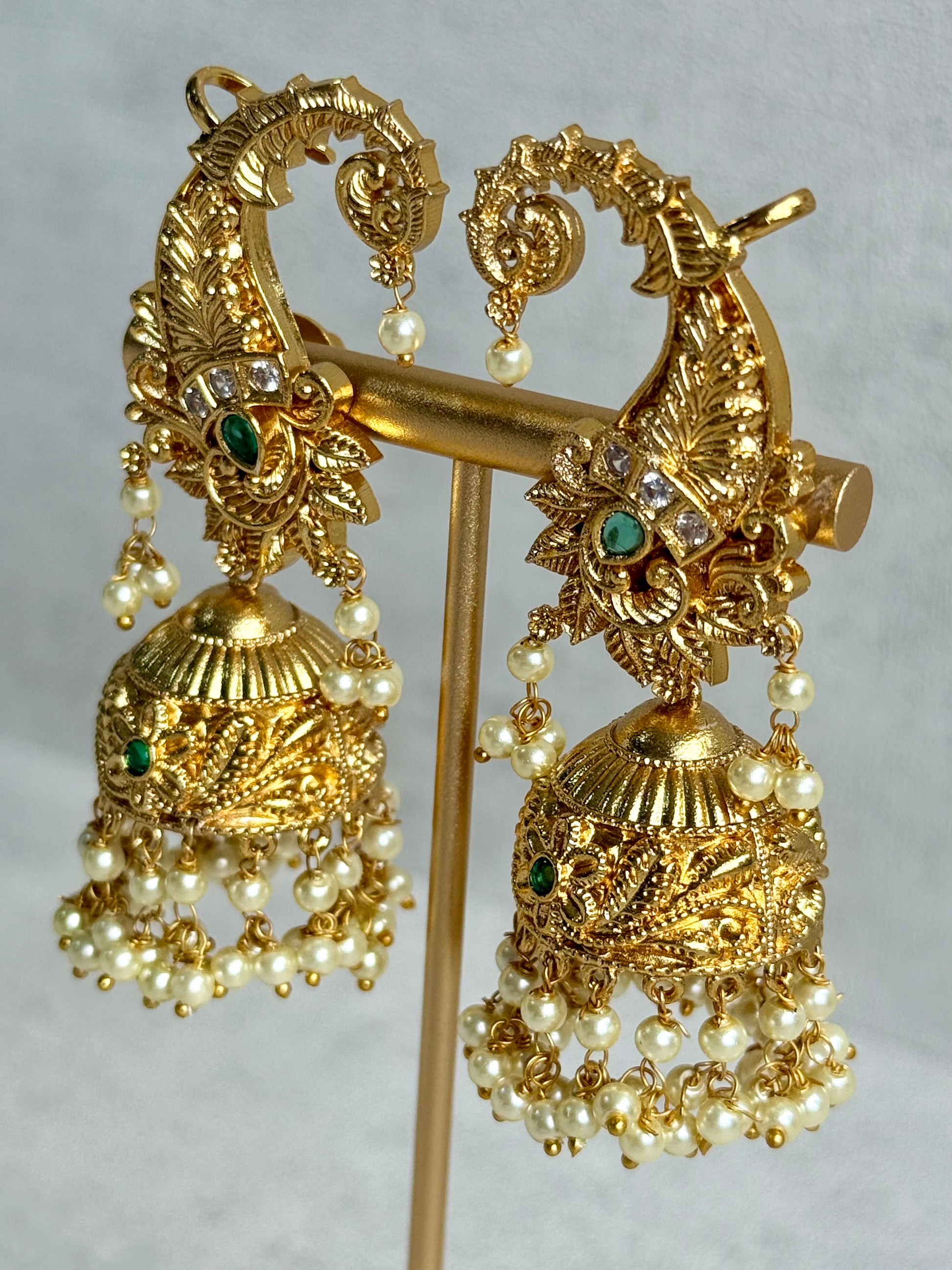 Deep green stone accents sit at the heart of the motif, adding depth and contrast against the gold base. The design flows seamlessly into a beautifully domed jhumka, finished with layers of soft pearl drops that sway gracefully with movement.