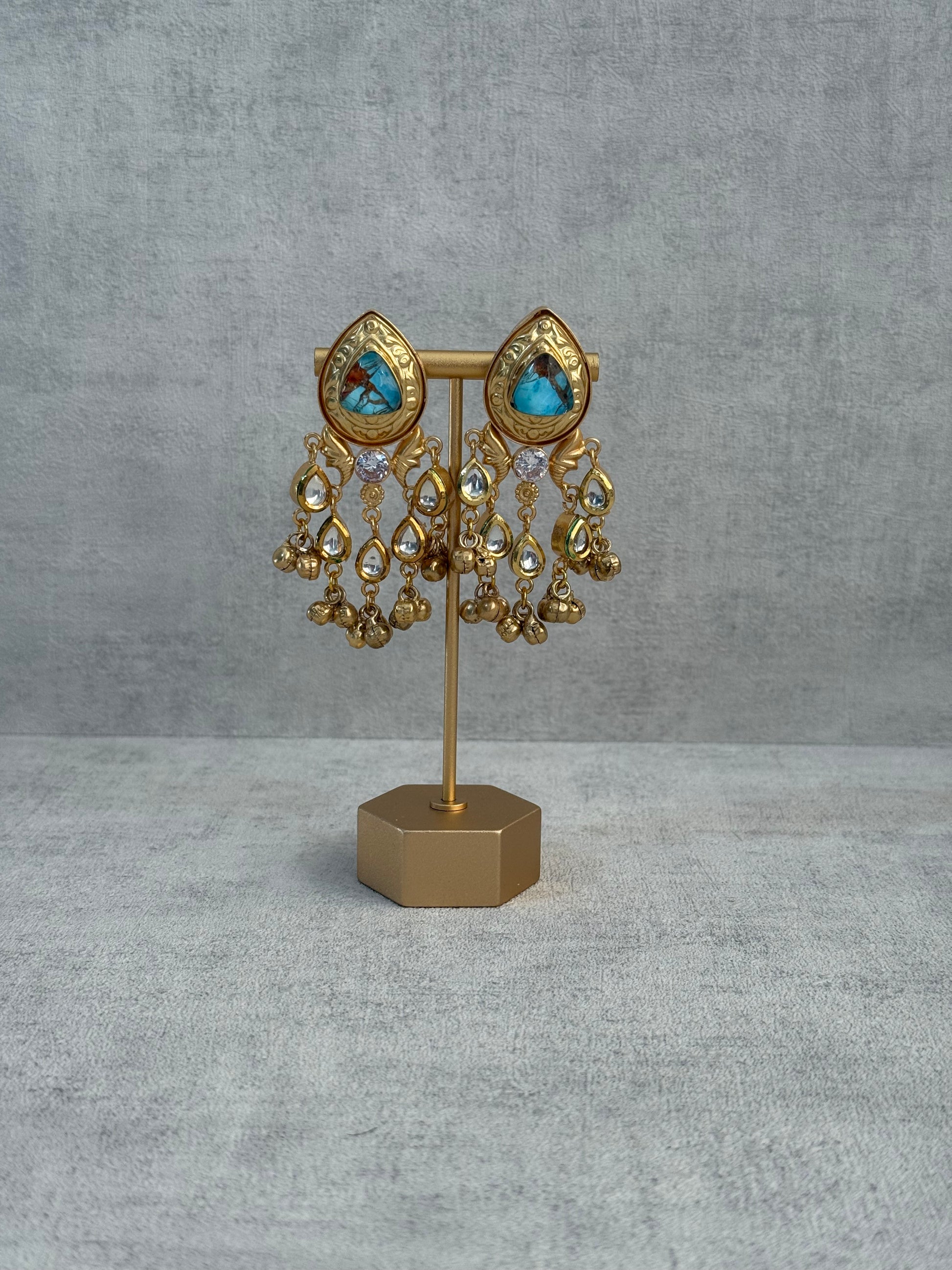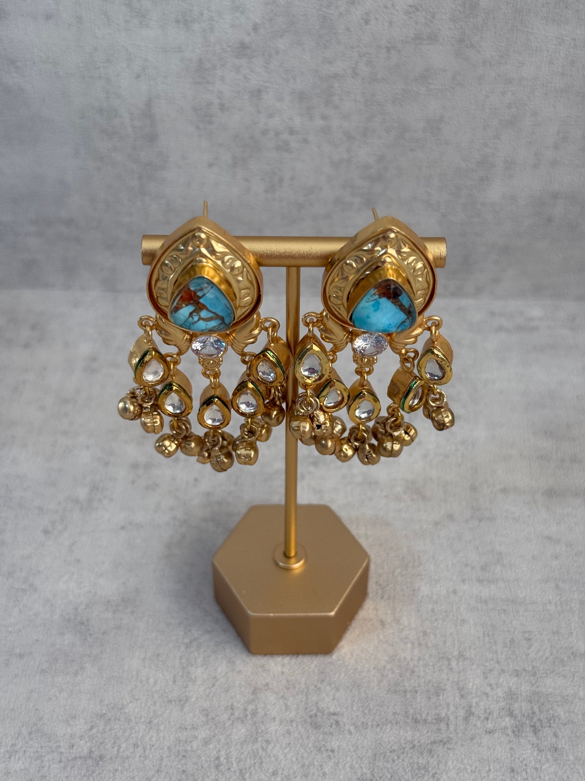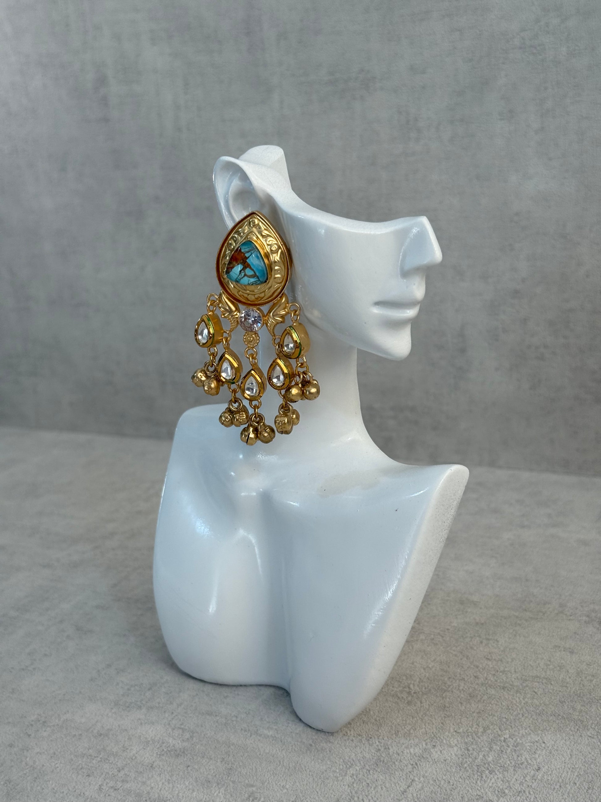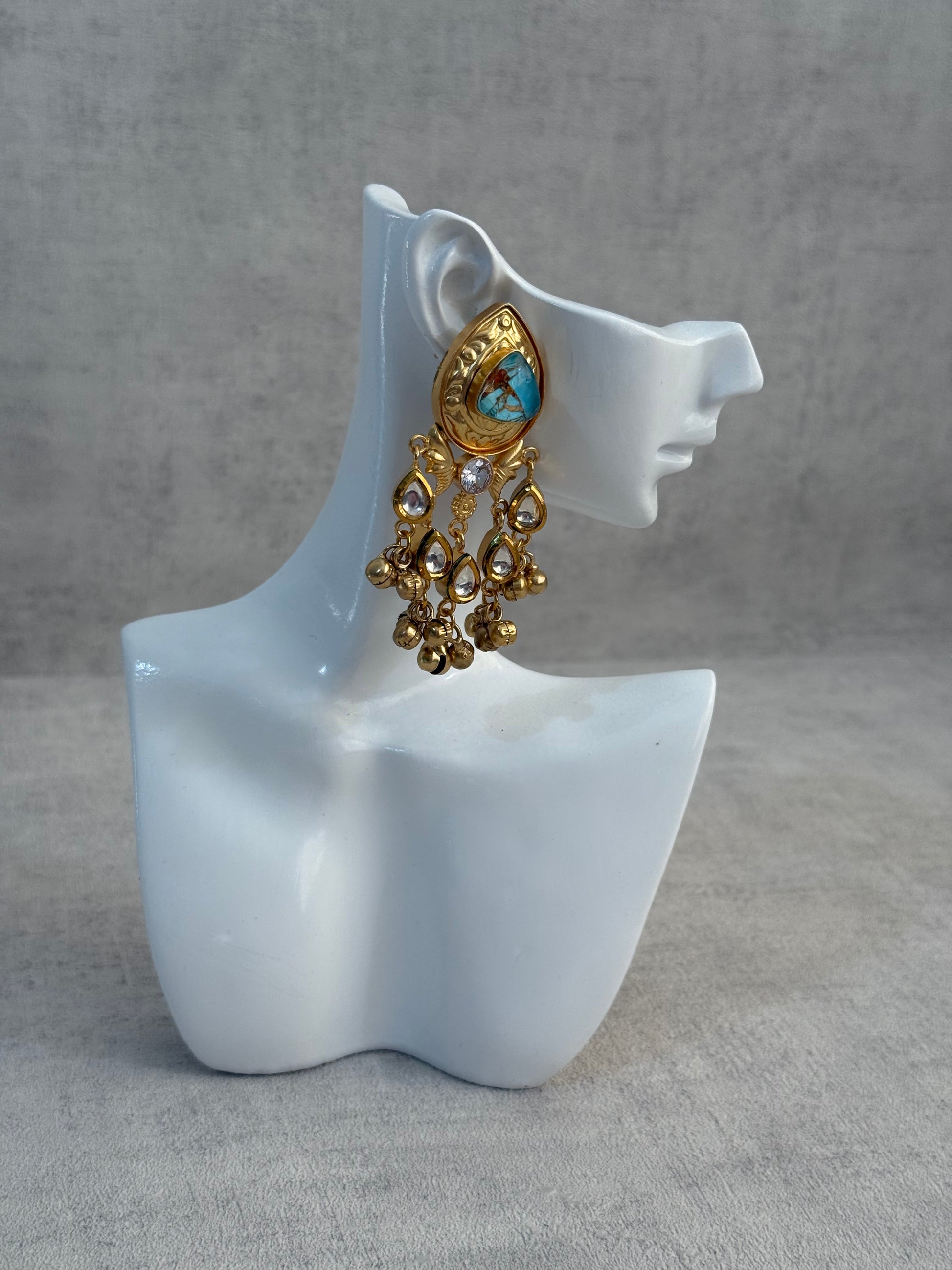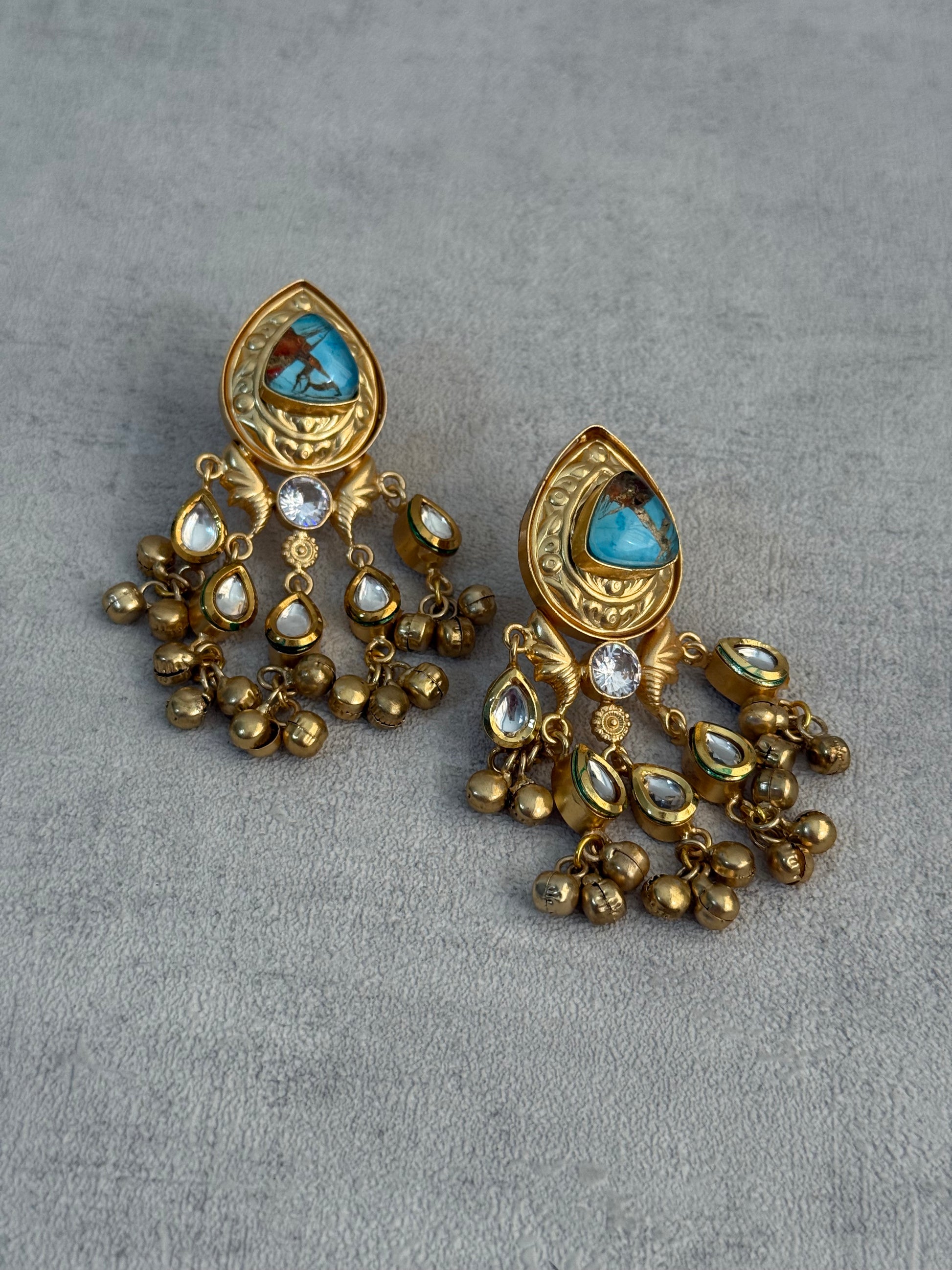 Perfect for weddings, festive celebrations, or statement styling, the Arheer Earrings bring together rich turquoise marble tones, luminous Kundan accents, and intricate ghungroo detailing to create a striking yet elegant piece.