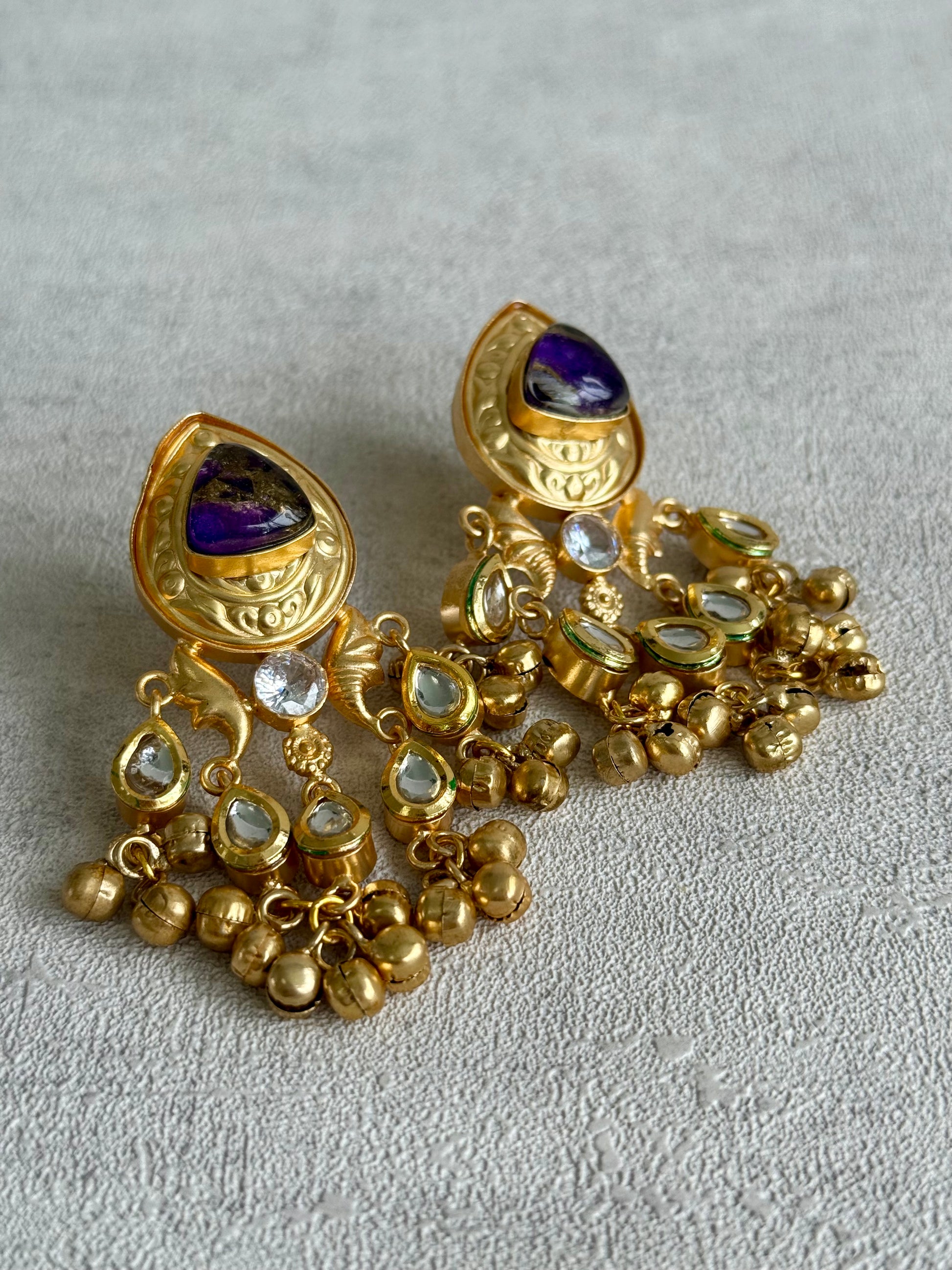 The Ayura Designs Arheer Earrings in Violet Marble radiate understated regality. The deep violet marbled stones, framed in antique gold and accented with kundan-set teardrops, evoke an old-world charm with a modern touch. At the base, the cluster of tiny ghungroos adds gentle movement and rhythmic grace.