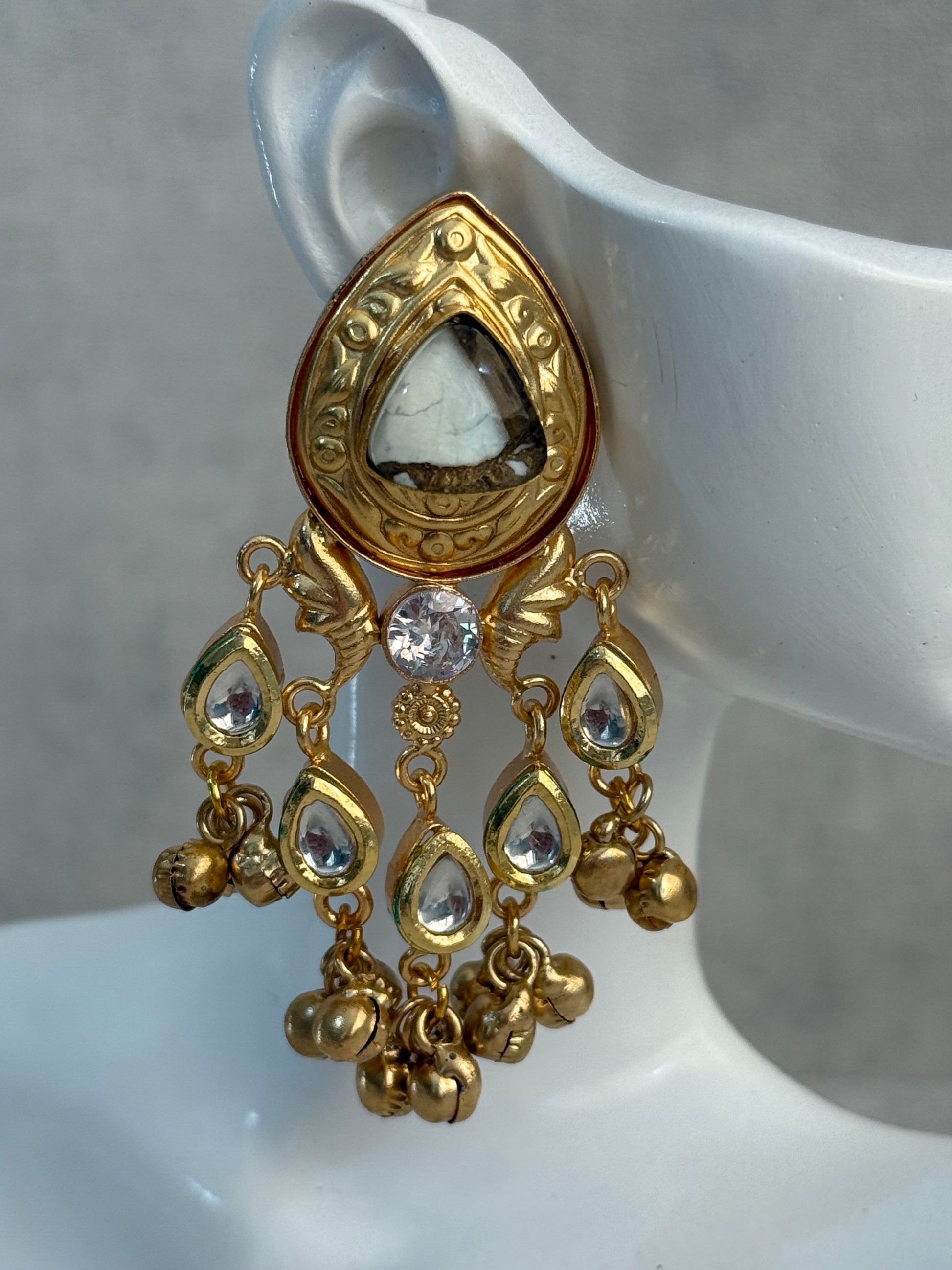 Delicate antique gold ghungroos complete the design, adding texture and a soft traditional jingle as they move. The combination of marble stone, Kundan accents, and ghungroo detailing creates a rich balance of heritage craftsmanship and statement styling.