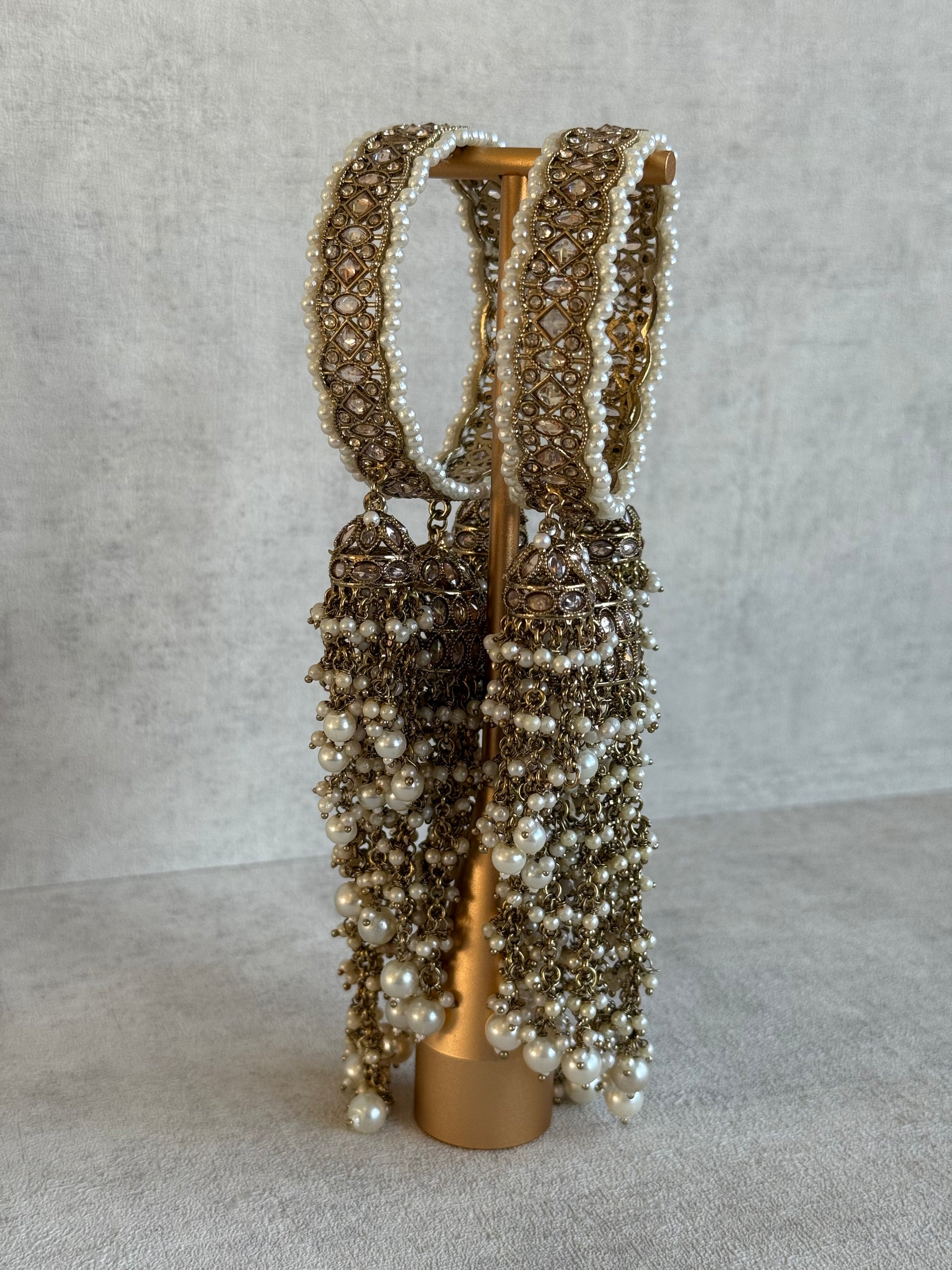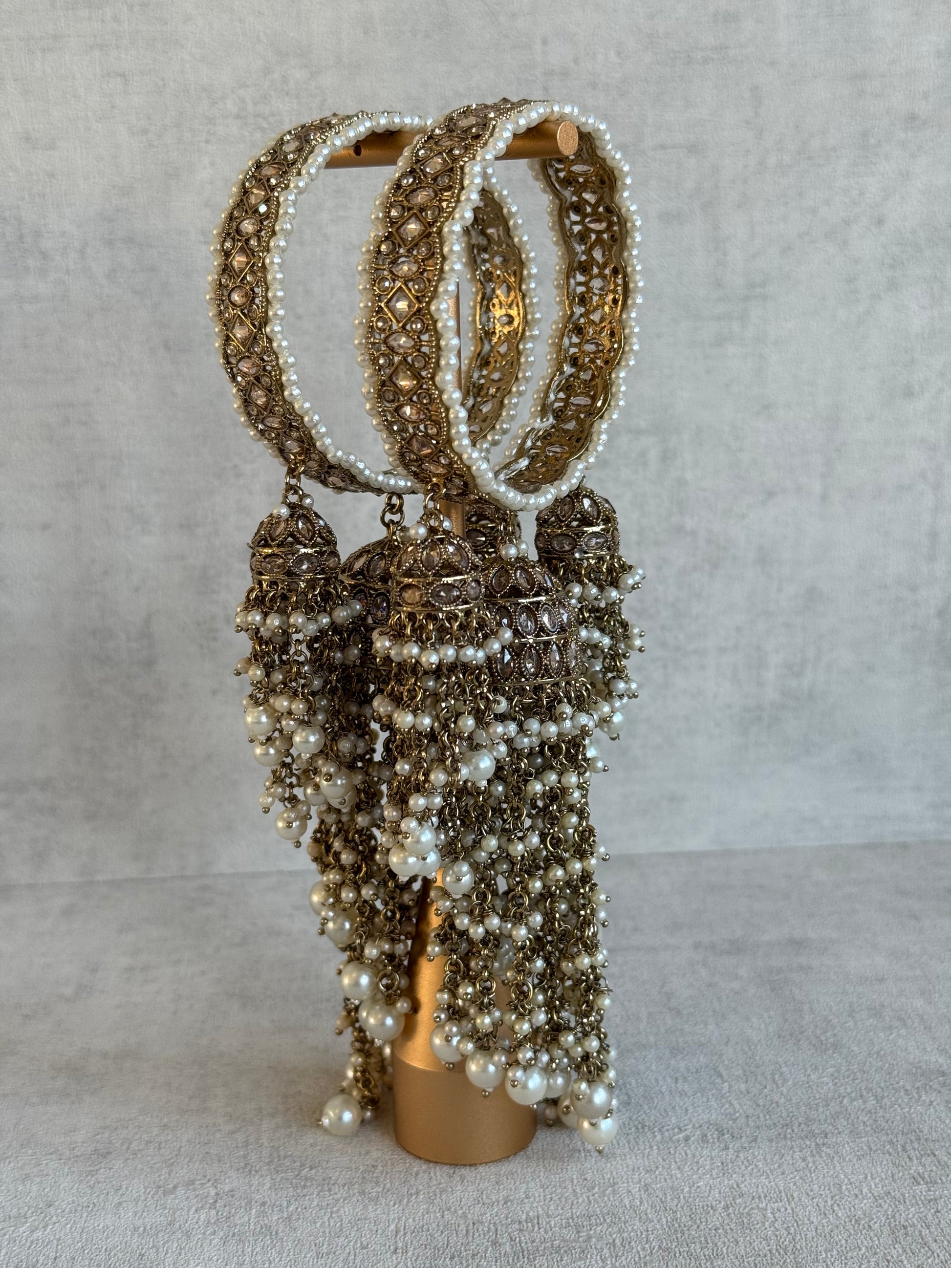 Suspended from the bangles are ornate jhumki charms, finished with cascading pearl tassels that move beautifully with every gesture. The layered chains and clustered pearls create a dramatic yet refined silhouette, perfect for elevating simple outfits or complementing heavier ensembles.