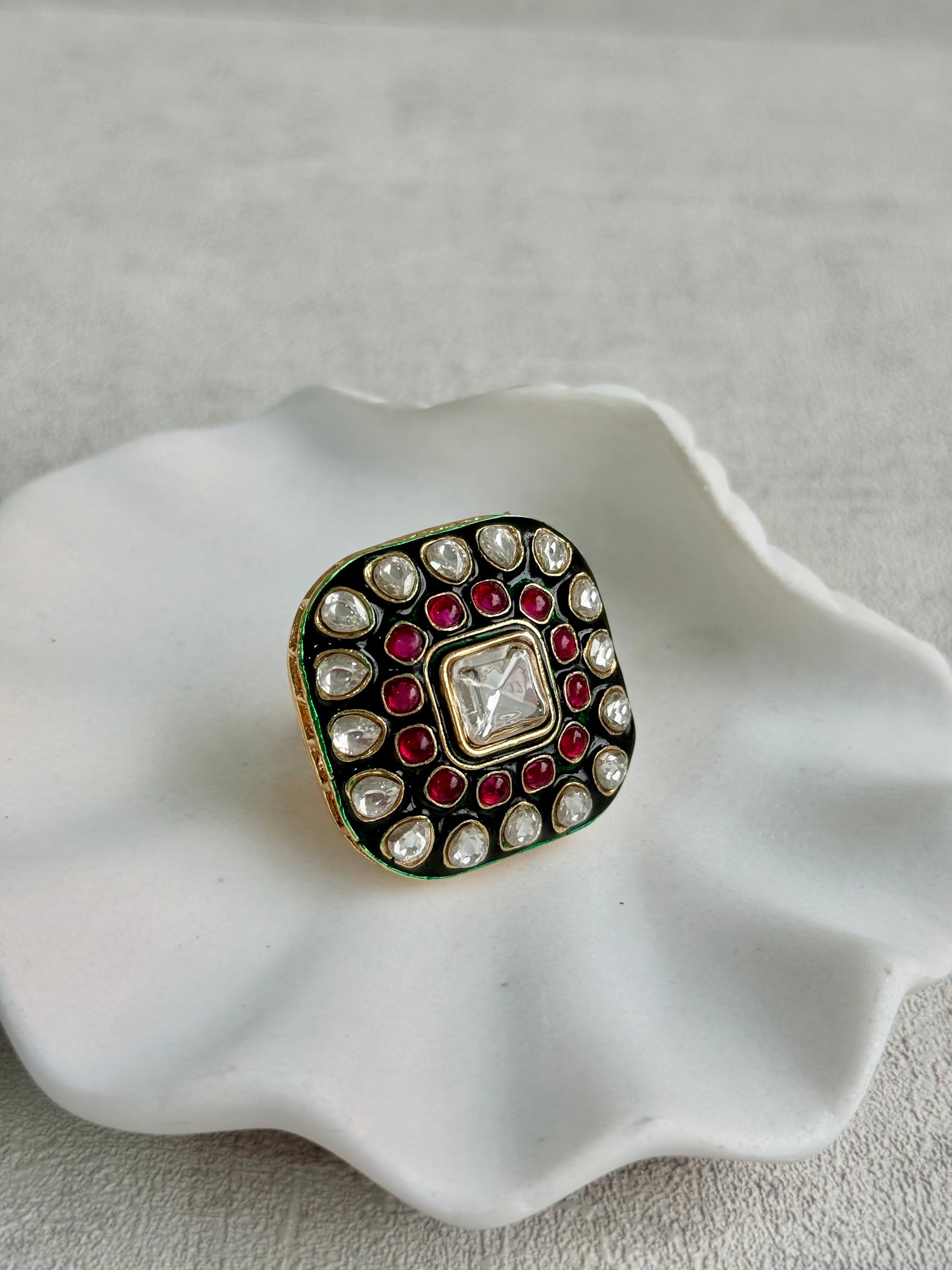 Ayura Designs Arzoo Adjustable Ring – Mirror-Cut Stone Centre with Ruby Pink Stones, Green Enamel & Crystal Detailing. This design features a bold square mirror-cut centre, encircled by vibrant ruby pink stones and finished with a border of shimmering crystal accents, all set against a deep green enamel base.