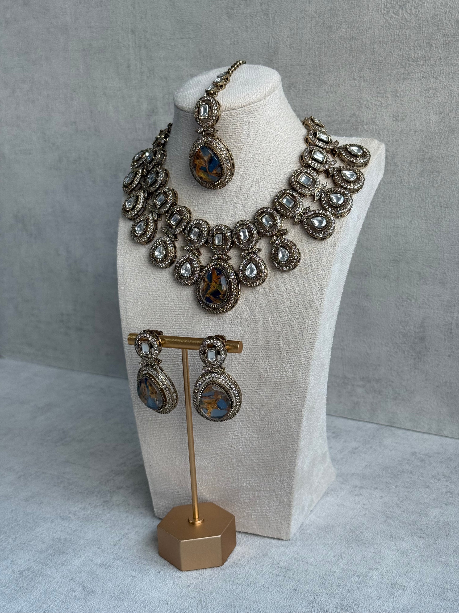 At the heart of the necklace lies a striking arrangement of teardrop and rectangular mirror-cut stones that reflect light like tiny mirrors, adding brilliance to the set’s rich colour palette. The necklace’s centrepiece showcases a trio of blue & bronze marble motifs, framed by glistening accents that shimmer with every movement. Coordinating earrings echo the same teardrop silhouette, while the tikka offers a perfectly balanced finishing touch to frame the face.