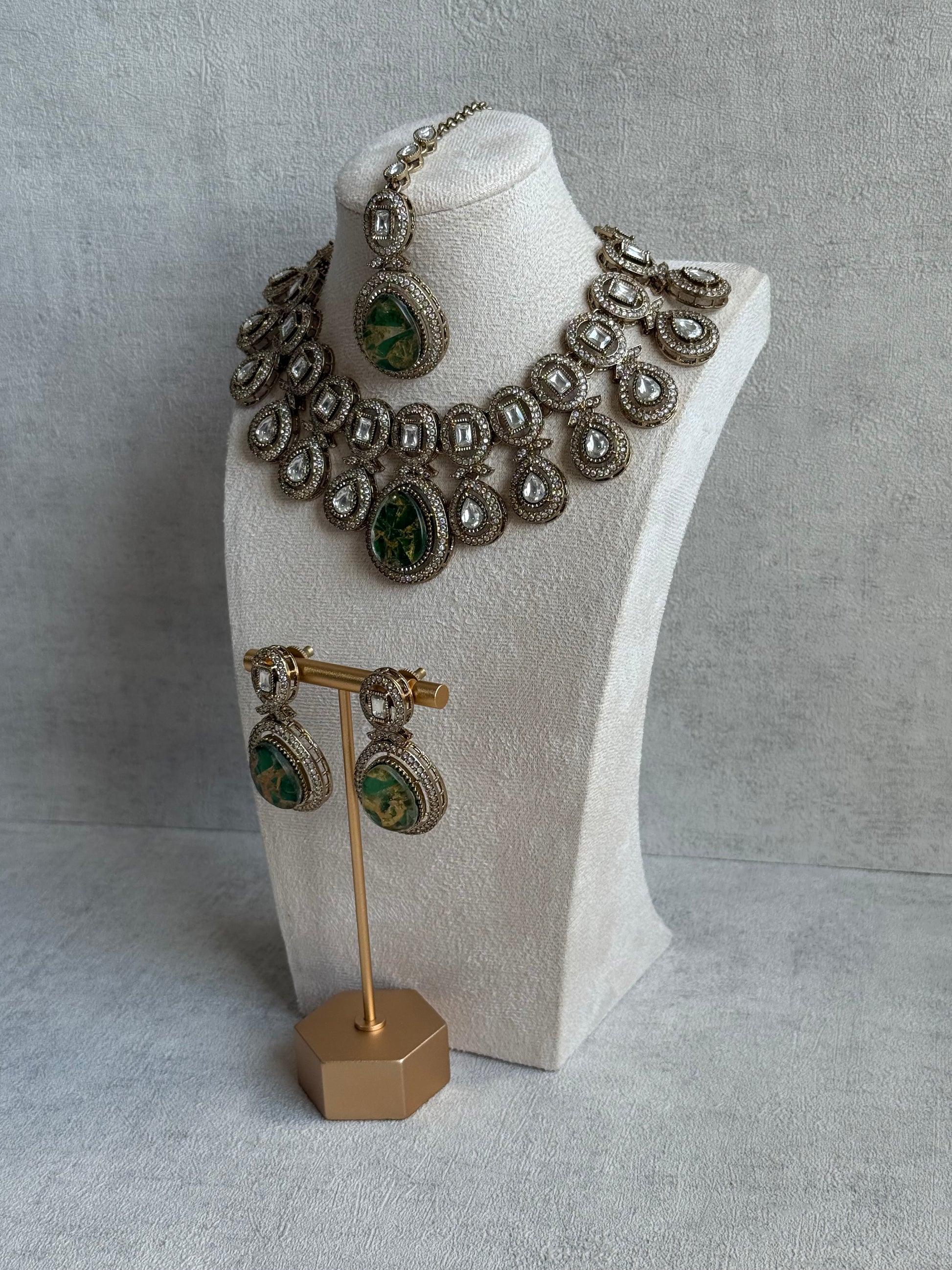 At the heart of this design is a vivid emerald-toned rectangular stone that instantly draws the eye. Its rich green hue is complemented by sparkling mirror-cut detailing that surrounds it in layers of glimmering light. The antique gold setting adds depth and a vintage-inspired warmth, enhancing the contrast and giving the entire piece a luxurious feel. Matching earrings and a balanced tikka mirror the same layout, making this a striking yet cohesive look from every angle.