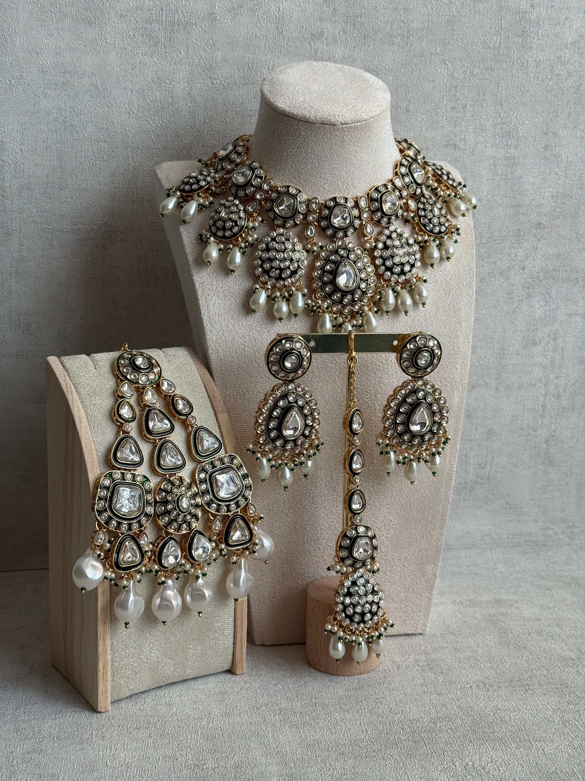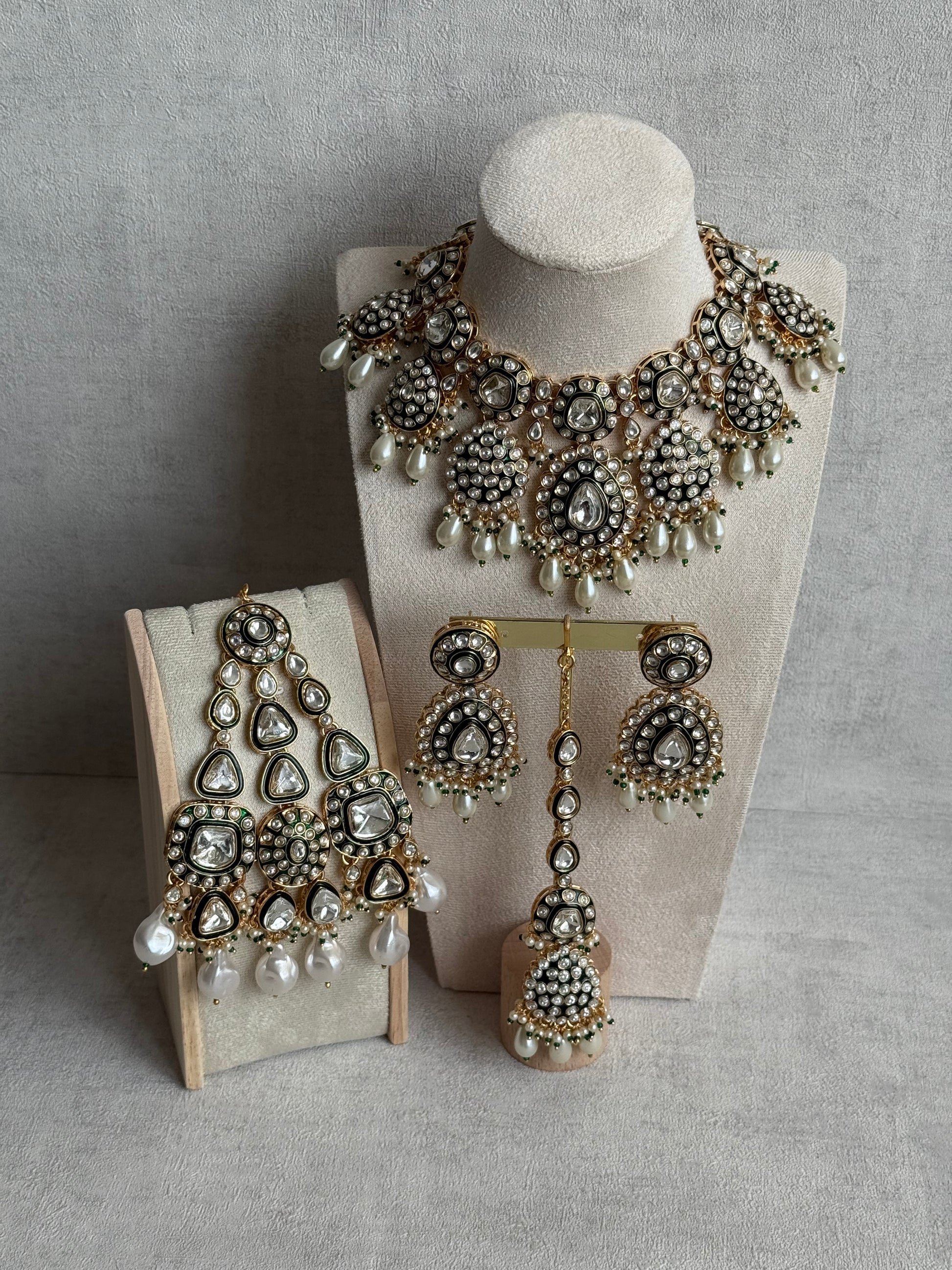 What makes this set unique is its meticulous detailing—from the domed kundan clusters to the lustrous ivory pearls that delicately line each border. The touches of emerald green give it a luxurious yet refreshing aesthetic, making it the ideal choice for brides who want to step away from traditional reds while still embracing bold, statement jewellery.