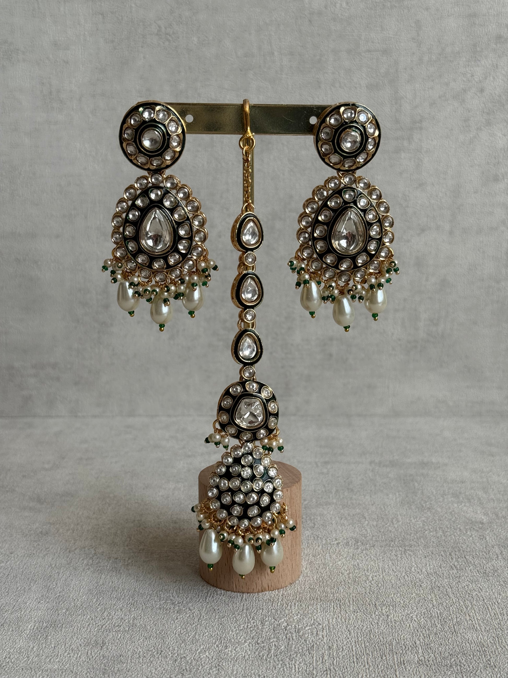Paired with bold matching earrings, a long statement tikka, and an intricately designed passa, the set creates a striking silhouette perfect for bridal wear. The emerald enamel elements are echoed throughout each piece, adding a regal richness and vivid contrast to the mirror-cut shine and kundan embellishments. The coordinated pearl drops and green beaded fringe complete the look with a graceful charm.