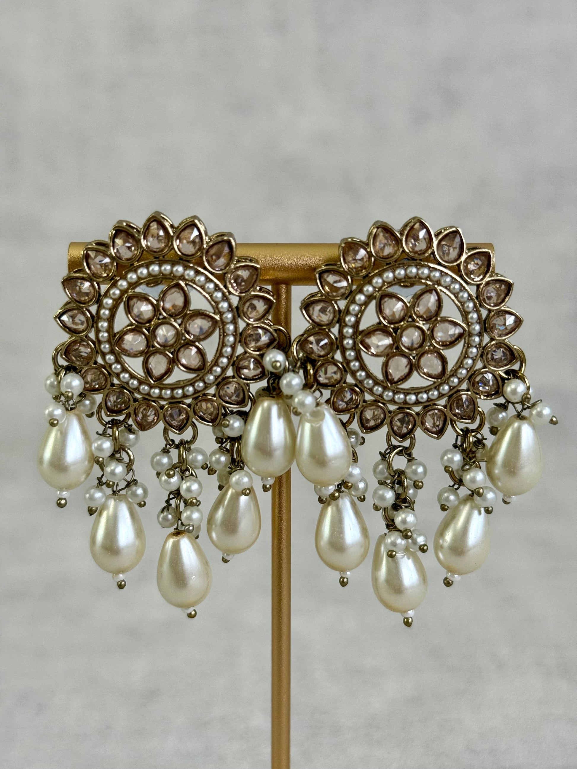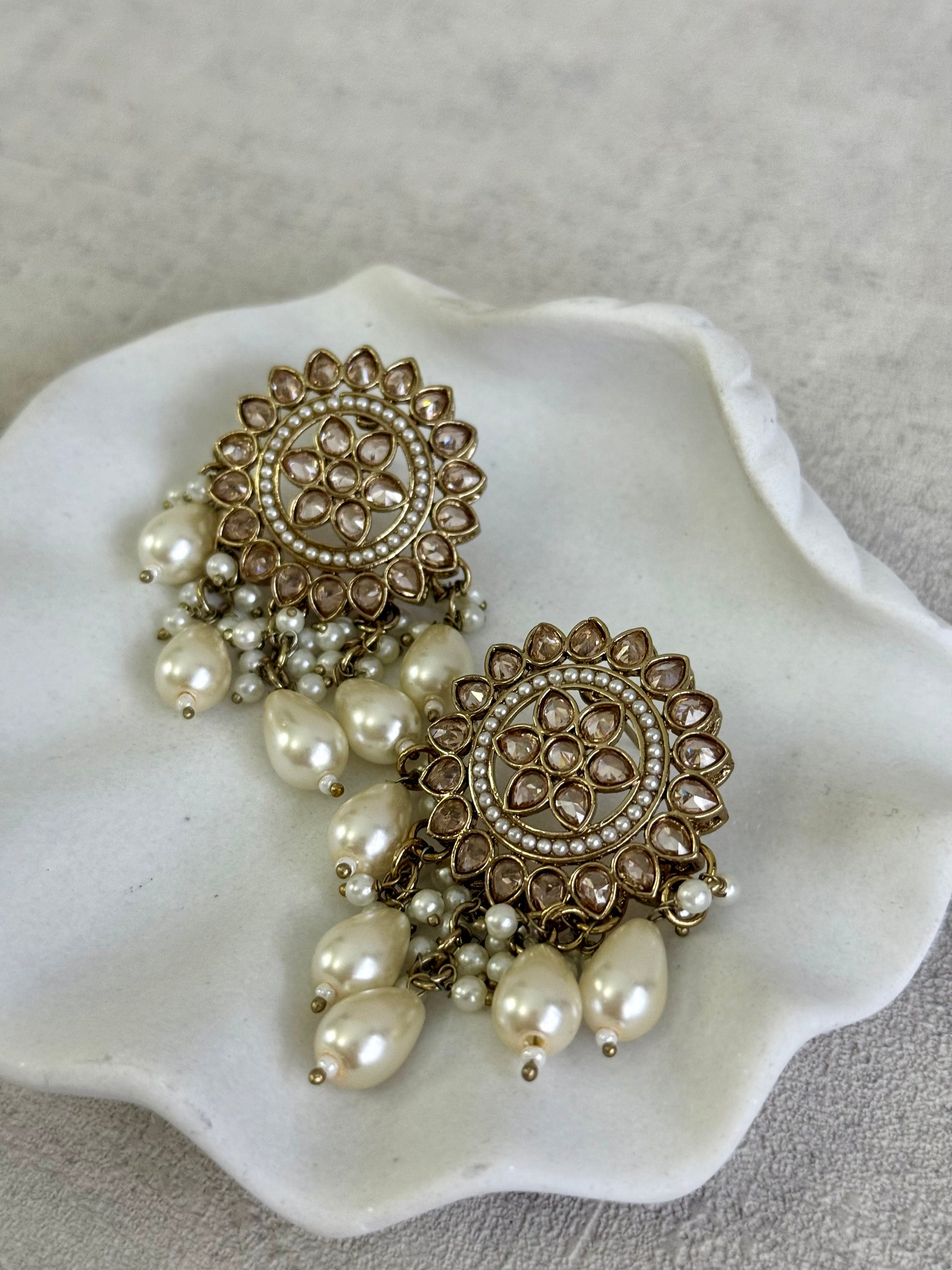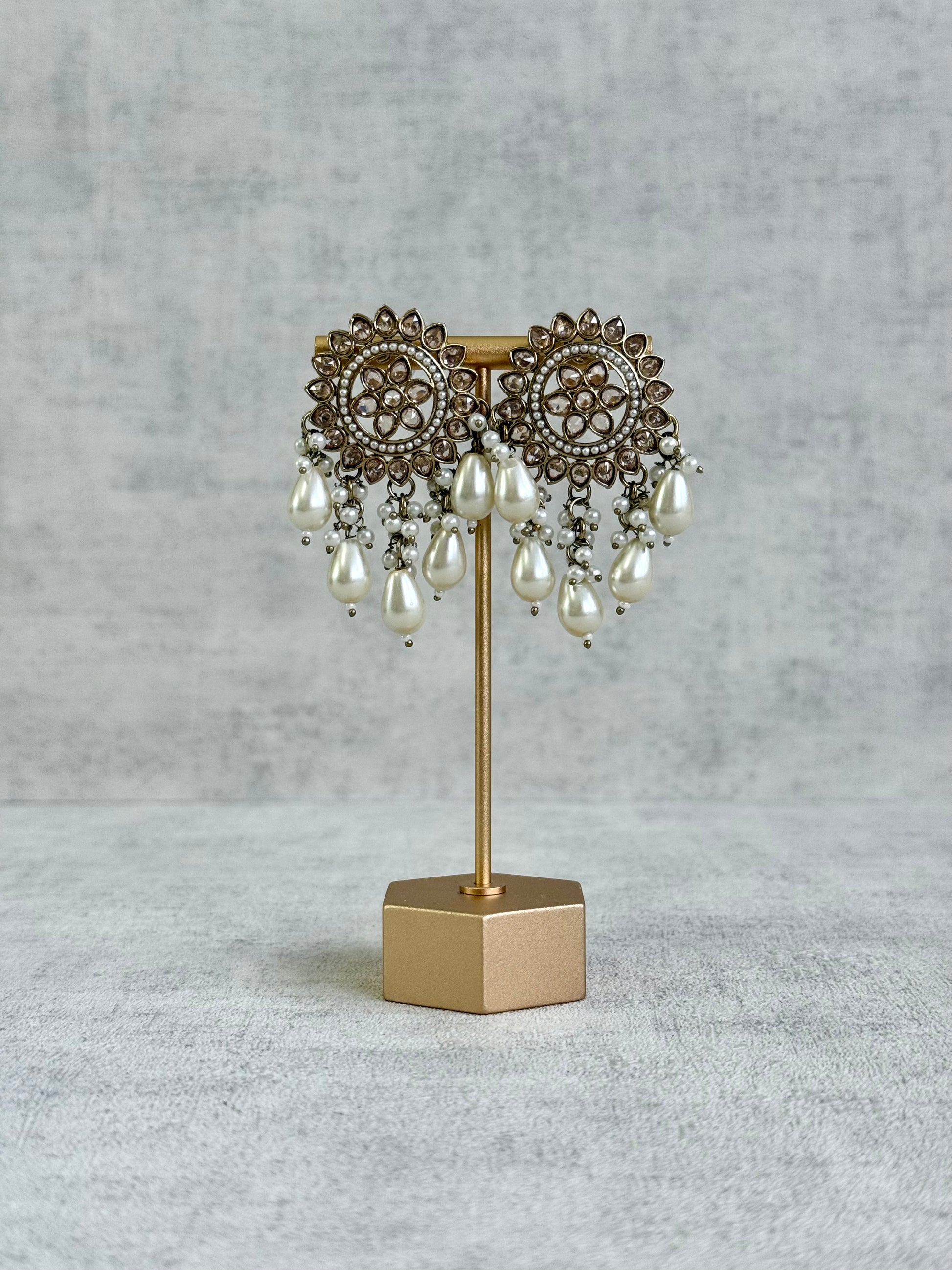 Ivory pearl drops fall gently from the base, creating elegant movement with every turn. Their soft lustre balances the intricate stonework beautifully.