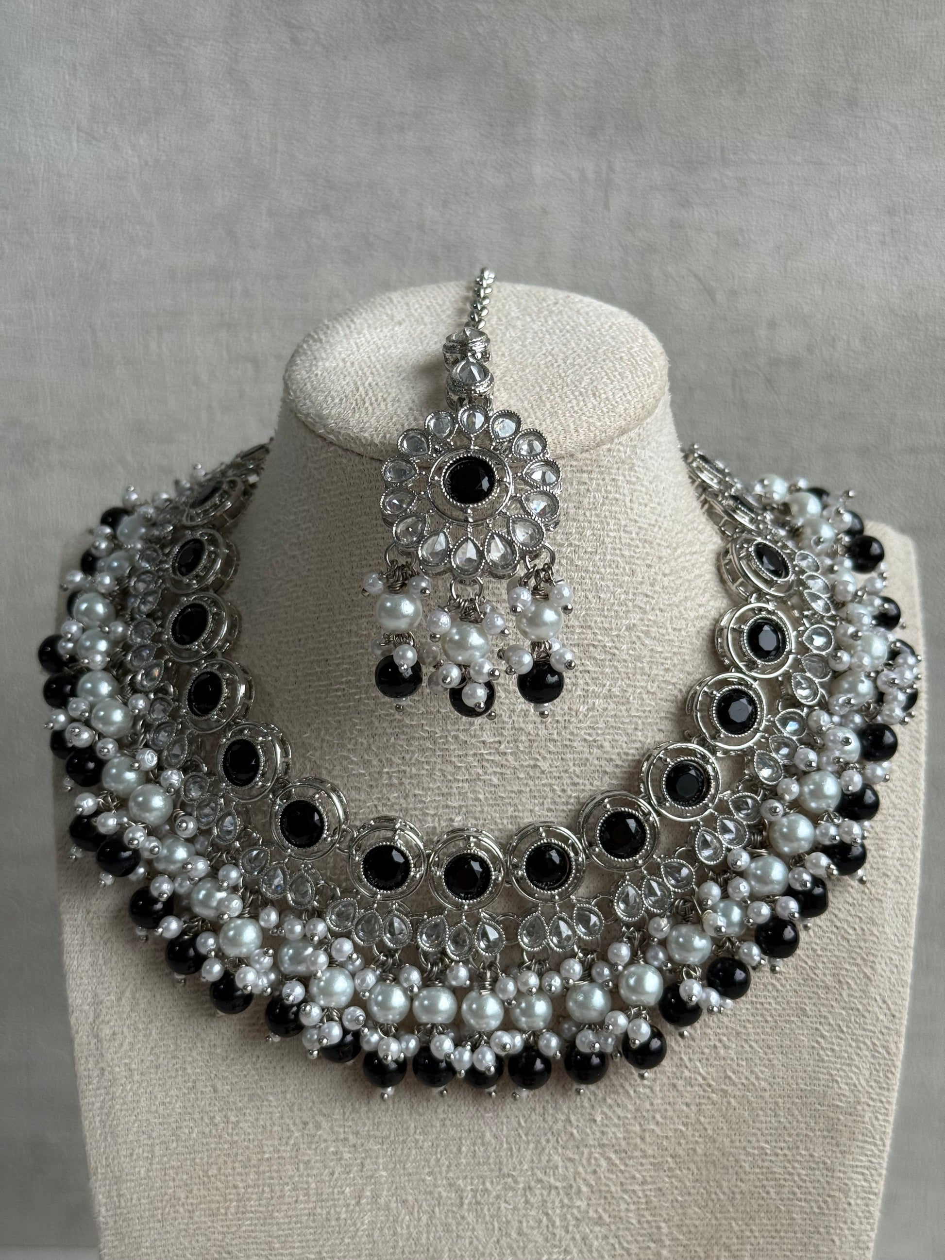 The necklace showcases mirror-cut accents interspersed with circular black stones, finished with layers of pearls for texture and volume. Its structured design ensures it stands out with any traditional or fusion outfit.