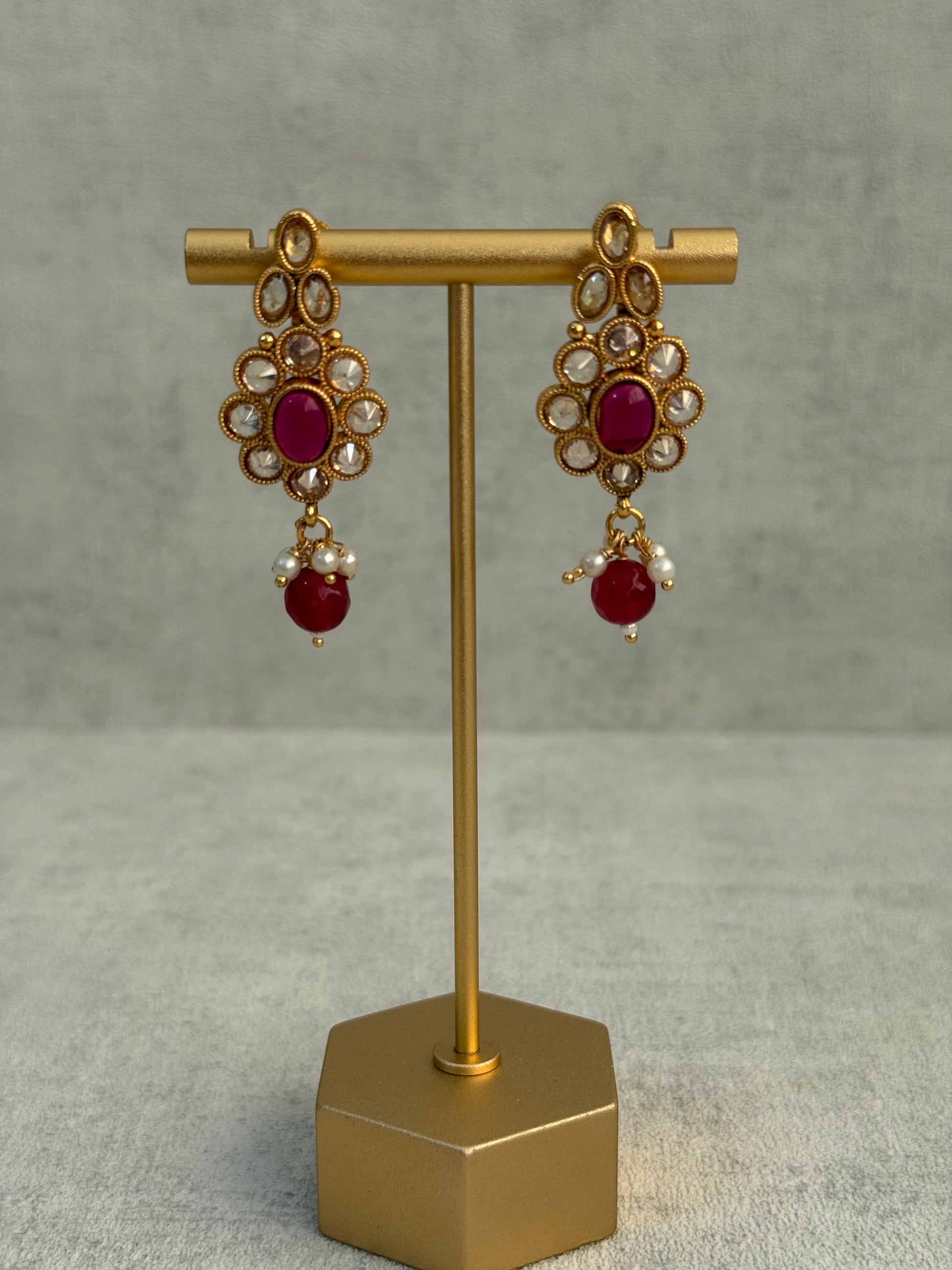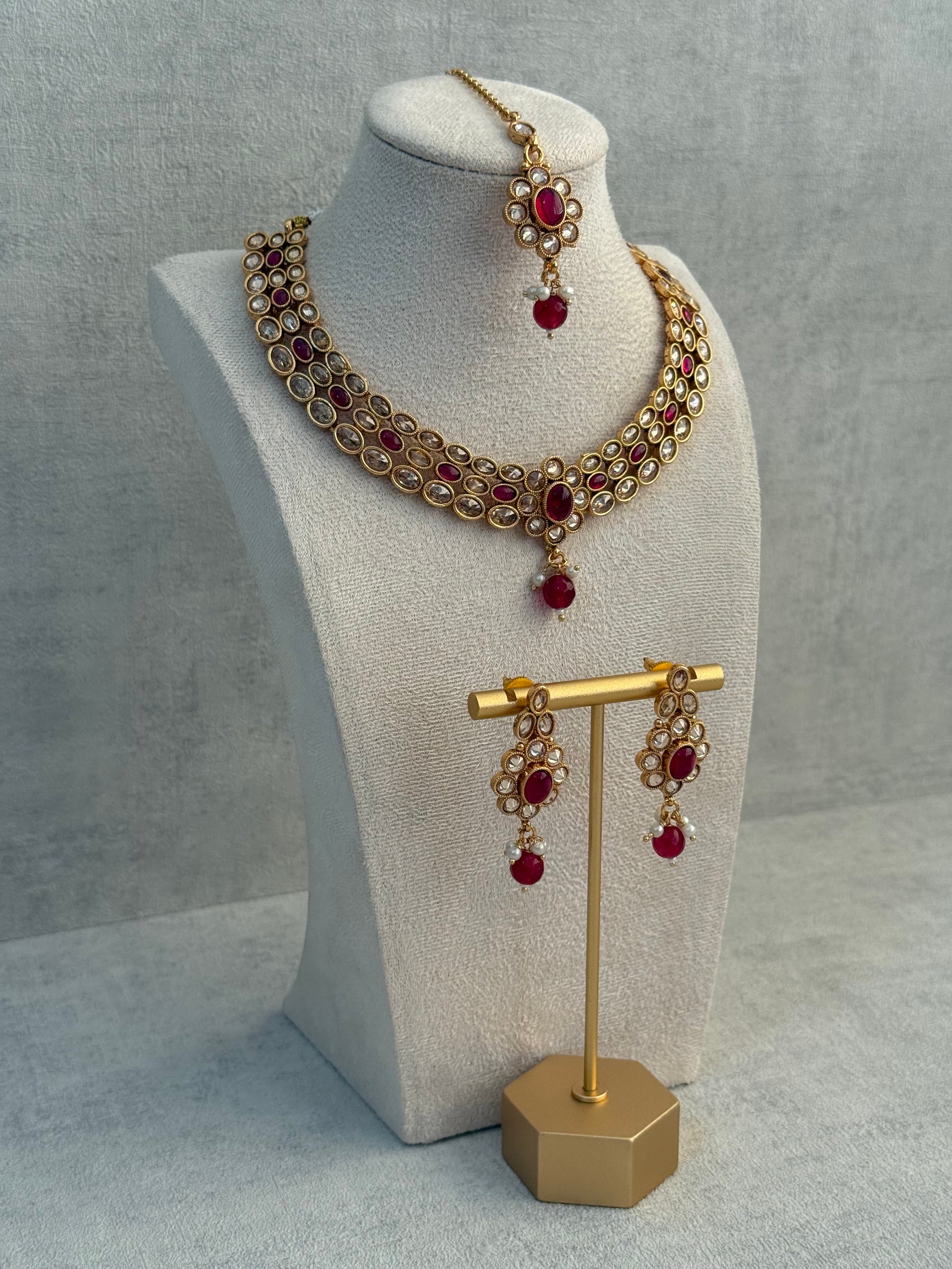 The necklace is crafted with alternating mirror-cut and fuchsia-toned stones, arranged in three delicate rows across a golden antique base. The floral pendant at the centre is both classic and commanding — echoing Mughal-era opulence with a playful twist of modern vibrancy. A fuchsia drop bead with tiny pearls finishes the necklace, drawing the eye to the neckline with every movement. It’s a piece made to glow under wedding lights, mehndi lanterns, or festive chandeliers.