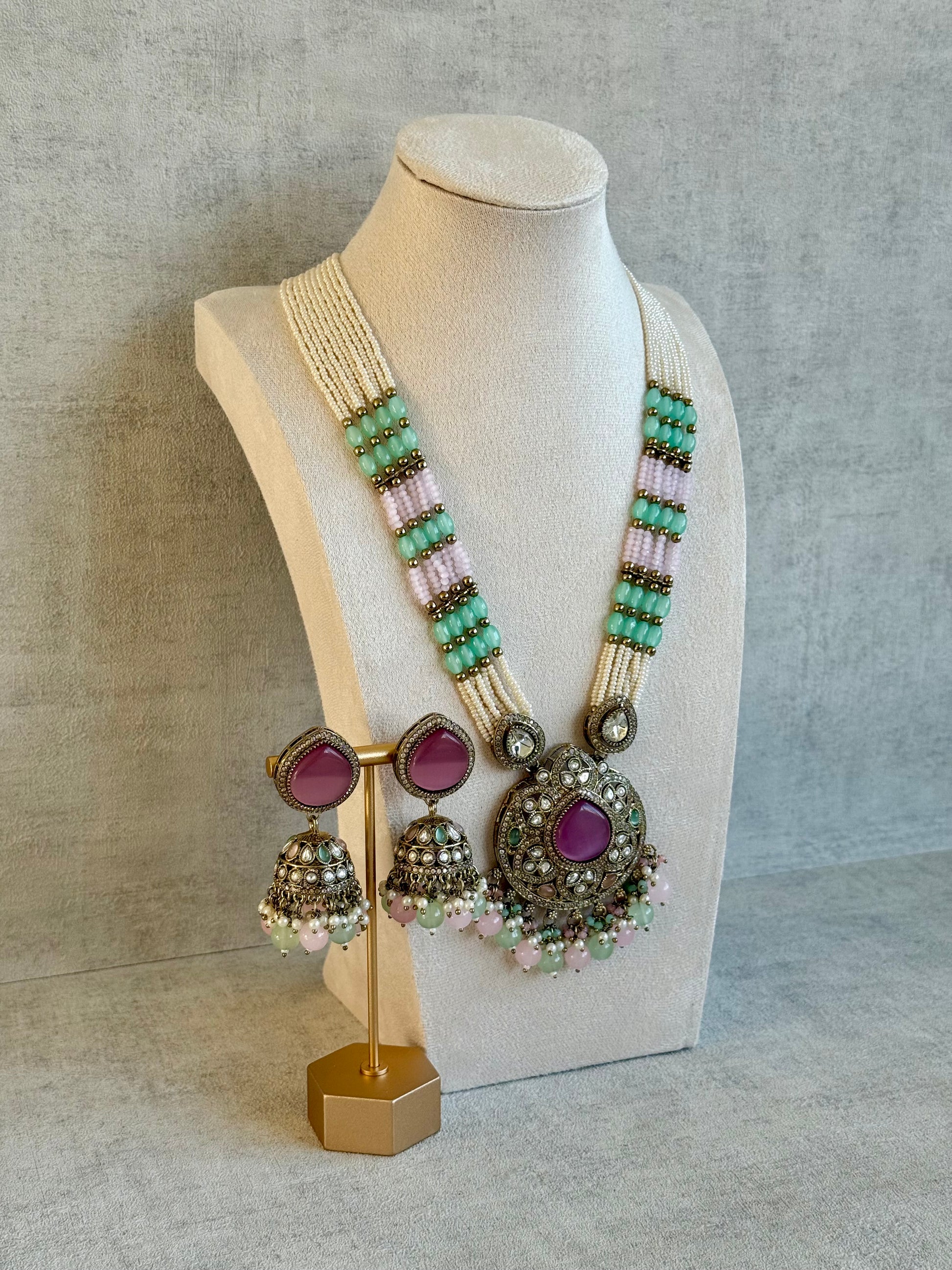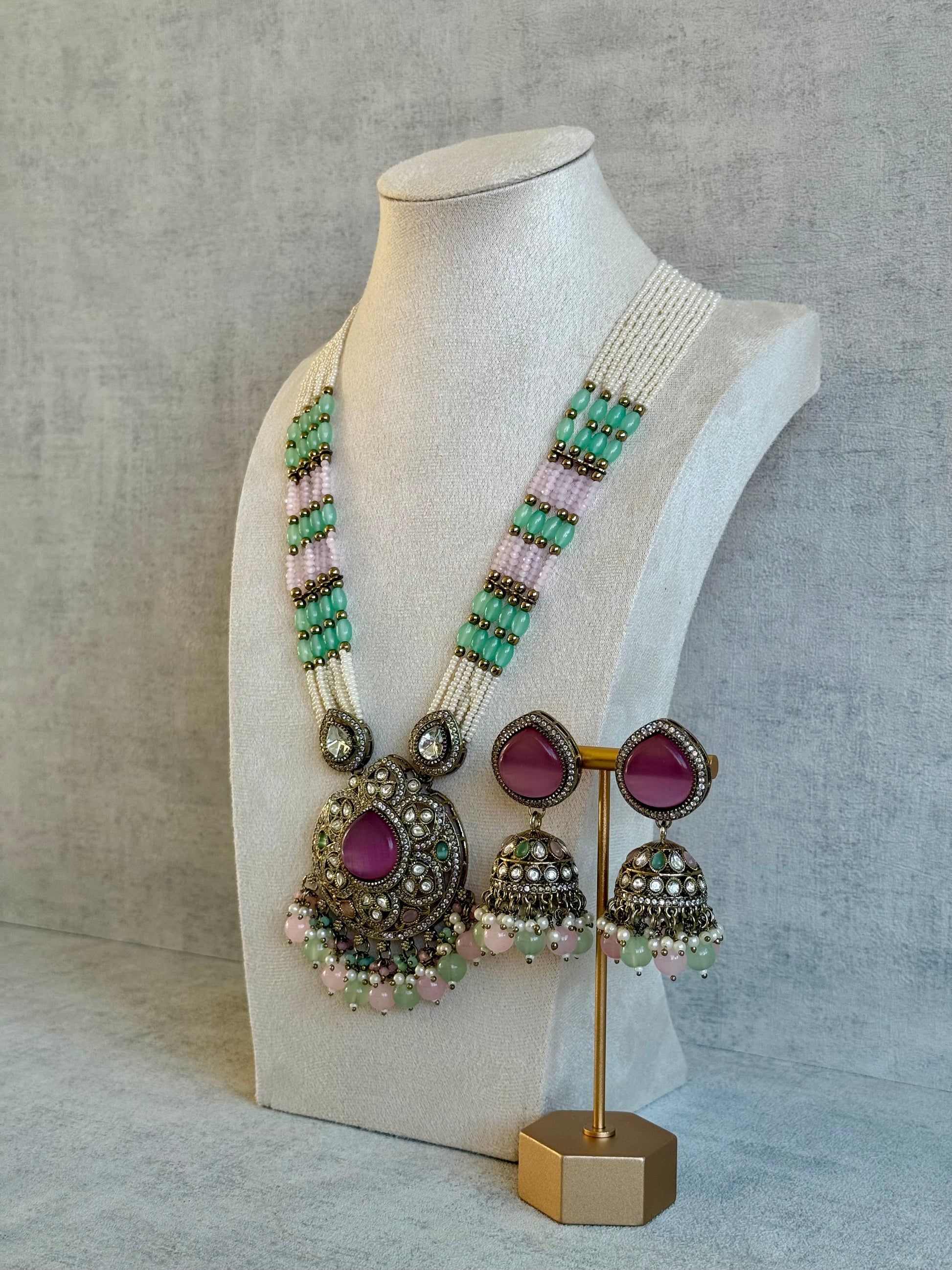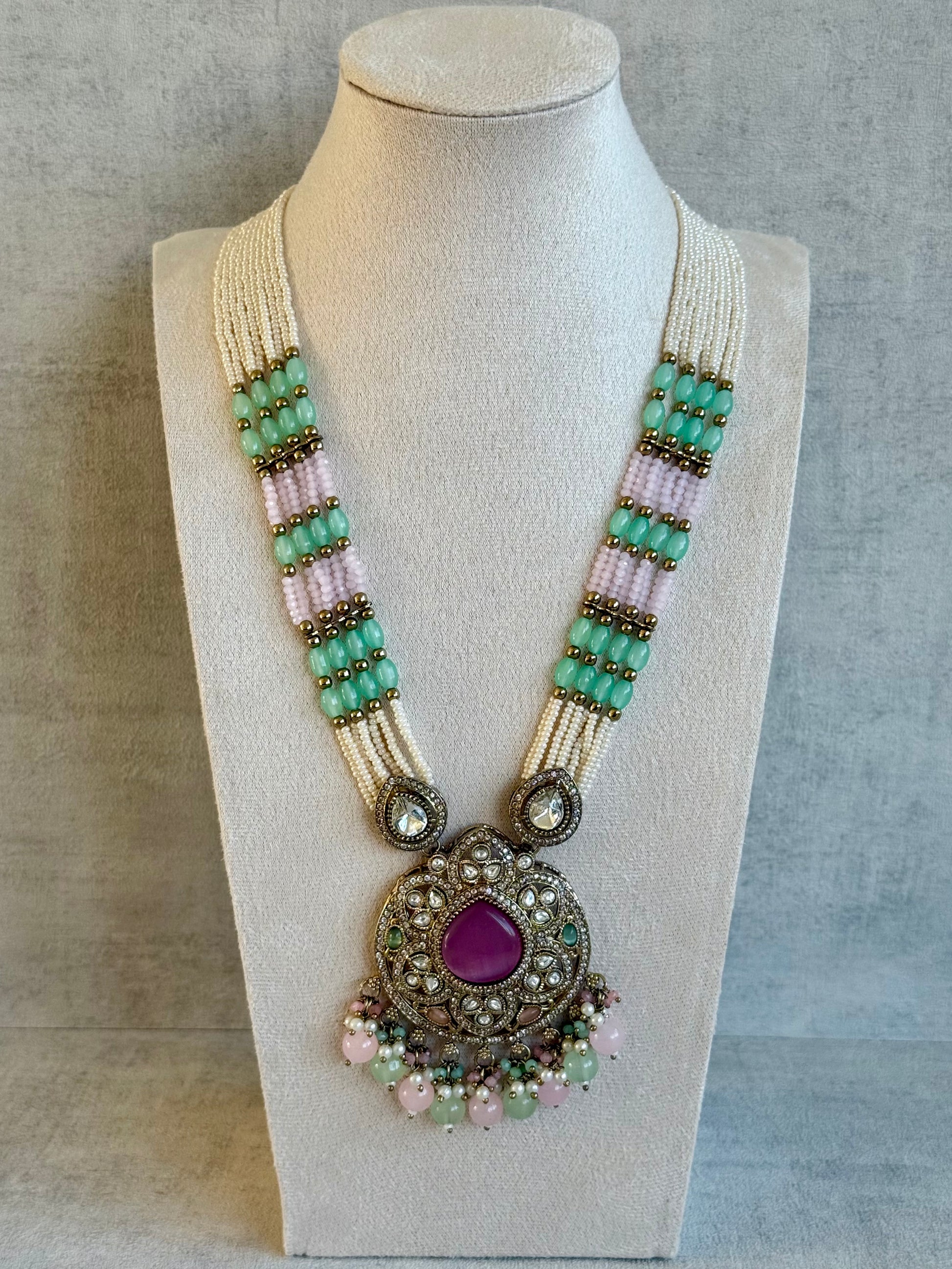 The Ayura Designs Brielle Set in Berry Pink, Mint Green & Ivory captures the beauty of springtime pastels through a heritage-inspired silhouette. The pendant features a luminous berry pink centre stone encircled by mirror-cut kundan detailing and hints of mint green, creating a look that feels both regal and refreshing. A cluster of ivory pearls, blush pink, and green beads add playful movement and elegance to every glance.