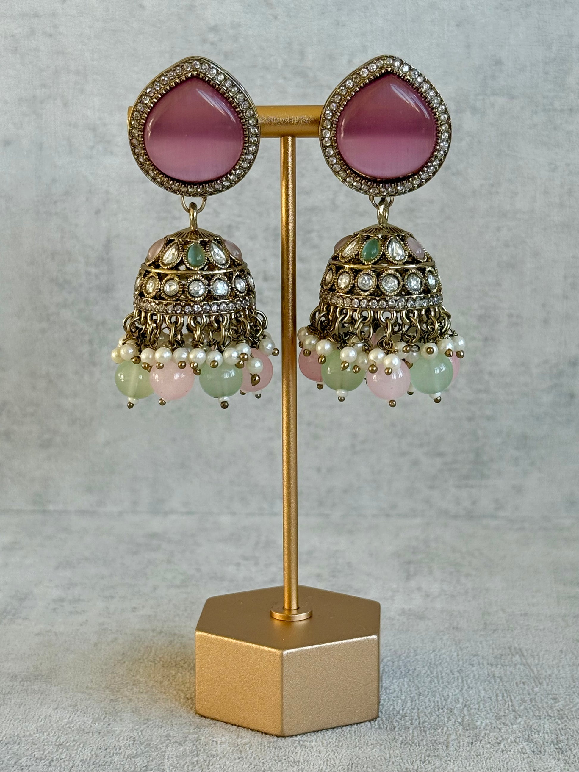 Ayura Designs Brielle Set – Necklace & Jhumkis with Mirror-Cut Stones in Berry Pink, Mint Green & Ivory