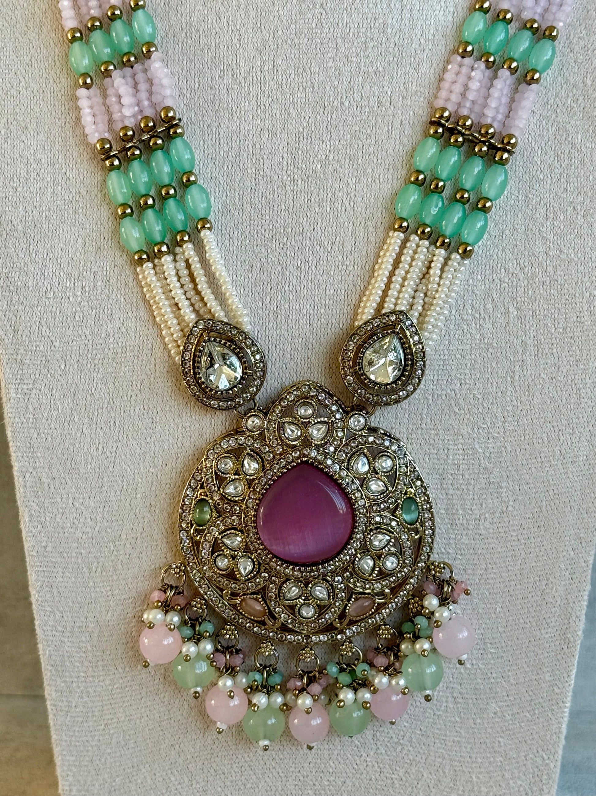 The matching jhumkis echo the same luxurious detailing, blending soft hues with antique gold craftsmanship. Each earring sways gently with clustered pearl and pastel beads, balancing delicacy with grandeur. The necklace’s layered strands of ivory pearls and alternating mint and blush tones further elevate its intricate beauty.