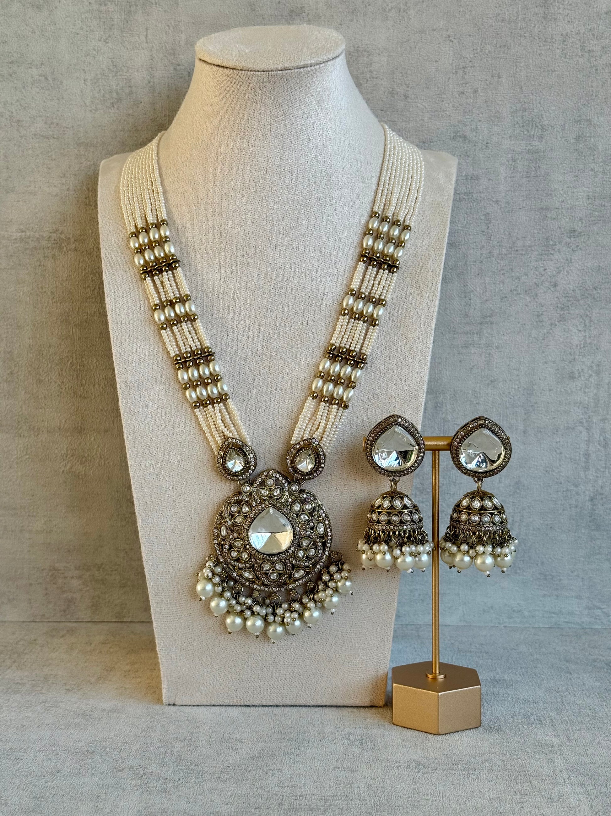 Ayura Designs Brielle Set – Necklace & Jhumkis with Mirror-Cut Stones & Ivory Pearls