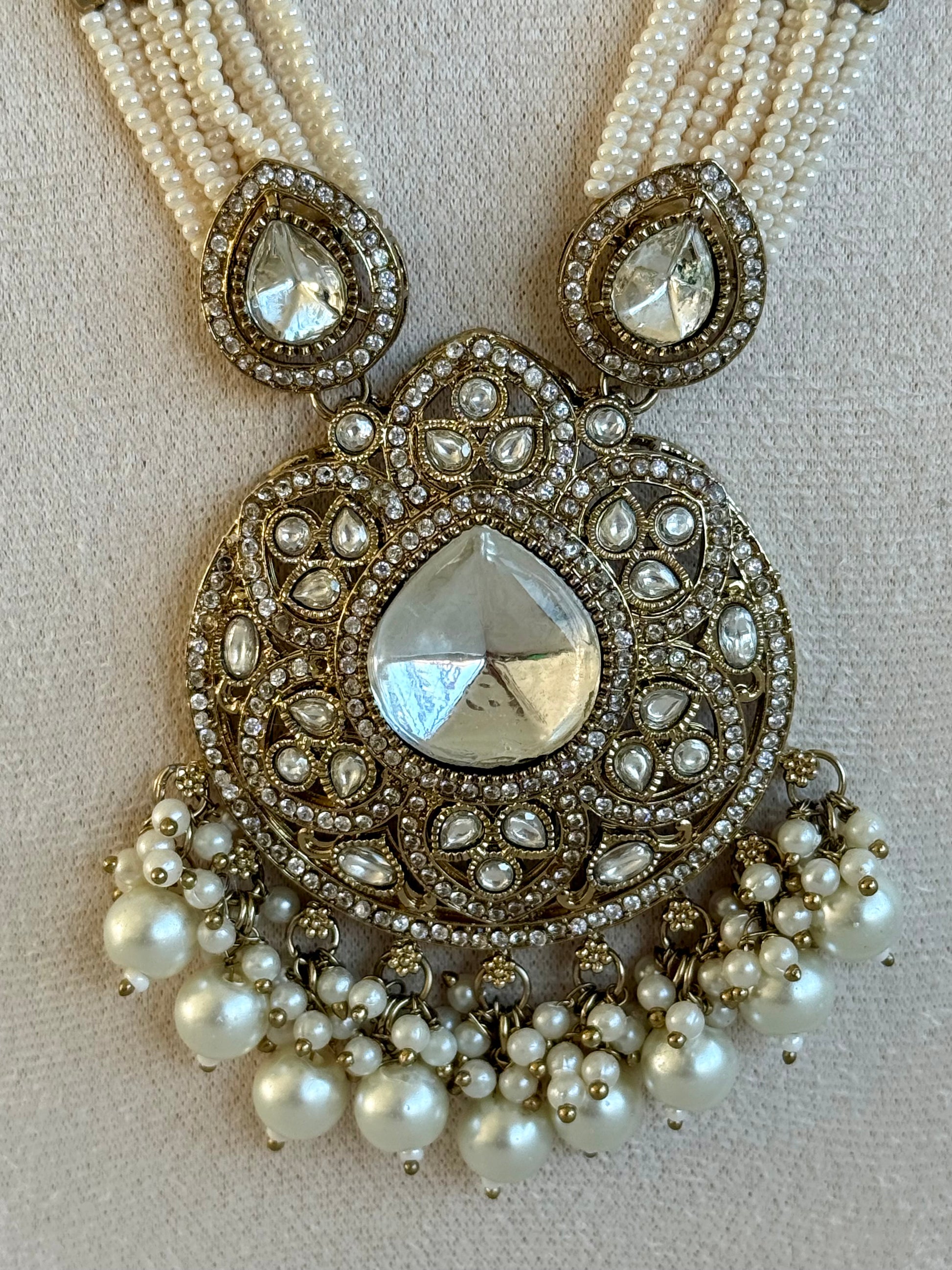 The Ayura Designs Brielle Set in Ivory is an ode to refined beauty and timeless elegance. The pendant features a large mirror-cut centre framed by intricate kundan motifs and soft antique gold detailing, enhanced by luminous pearl clusters that add classic charm to the piece.