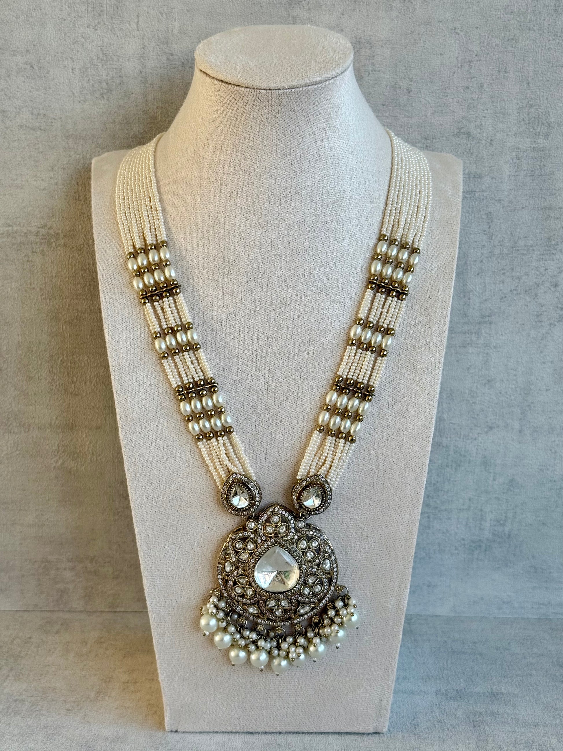 The multi-strand necklace pairs glossy ivory beads with delicate seed pearls, creating a look that feels both opulent and effortless. The accompanying jhumkis echo the same mirror-cut brilliance and pearl embellishments, striking a balance between statement and sophistication.