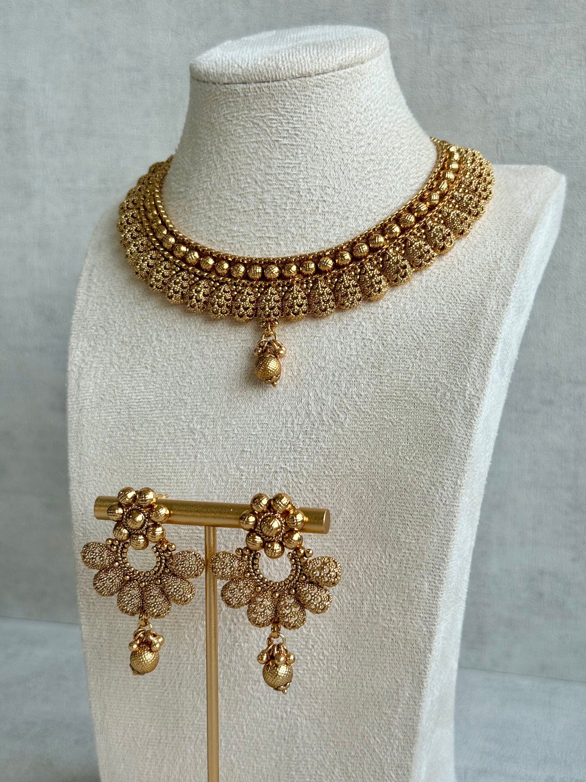 Ayura Designs Chirag Necklace Set with Earrings – Matte Gold Textured Dome Drops