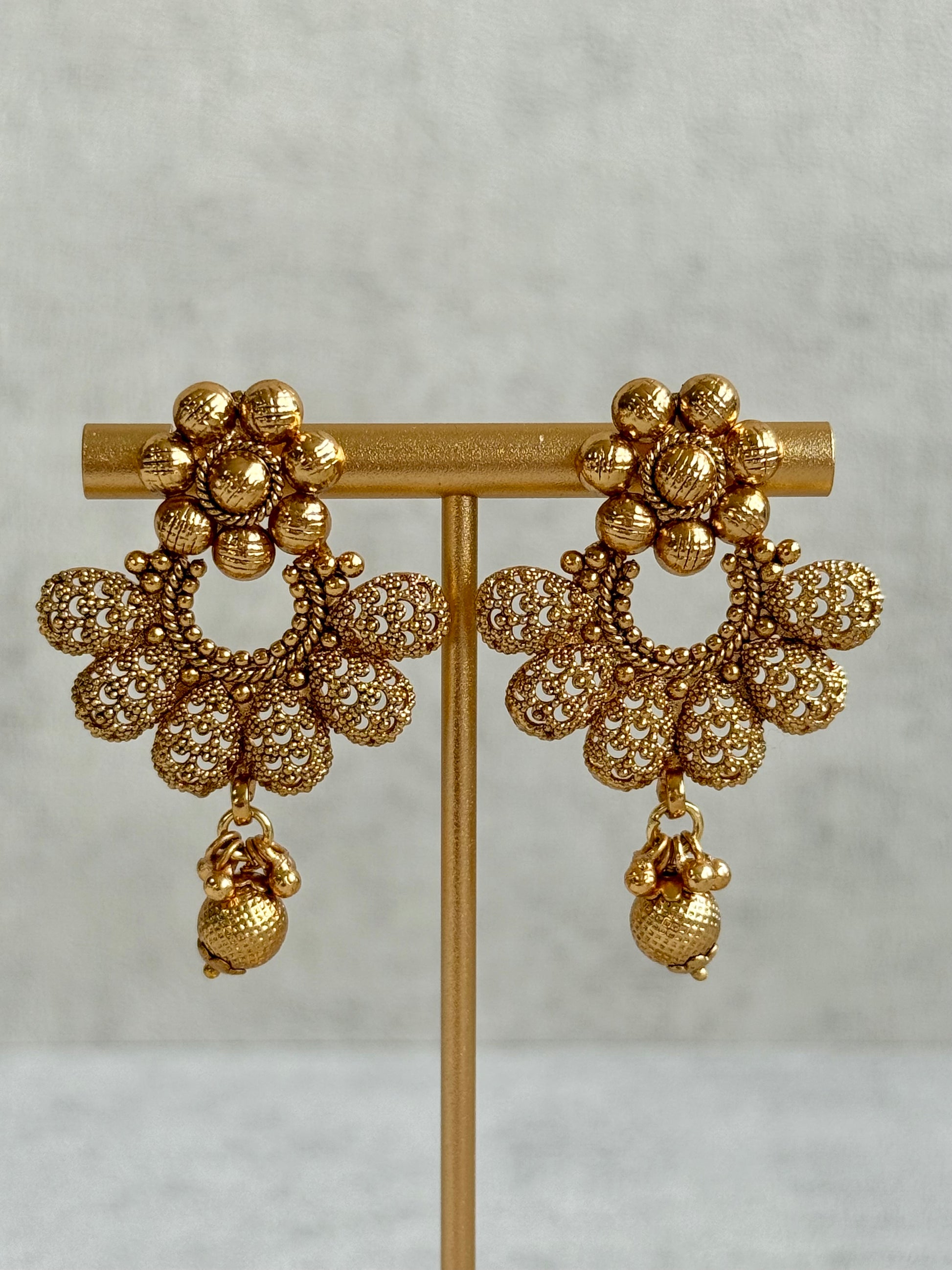 The matching earrings echo the same aesthetic, featuring floral-inspired tops with layered dome danglers. They offer the perfect balance between statement and subtlety, adding just the right touch of tradition to your ensemble.