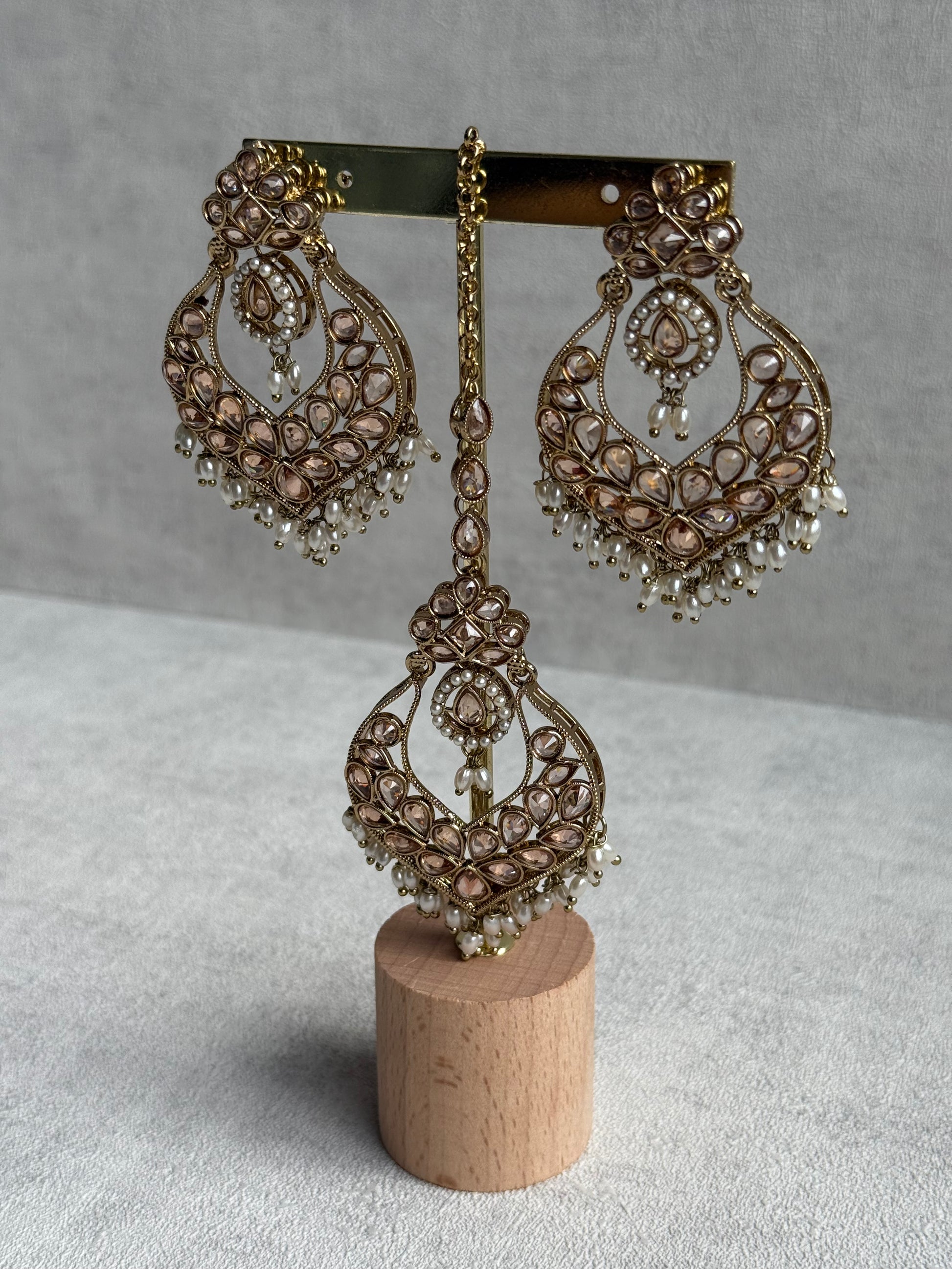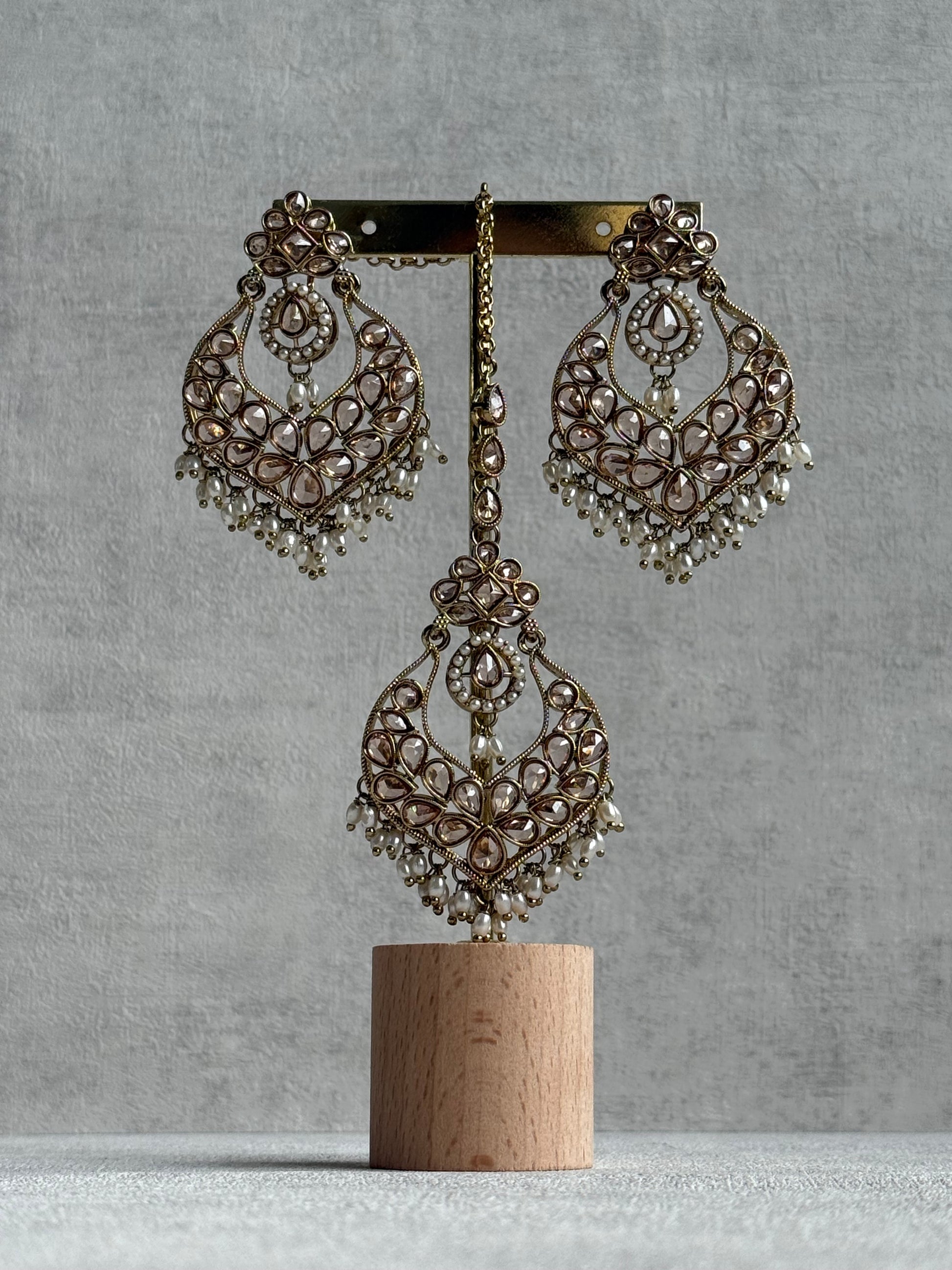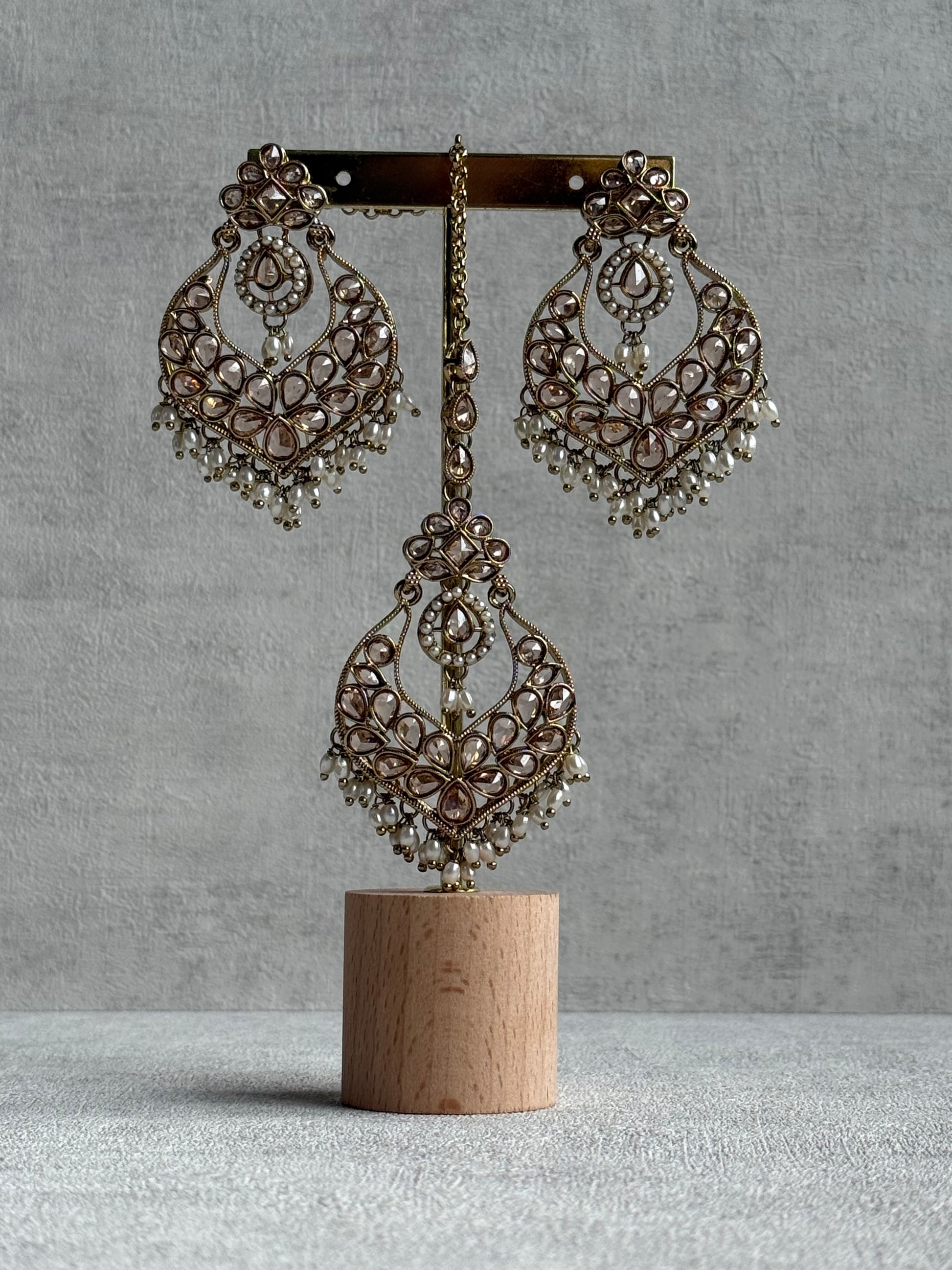 Each earring features teardrop-shaped kundan stones framed with delicate gold filigree and encircled by tiny pearls. The subtle shimmer of the champagne stones catches the light beautifully, while the layered pearl fringe adds a touch of traditional grace. The coordinated tikka completes the ensemble, echoing the same rich detailing and harmonious design.
