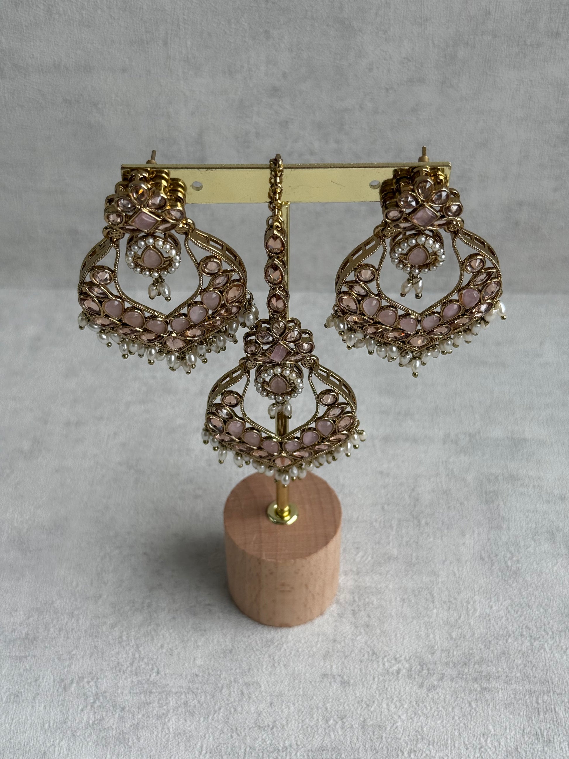 The Ayura Designs Damini Tikka Set – Mirror-Cut Kundan Earrings & Tikka with Blush Pink Enamel and Pearl Detailing radiates pure elegance with its soft pastel tones and intricate craftsmanship. Framed in antique gold, this exquisite set features glimmering mirror-cut kundan stones paired with delicate blush pink enamel that adds a feminine, romantic touch to its regal silhouette.