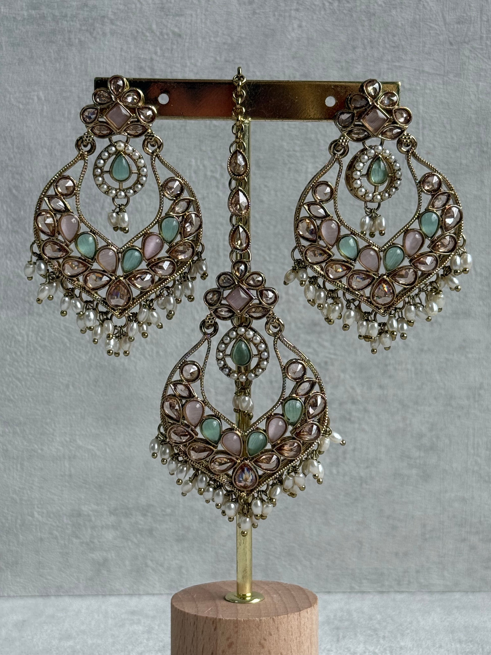 Ayura Designs Damini Tikka Set – Mirror-Cut Kundan Earrings & Tikka with Mint & Blush Enamel and Pearl Detailing