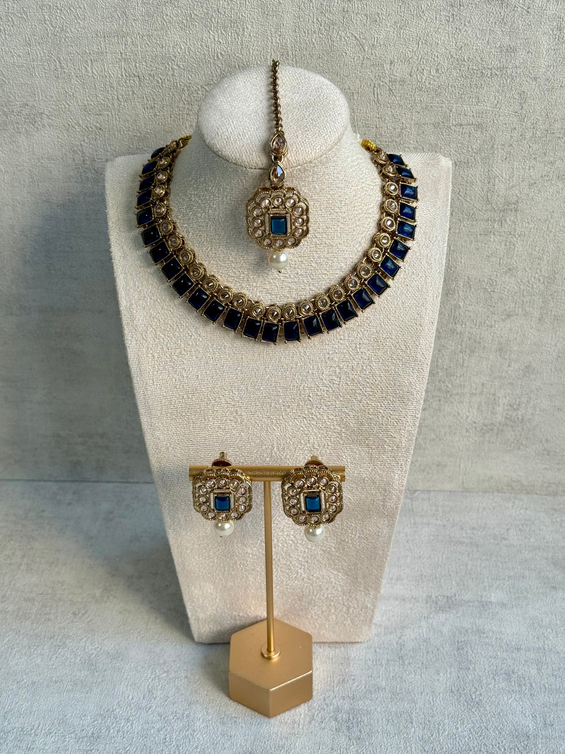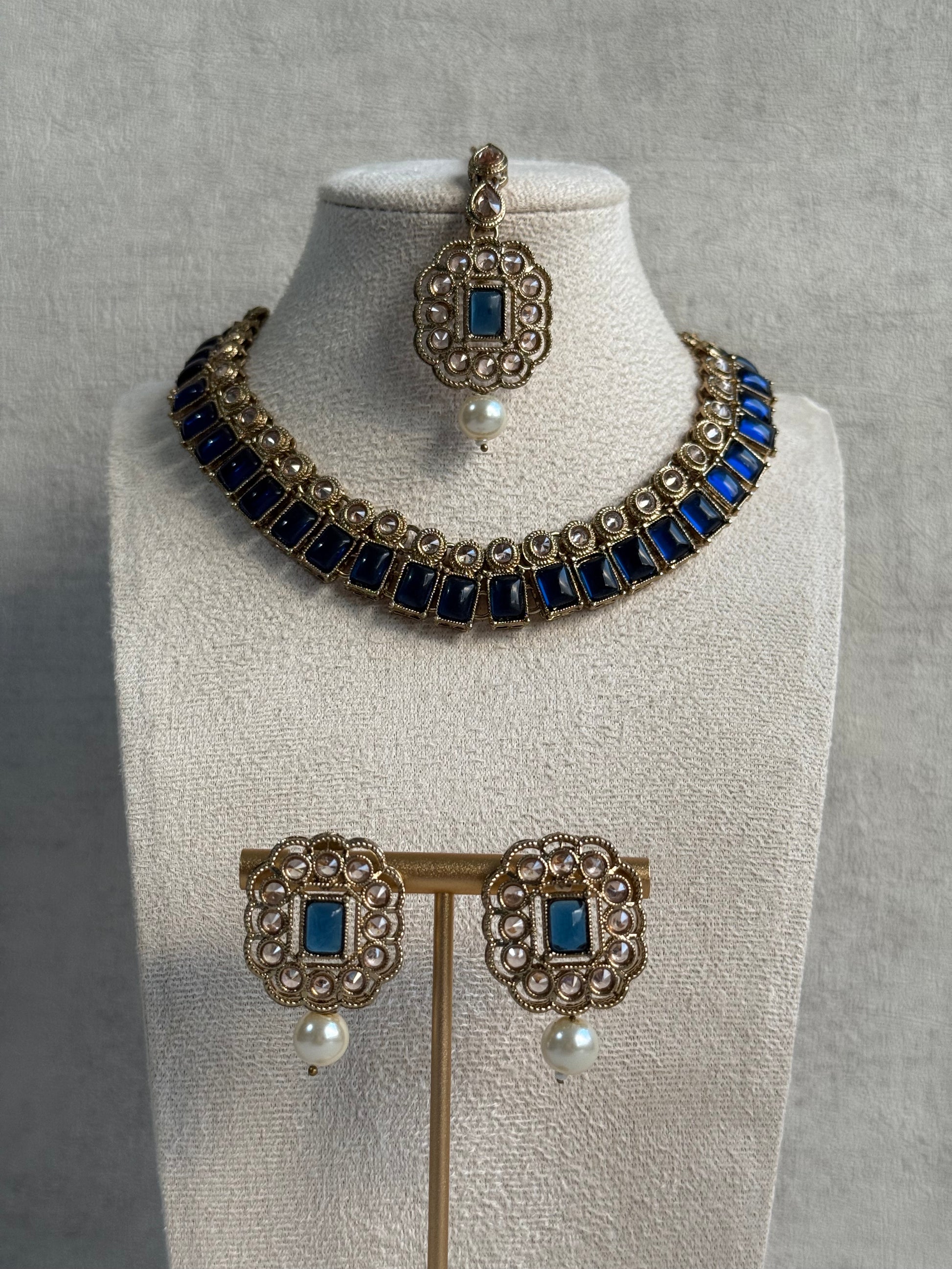 The Ayura Designs Dania Set with Necklace, Stud Earrings & Tikka is an ode to timeless sophistication. Crafted in an antique gold finish, this set features a captivating blend of midnight blue square-cut stones paired with luminous mirror-cut accents and soft pearl drops. The structured design of the necklace creates a regal silhouette around the neckline, with each rectangular stone meticulously bordered by kundan-style detailing that catches the light with every turn. A scalloped edge and intricate beading elevate the overall look, lending it an heirloom-inspired elegance with a bold modern twist.
