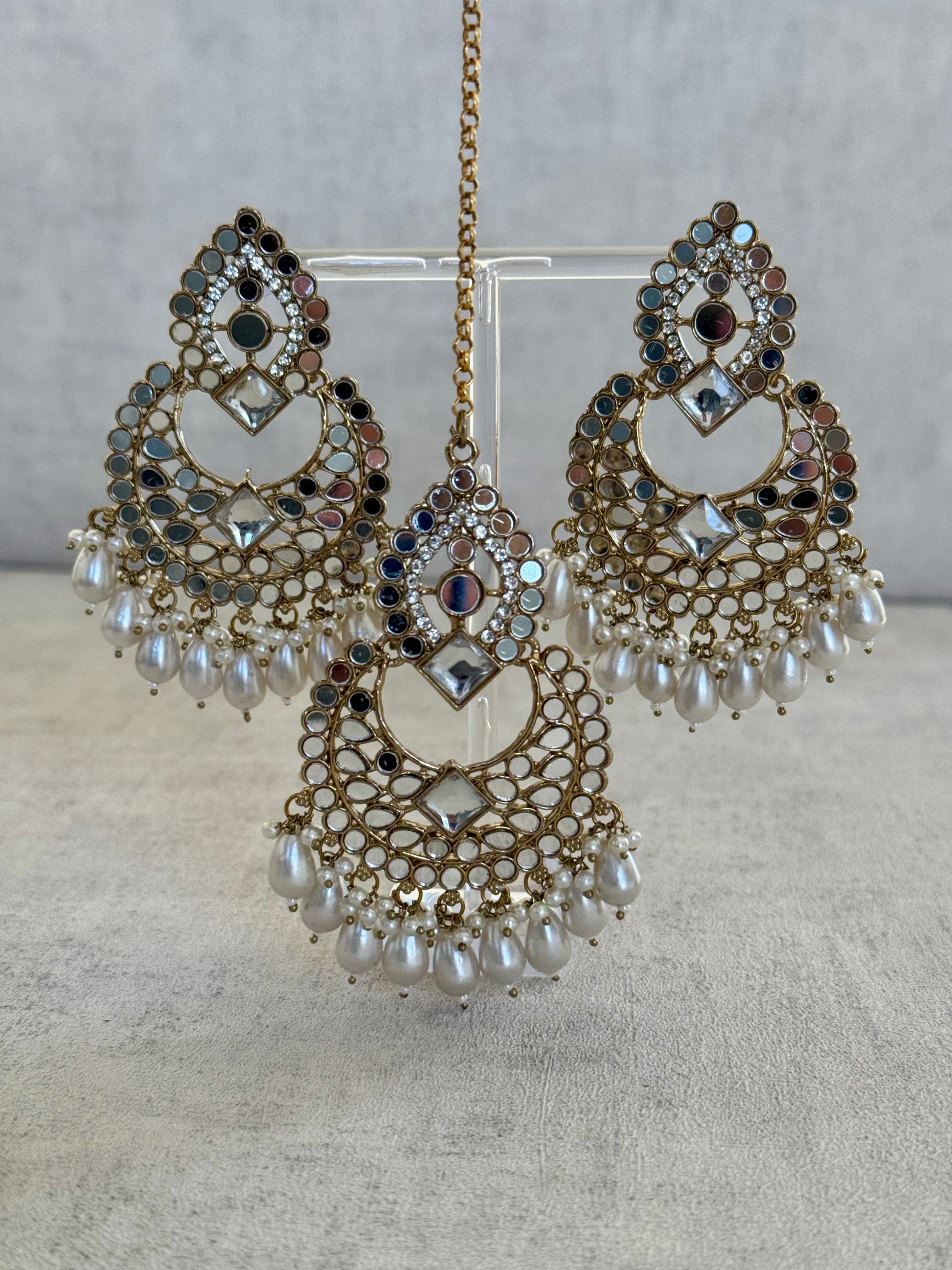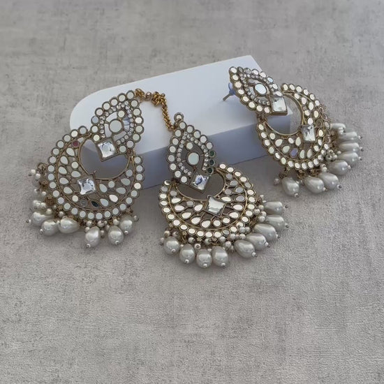 The Dilkash Tikka Set by Ayura Designs is a statement in refined grace and heritage artistry. Featuring a beautifully coordinated tikka and earrings, this set is adorned with intricate white meenakari detailing, radiant kundan stones, and eye-catching mirror work, all finished with cascading pearls that lend a soft, luxurious finish.