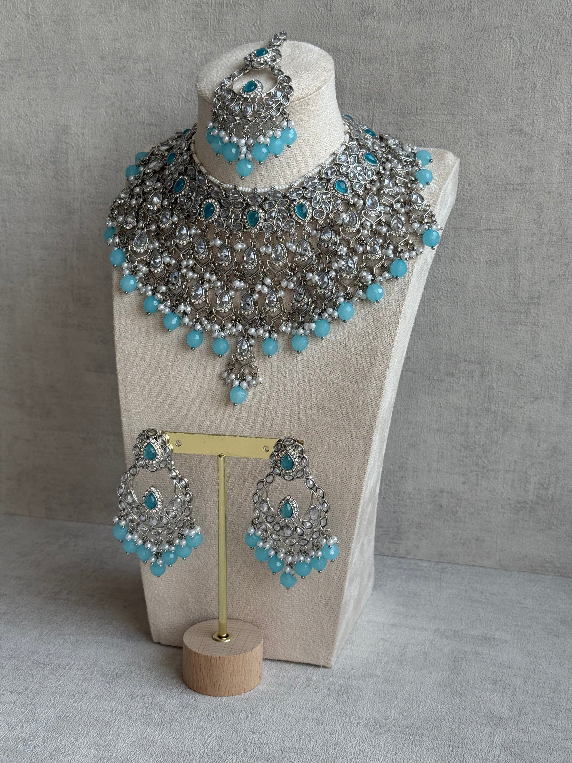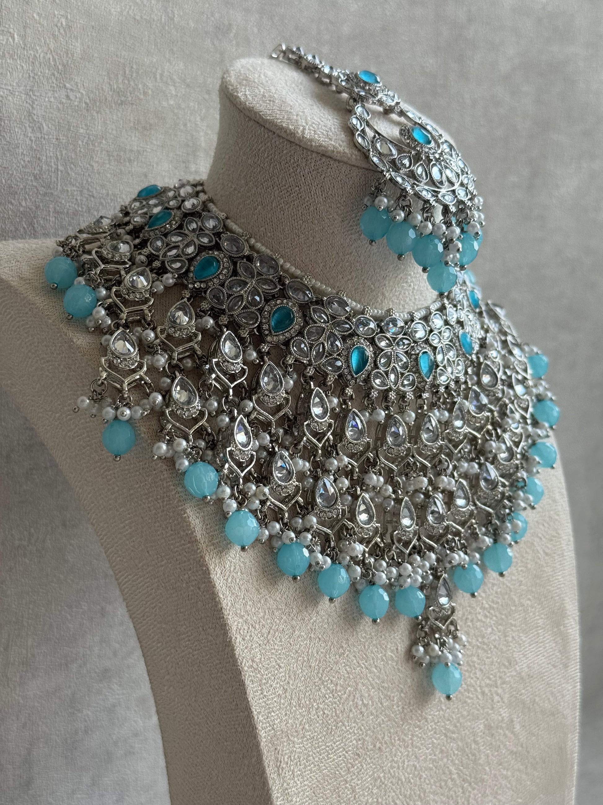 The choker-style necklace sits majestically along the neckline, with a cascading lattice of teardrop-shaped stones framed in intricate silverwork. Lustrous pearls are interwoven throughout, while aqua blue bead drops bring a subtle yet striking touch of colour. The coordinating tikka mirrors the same artistry, with a tiered design that adds a regal glimmer to the forehead. Together, they form an ensemble that feels timeless yet refreshingly modern — ideal for weddings, festive occasions, or elegant evening soirees.