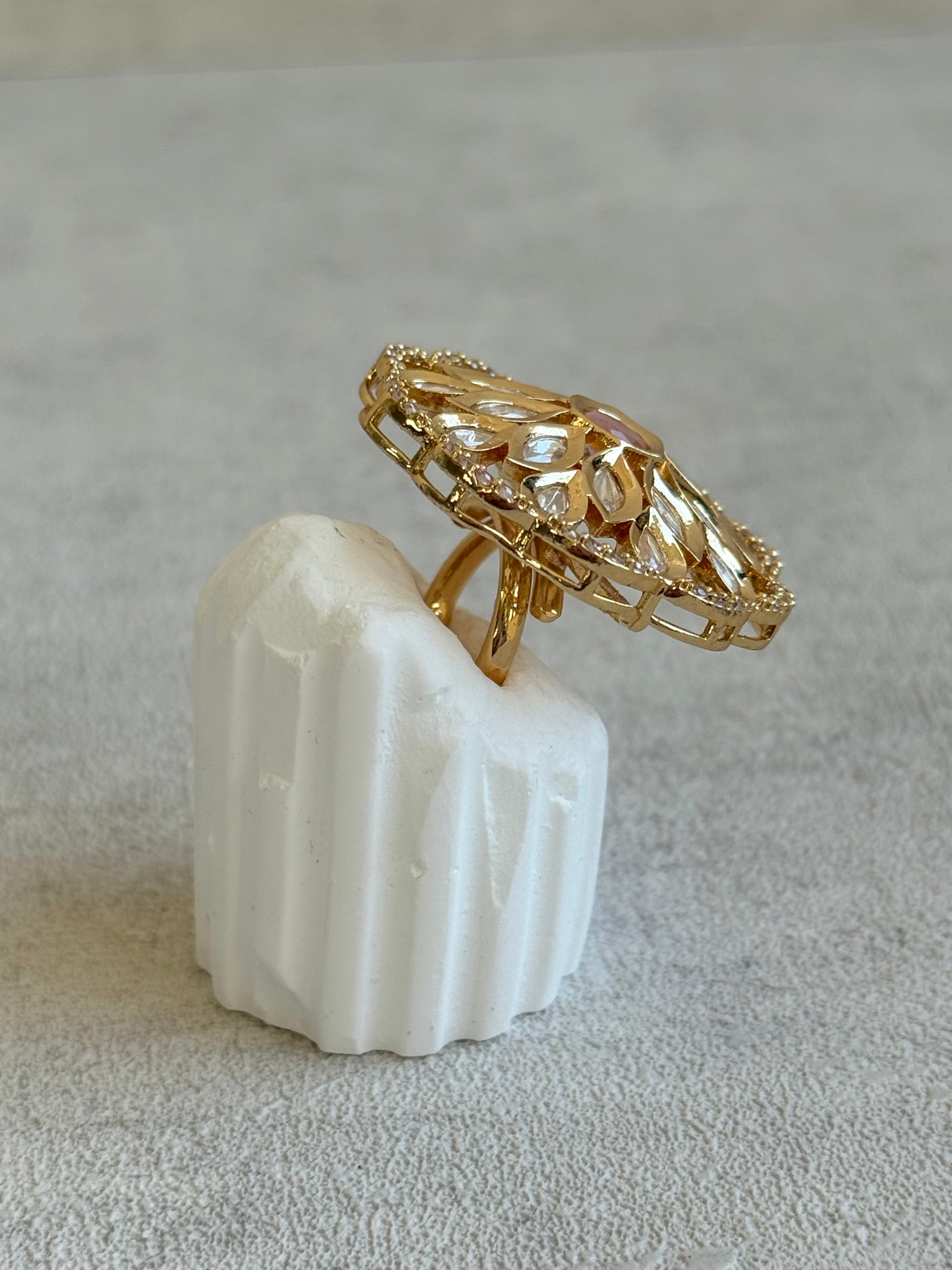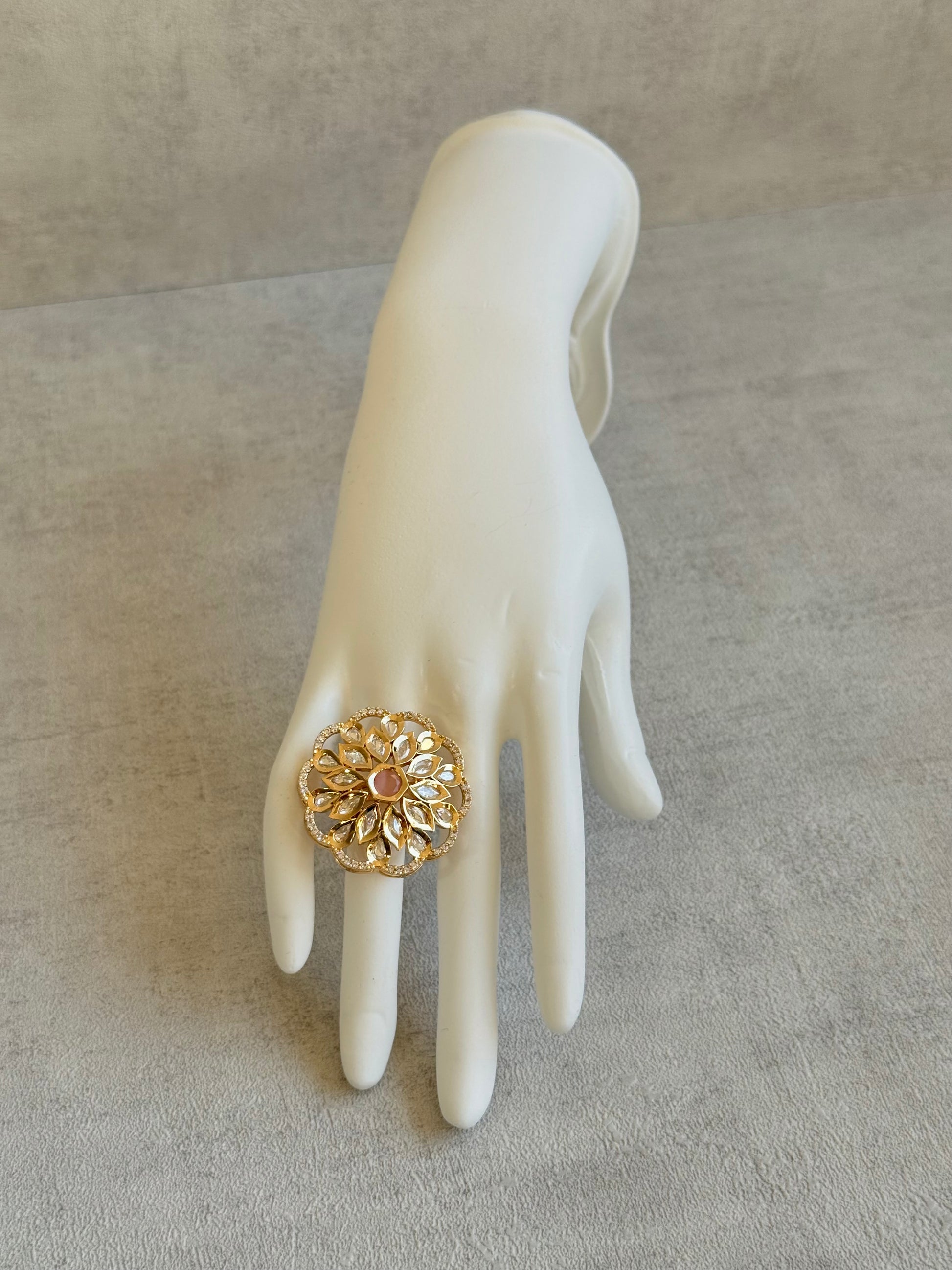 Ayura Designs Elisa Adjustable Ring – Moissanite Floral Ring with Blush Pink Centre & Crystal Border