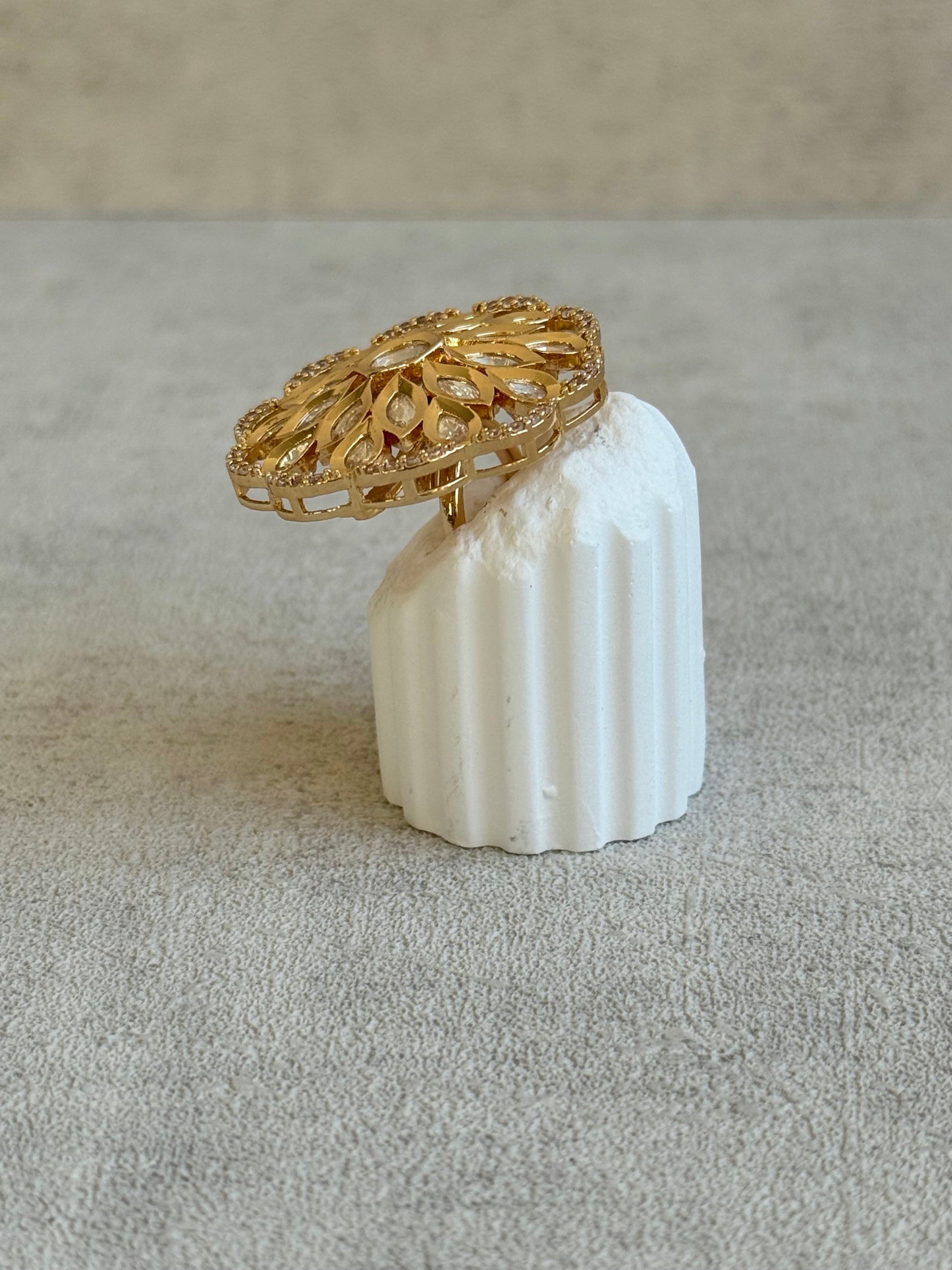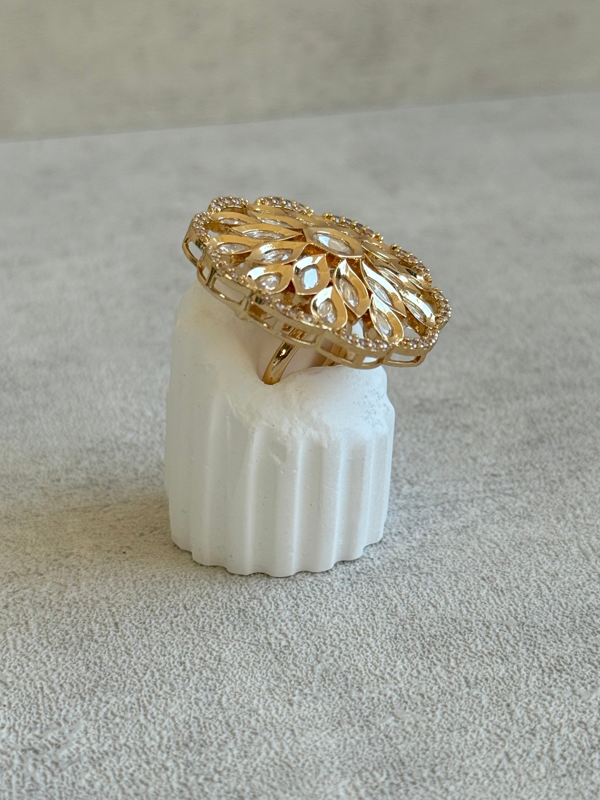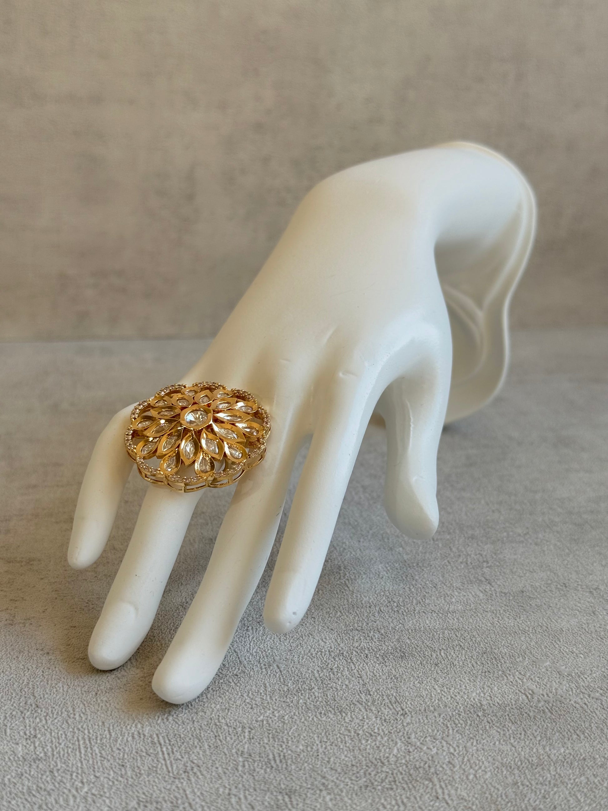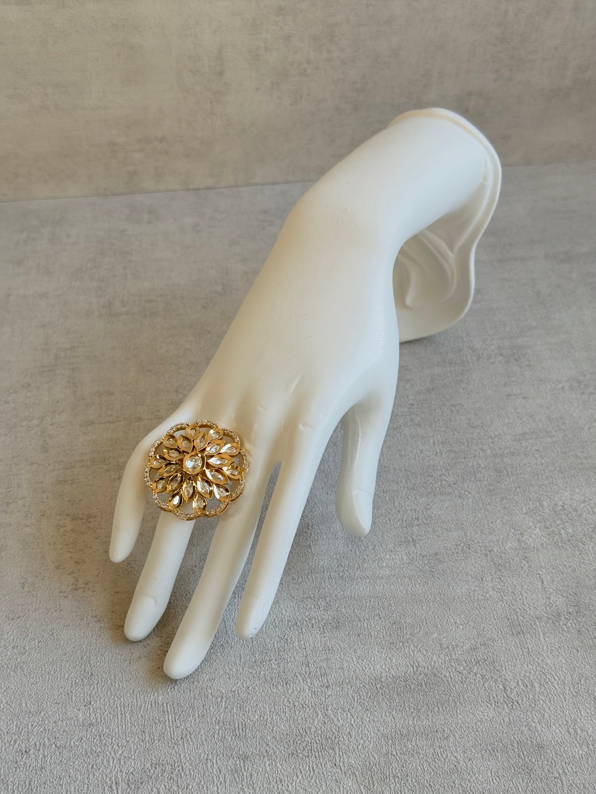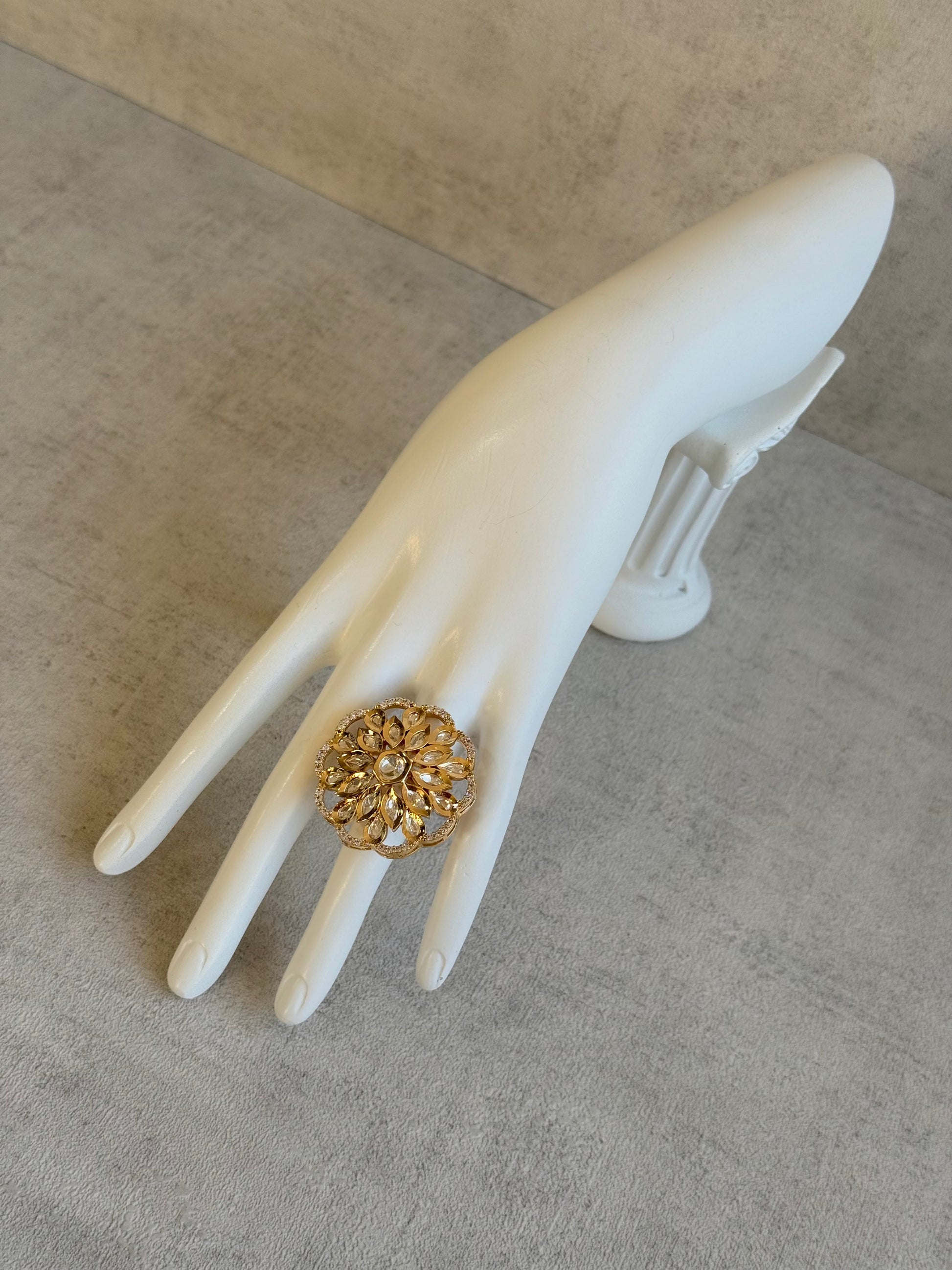 Ayura Designs Elisa Adjustable Ring – Moissanite Floral Ring with Clear Crystal Centre & Crystal Border