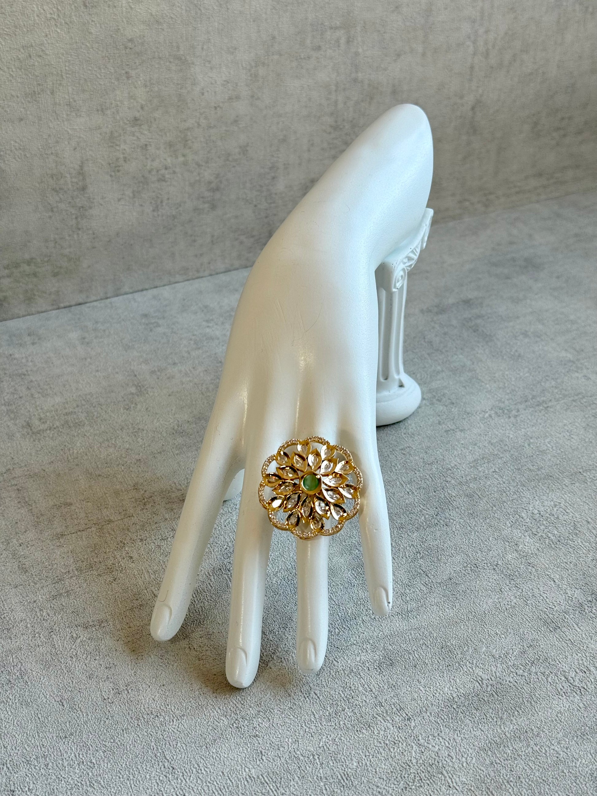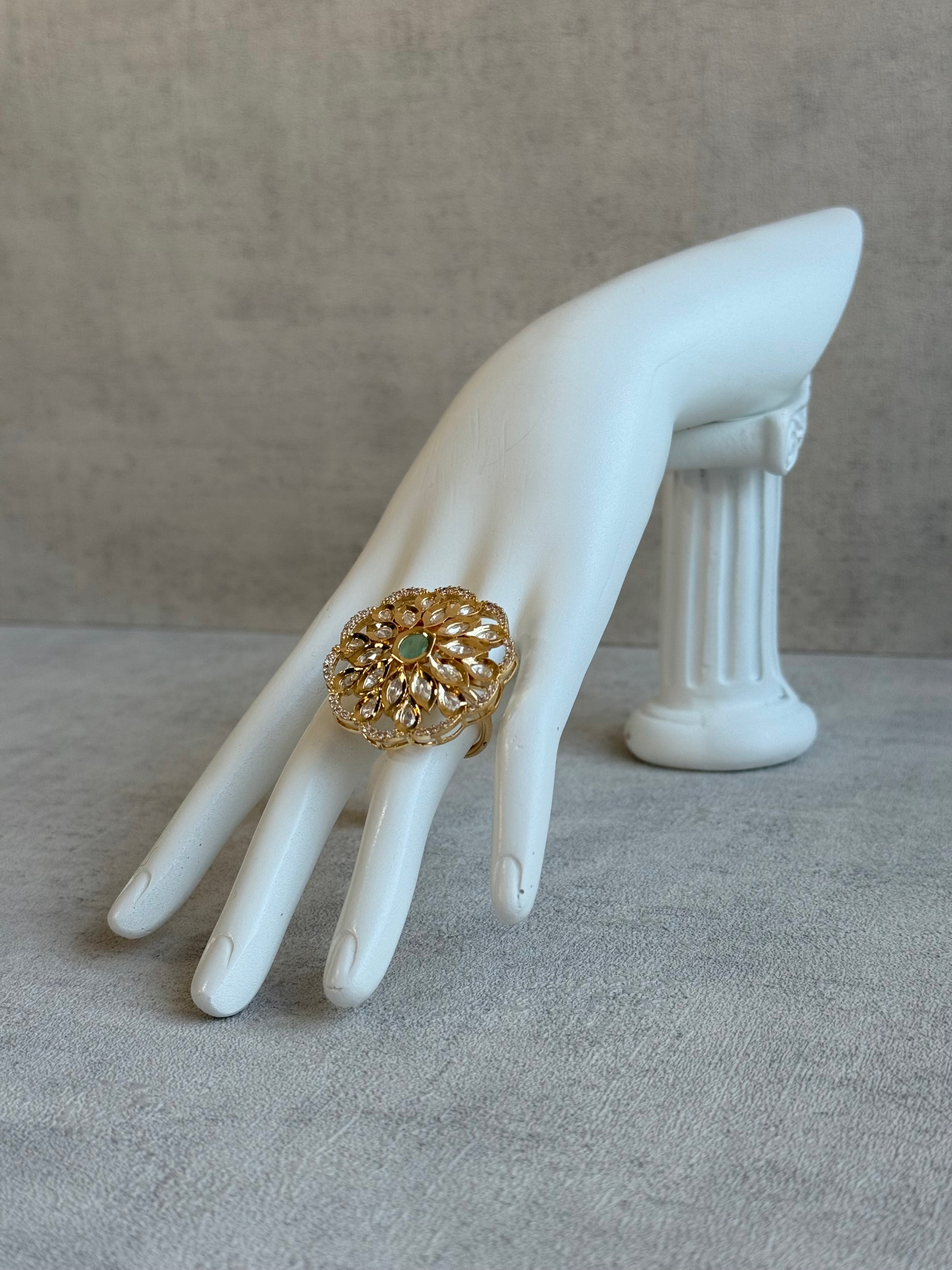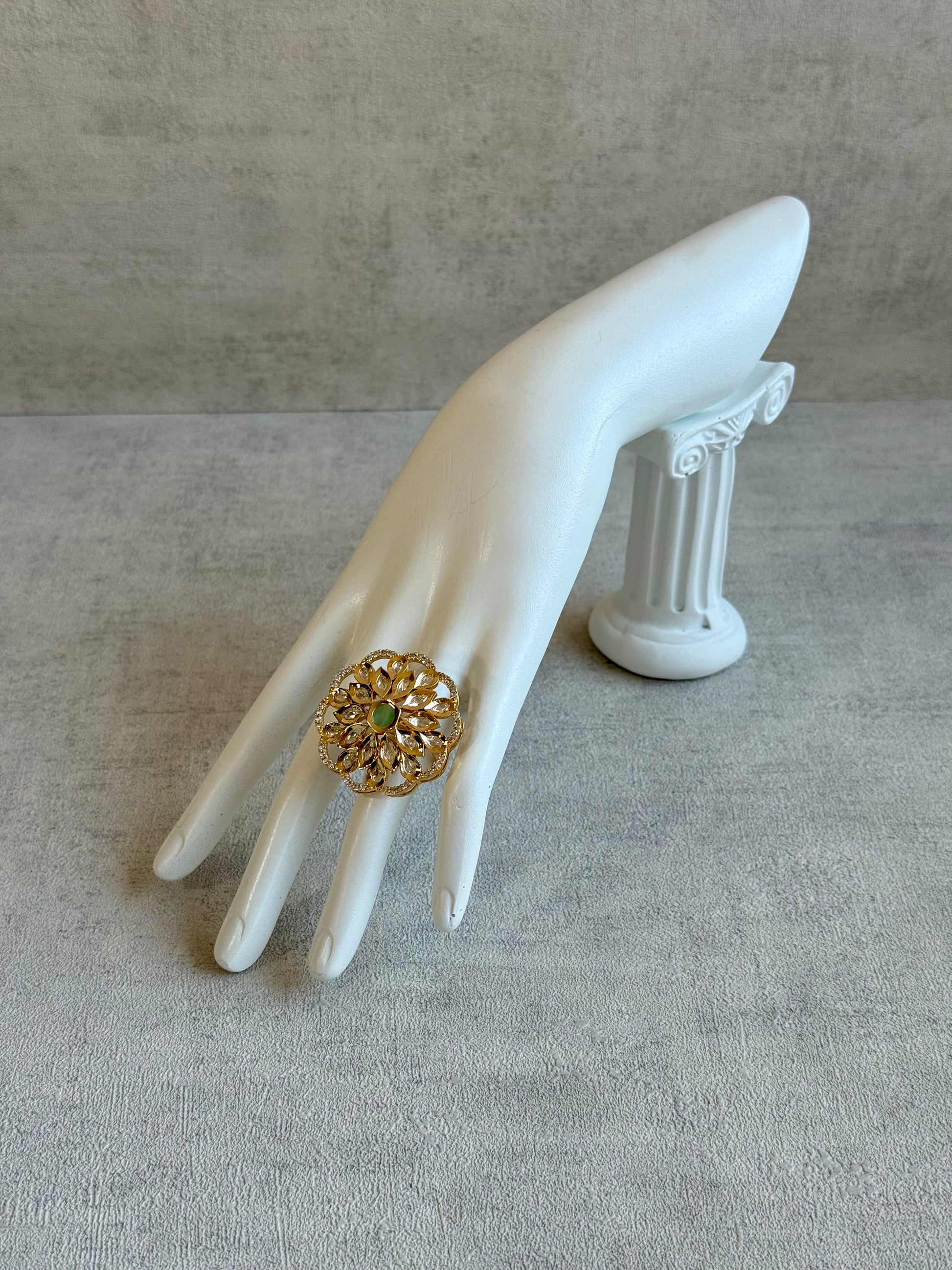Ayura Designs Elisa Adjustable Ring – Moissanite Floral Ring with Mint Green Centre & Crystal Border