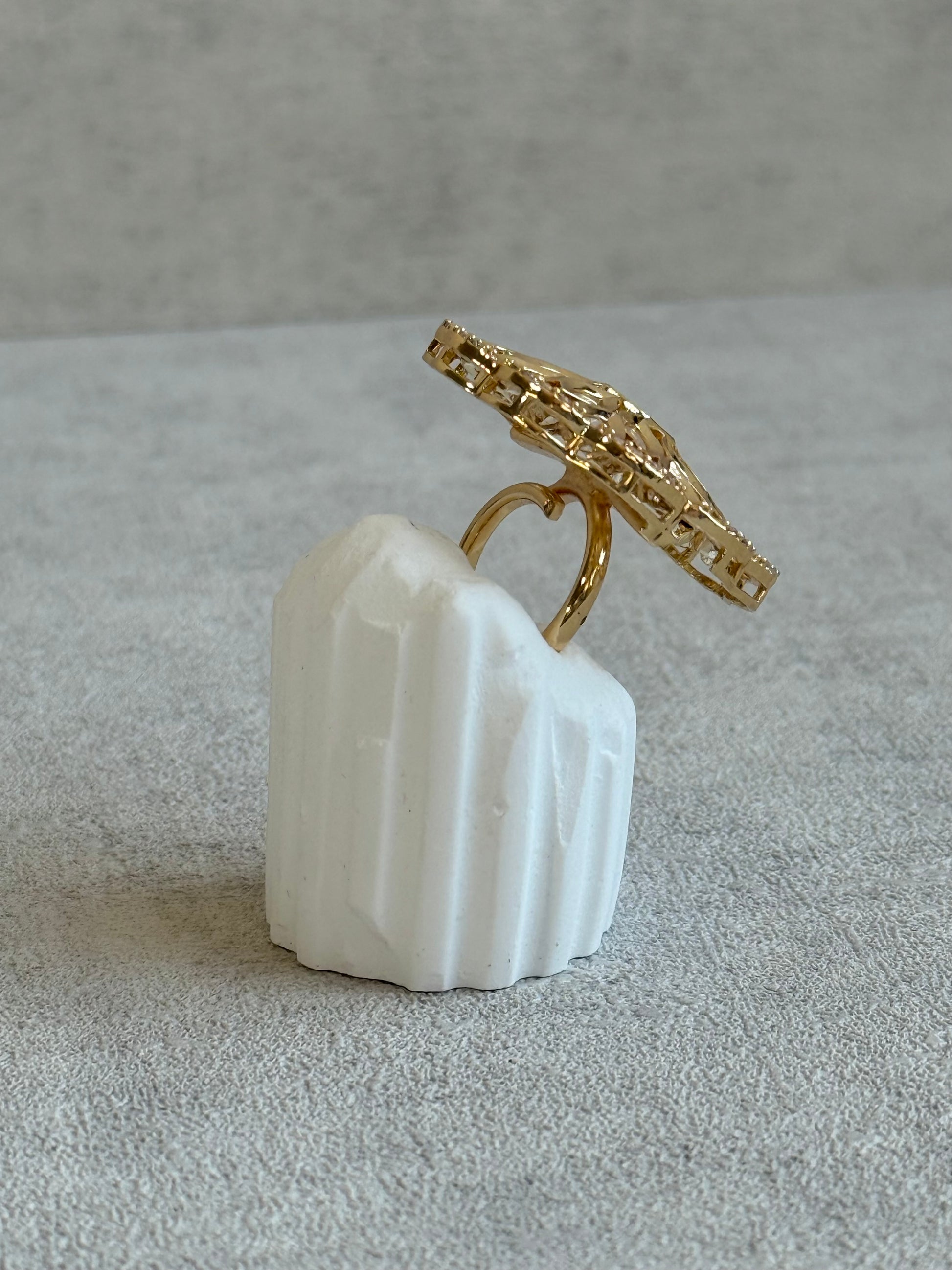 Despite its striking size, the ring feels featherlight and is fitted with an adjustable band to ensure a secure, comfortable fit on any finger.