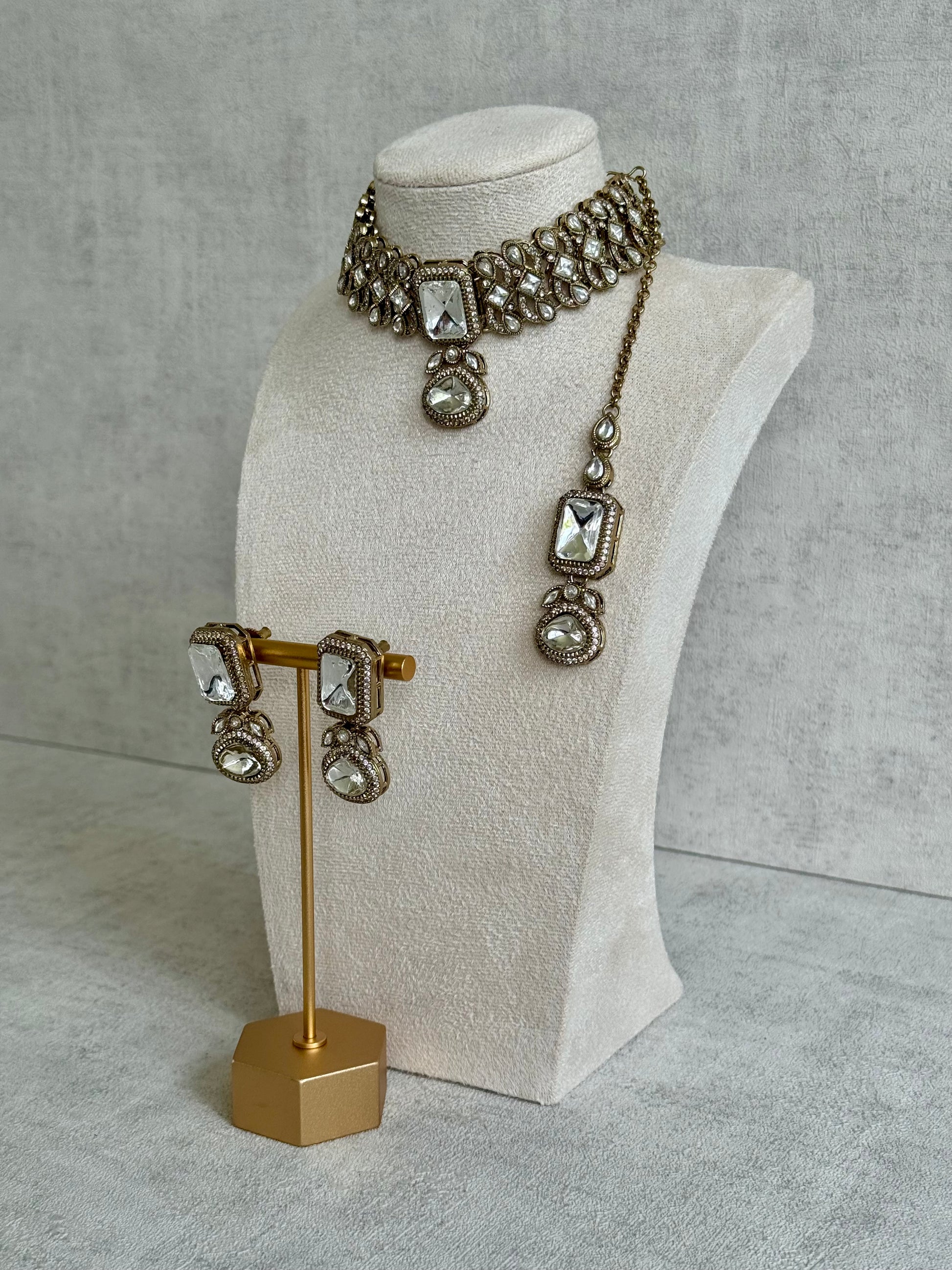 Introducing the Ayura Designs Ella Choker Set with Tikka & Earrings – a timeless symphony of elegance and edge. This showstopping trio features a regal choker with antique gold detailing, glimmering mirror-cut stones, and a bold centrepiece drop that commands attention. Framed with intricate latticework and bordered by fine crystals, the Ella choker is designed to frame your neckline in unapologetic glamour.